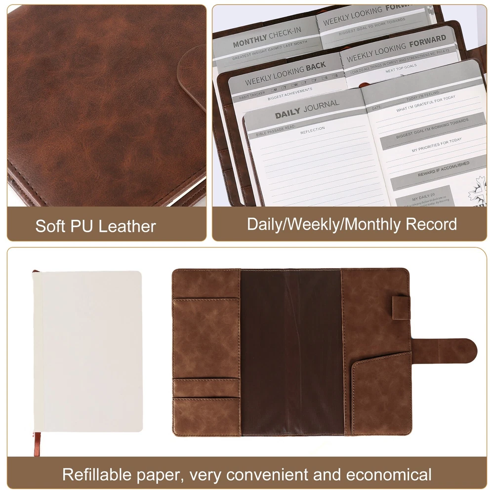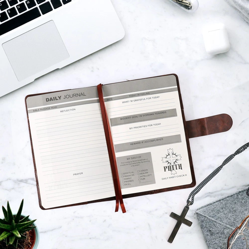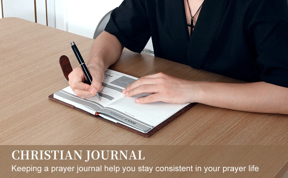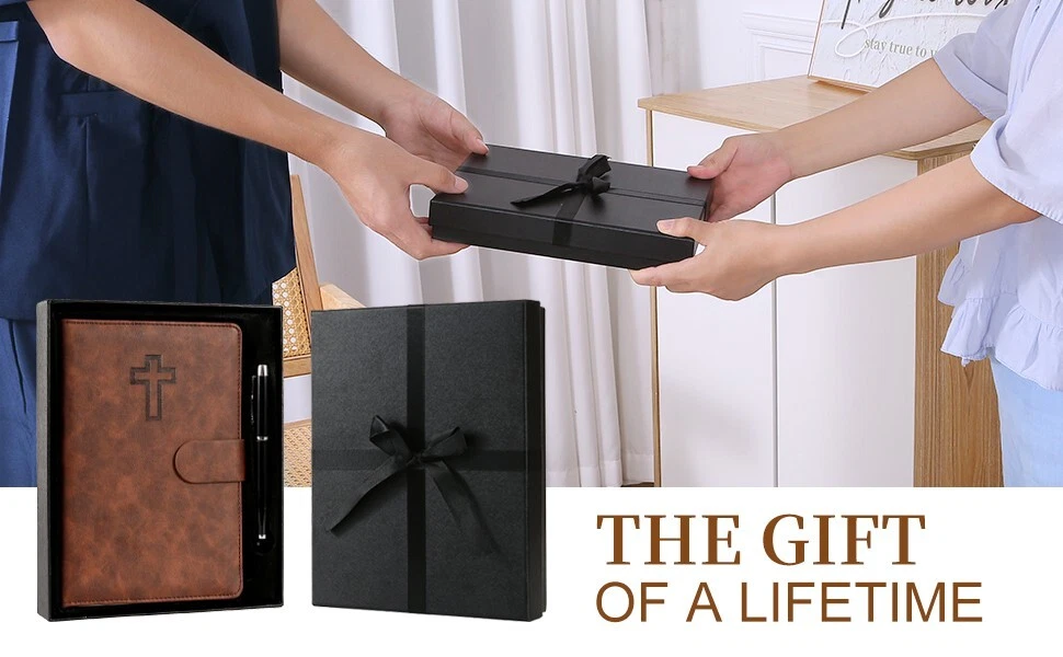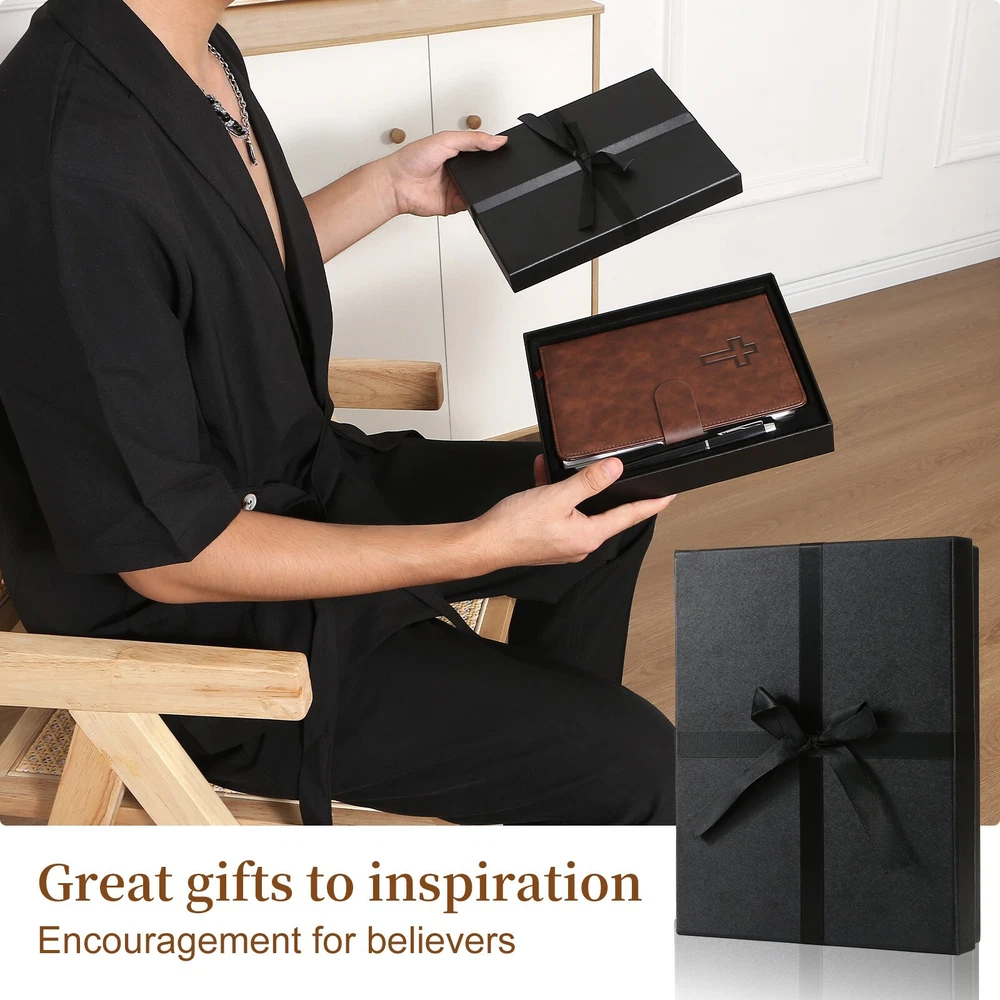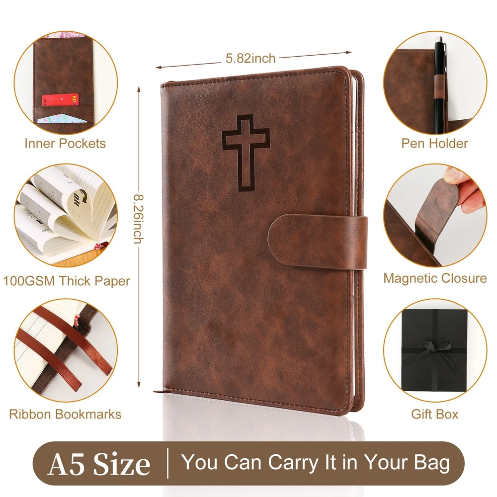 Bible Prayer Journal For Men with Faux Leather, Bible Study Scripture Notebook & Christian Planner, Christian Gifts for Men, Devotional Journal and Church Notes IGNITE YOUR SPIRITUAL JOURNEY - Feeling stuck in your spiritual routine? Our Christian Motivational & Inspiration Journal revitalizes your faith with meaningful insights and wisdom. This isn't just a journal—it's your dialogue with God, guiding you to a deeper spiritual life and greater gratitude. BUILT FOR EVERYDAY FAITH - Whether it's sunny or rainy, our resistant vegan leather journal stands up to the test. Reflect the strength of your faith with a journal that is both resilient and portable, becoming a daily companion in your spiritual journey. A TREASURED GIFT - Picture the delight on their face when they receive this beautifully packaged journal! Presented in an elegant black box with a ribbon, it's more than a gift—it's a heartfelt invitation to connect with God. Ideal for Christmas, birthdays, or any occasion to show you care. YOUR SAFE HAVEN - Your spiritual reflections deserve the utmost privacy. Our journal features a secure magnetic closure to keep your thoughts and prayers confidential. Additionally, inner pockets help you organize and protect cherished keepsakes and mementos. WRITING MADE EASY - Perfectly sized at 8.5" L x 5.5" W, our journal offers a comfortable writing experience. With 214 pages filled with inspirational prompts and Biblical verses, it provides ample space for capturing your spiritual journey and reflections. Search Term: Bile journal,prayer journal, bible study notebook, christan journal planner,christian gifts, bible journaling kit, bible journaling supplies,church notebook, devotional journal,pastor gifts for men, christian journal