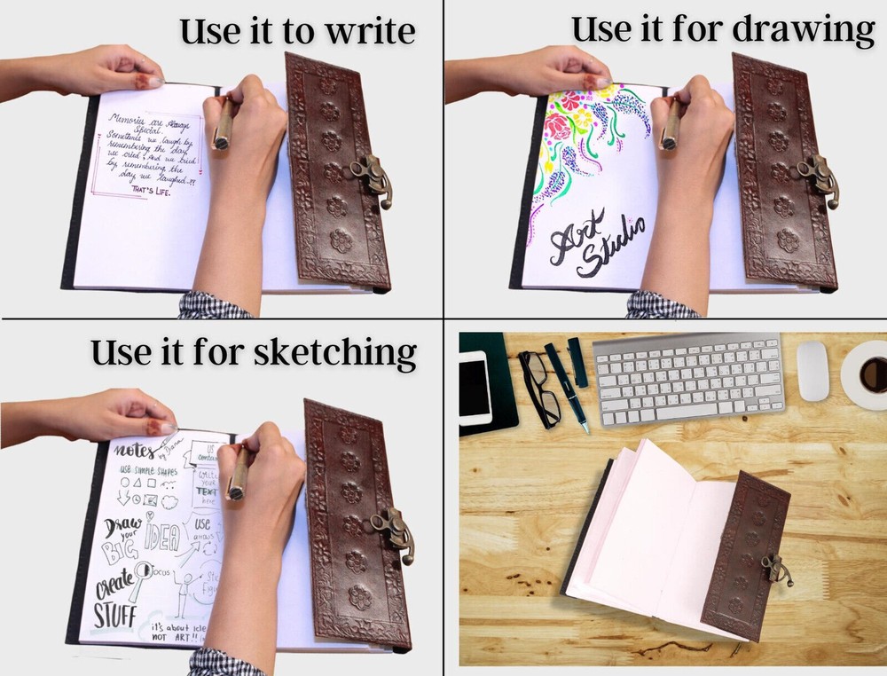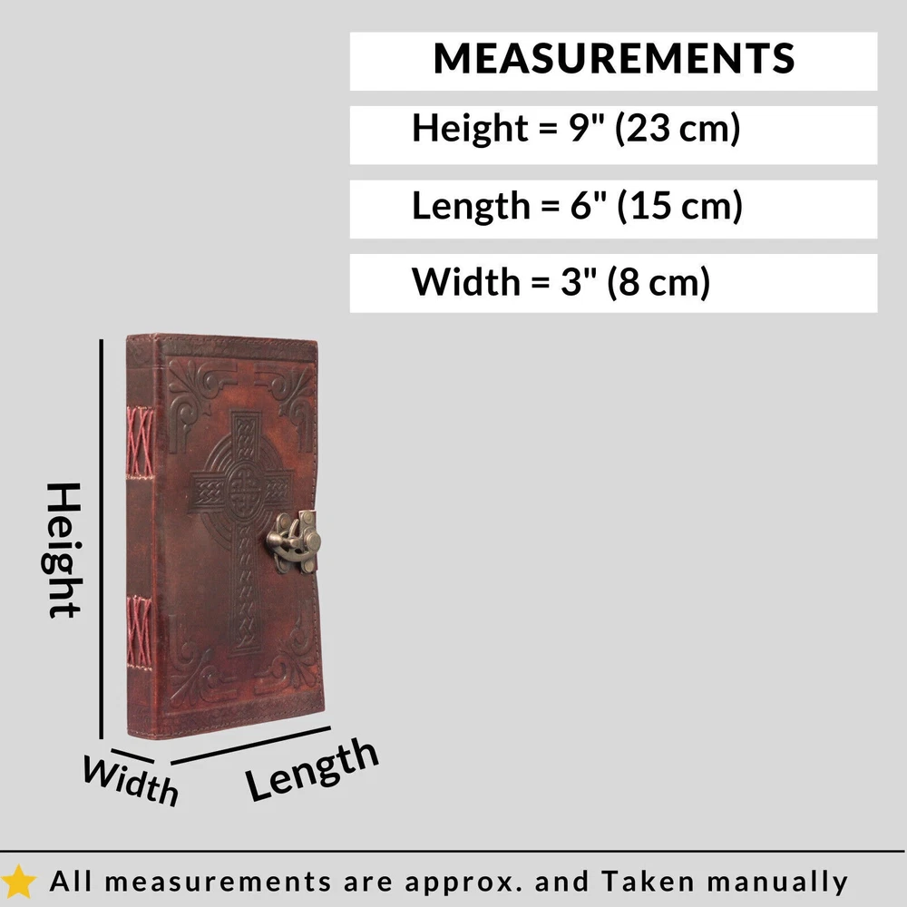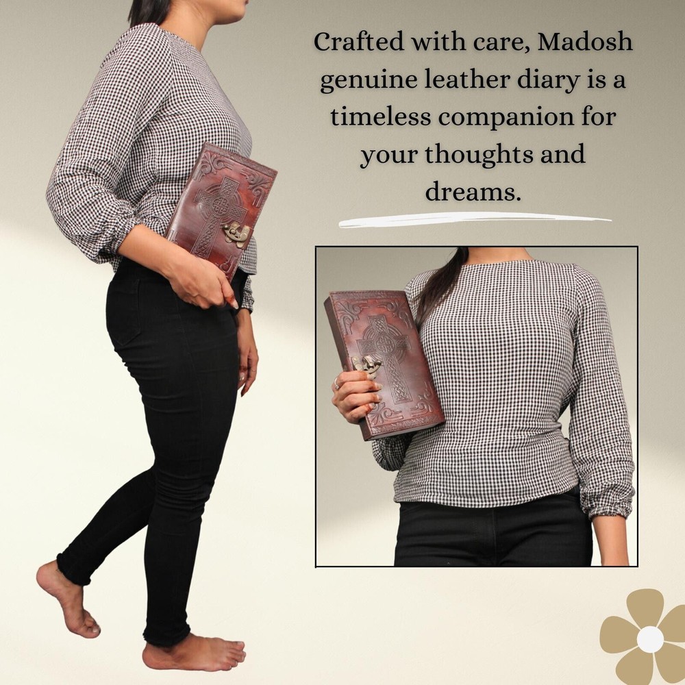 Welcome To Mad Over Shopping TM (Brand: Madosh-Mad Over Shopping) Experience the tranquillity of the Sacred Serenity Leather Diary, where the delicate and elegant embossed cross graces the cover, creating a spiritual haven for your deepest thoughts and prayers. Meticulously handcrafted from genuine leather, this diary transcends the ordinary, offering a sanctuary for your soul. The elegant cross design serves as a timeless symbol of grace and spirituality, turning each page into a canvas for your reflections and prayers. With 200 unlined pages made from high-quality, acid-free paper, this diary provides a serene backdrop for your thoughts and creative expressions. Perfect for daily reflections, prayer journaling, or as a thoughtful gift for those on a spiritual journey, this diary is a versatile companion. Compact and lightweight, it's designed to be with you wherever you go, capturing the essence of your sacred moments. ORDER YOURS NOW! SIZE: Height: 9“(23 cm) | Length: 6“(15 cm) | Width: 3“(8 cm) SPECIFICATIONS: Genuine full-grain leather Handmade Clasp closure Cross embossed Country of origin: India 200 Page NOTE: 100% Genuine leather diary. Color may slightly vary from pictures. 100% recycled cotton acid free paper.