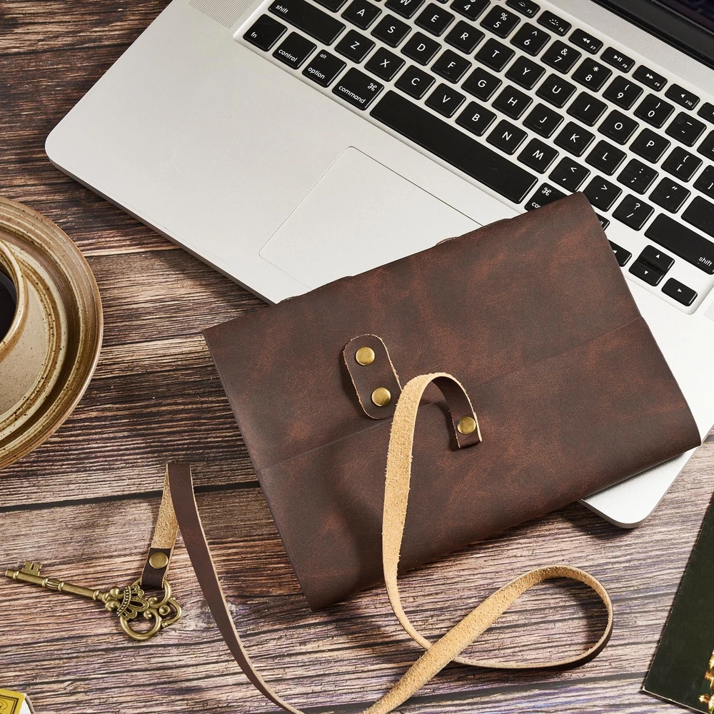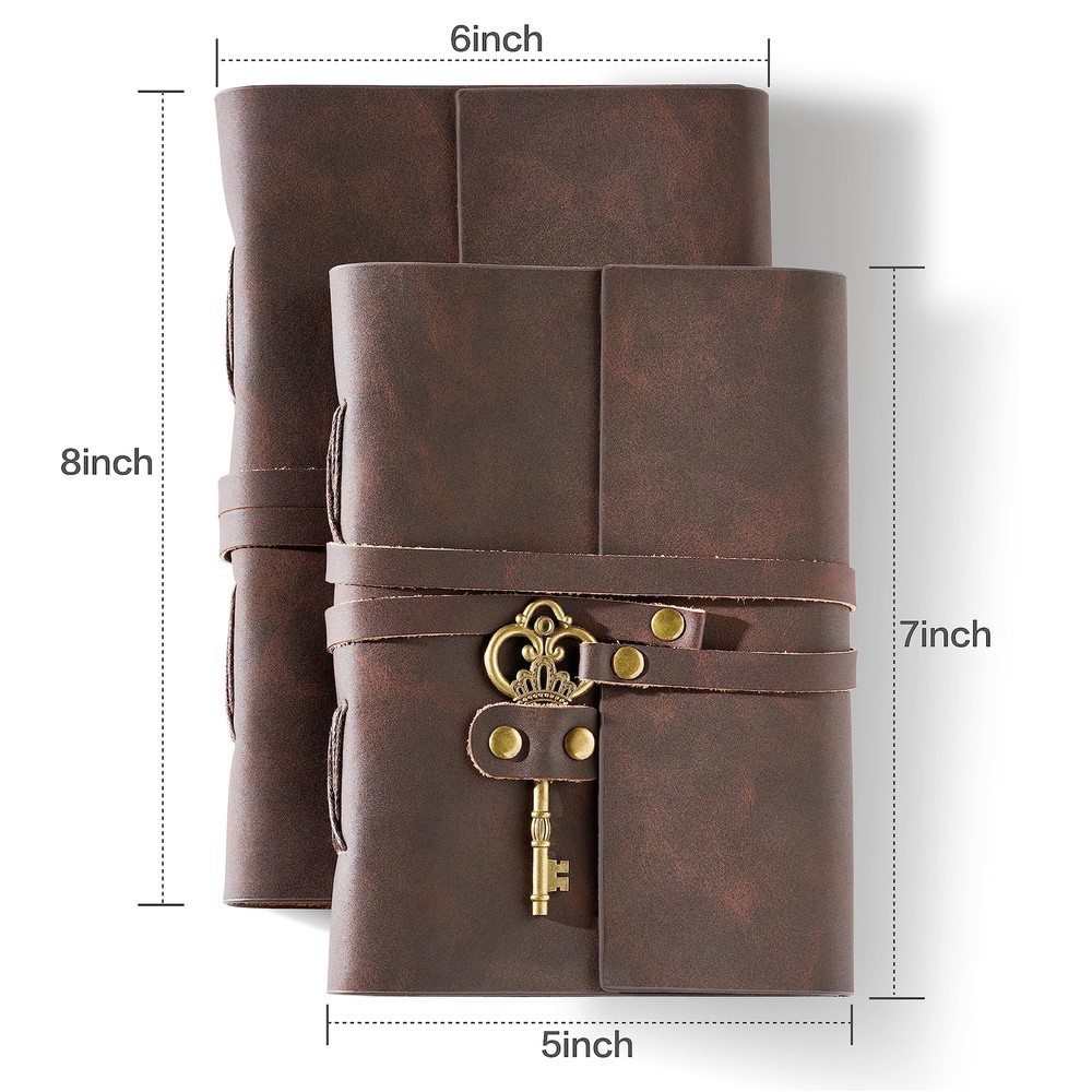Leather Journal 5"x 7" Genuine Leather Journaling Notebook with Key - 200 Line Pages Handmade Leather Bound Journal for Diary Travelling (Vintage Brown) Product Details Color: Vintage Brown Size: 5"x 7" Brand: Cleather MPN: Brown UPC: 716035347484 EAN: 0716035347484 Brand: Cleather Color: Vintage Brown Theme: Book Sheet Size: 5-x-8-inch inches Pages: 200 Cover Material: Leather Style: Vintage Ruling Type: Ruled Special Feature: Lock Number of Items: 1 Manufacturer: Cleather Brand: Cleather Item Weight: 14.4 ounces Product Dimensions: 7 x 5 x 2 inches Item model number: Brown Color: Vintage Brown Cover Material: Leather Number of Items: 1 Size: 5"x 7" Ruling: Ruled Sheet Size: 5-x-8-inch inches Manufacturer Part Number: 23ClEAKYS Date First Available: May 17, 2023 Elegant and Functional: Our premium distressed journal, complete with a soft touch, genuine leather tie, and a key, adds old-world charm. Perfect for stylish men and women on the go, keeping track of daily to-do lists with ease and security. Perfectly Sized for Convenience: Embrace the handheld ideal with our compact 5"7" leather journal notebook, designed for effortless portability. Slip it into your bag and take it wherever life leads you. With 200 pages/100 sheets of smooth kraft paper, it's your canvas to capture both the everyday moments and the most exotic adventures in life. Seamless Versatility: Our leather journal is more than just a place to record your life and thoughts. Embrace its multiuse design as an artist's sketchbook, food diary, recipe notebook, rustic diary, daily notepad, vintage planner, or ledger book. With effortless elegance, it adapts to your every need, enriching your experiences on every page. Thoughtful & Timeless: Our rustic distressed leather journaling notebooks are heartwarming gifts for loved ones on Teacher's Day, Thanksgiving, Christmas, birthdays, or graduation. Its timeless beauty and practicality make it an ideal choice for men, women, moms, dads, brothers, sisters, colleagues, and more. Show your appreciation with this cherished keepsake. Tailored to You: Discover the Cleather leather notebooks in 2 sizes (5x7 in, 6x8 in) , catering to your preferences. We're here to assist you every step of the way if you have questions.