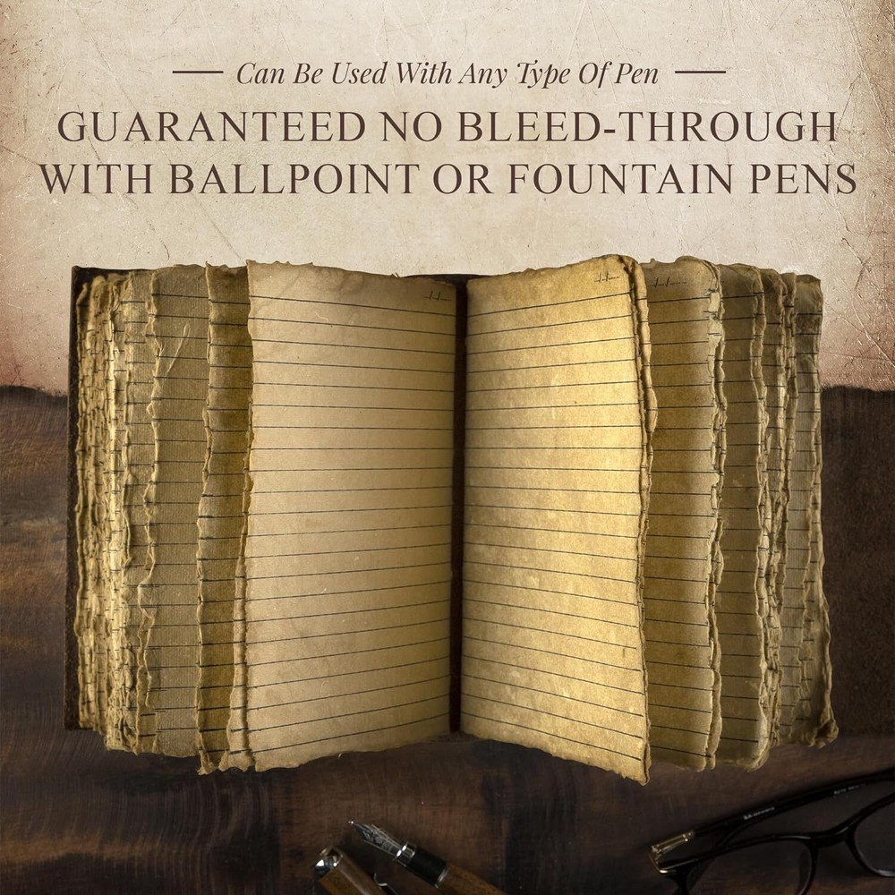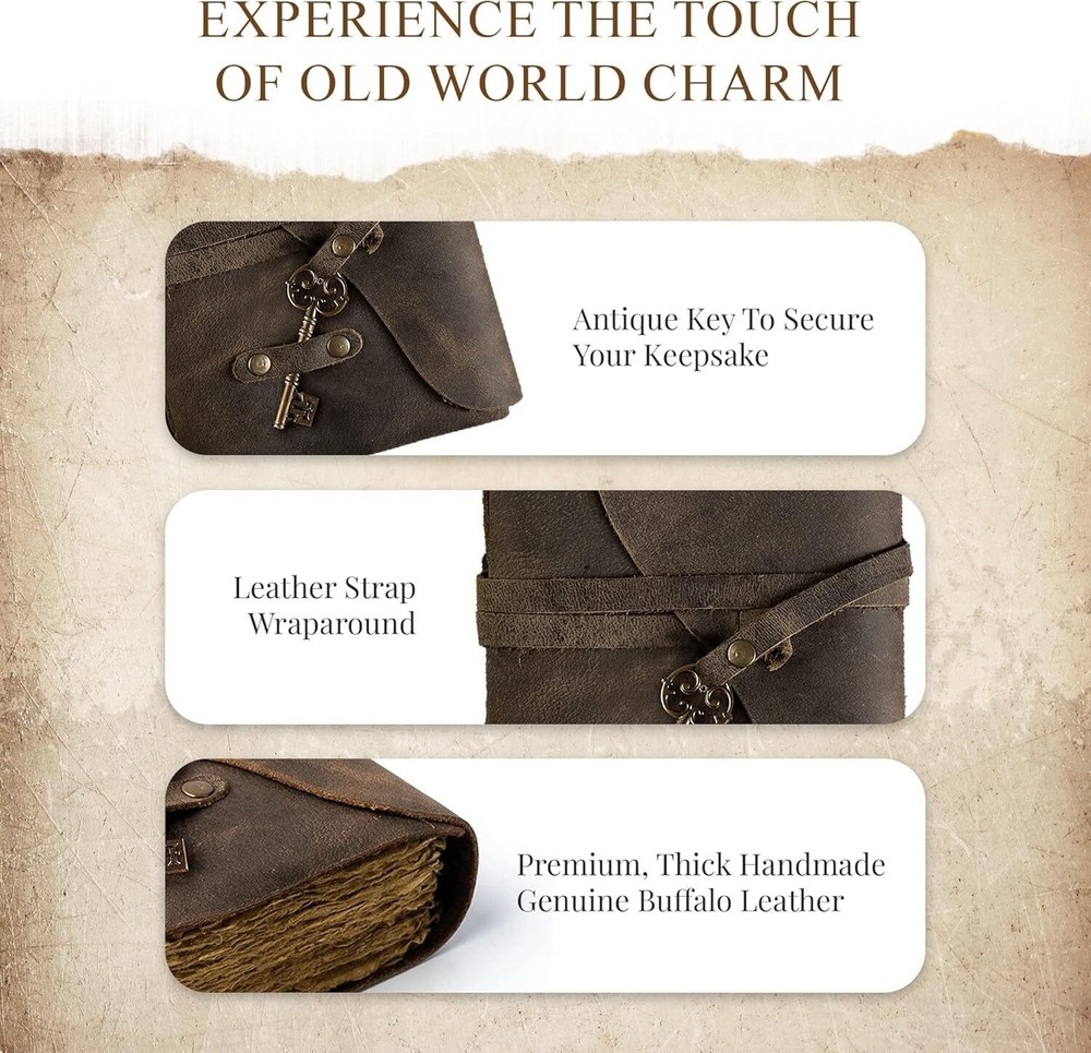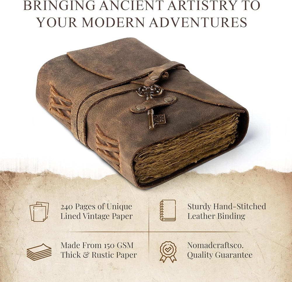 About this item Handmade Vintage Paper - This Vintage Leather Journal is handmade with 240 lined pages that are crafted to look like antique paper, giving it the appearance of a treasured item from a historic library. Use Any Kind of Pen - Despite its vintage look, you can use all kinds of pens on this journal, from standard fountain pens to ballpoint pens, allowing flexible writing options. Stylishly Medieval - The combination of ancient-looking rustic cotton paper and distressed leather, hand-stitched by artisans, creates a timeless keepsake. It makes a thoughtful gift for men, women, and anyone who appreciates vintage style. Strong & Sturdy Binding, Leather Wraparound and Key - The journal features durable hand-stitched binding ensuring that pages stay intact. A leather wraparound with a key closure keeps your notes safe and secure. Dimensions: 9 x 6 x 2.5 inches