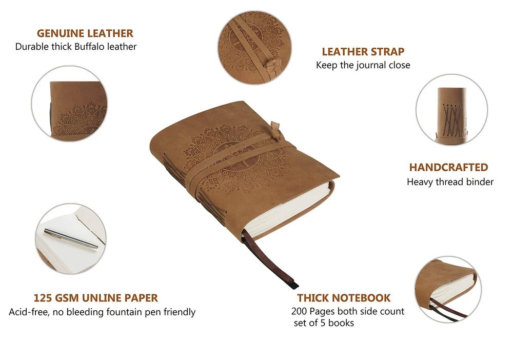 Leather Journal Mandala Engraved Leather Bound Writing Journal for Women & Men Unlined Journals for Women | Leather Bound Notebook Unruled Journal & Diary (Mandala & Tree) Welcome to MY STORE No Extra Charge Flat Rate Shipping 24/7 Support Always Able to Help eBay Payment We Accept eBay Payments Method Fast Delivery We Process & Deliver on Time Leather Journal Mandala Engraved Leather Bound Writing Journal for Women & Men Unlined Journals for Women | Leather Bound Notebook Unruled Journal & Diary (Mandala & Tree) Product Description All our journals are handcrafted and are complemented with a beautiful Mandala engraved design. The rustic finish can accompany you in all your travels or as a daily companion to capture your thoughts. Product Features ✔️ PERFECT HANDCRAFT JOURNAL - Handcrafted from genuine top grain leather: Each journal is specially designed and handmade from premium top grain leather. The artful design and hand stitching to create a timeless space for your thoughts ✔️ Dimension – (7” X 5.5” X 1”) With unlined plain Paper, Easily Handle Notebook, You Can with Minimum Space, Easily Handle in Long Journey. Once You Have Used It You Will Feel You Have the Journal in the World.Note: page count is 150 pages, 75 sheets ✔️ Use Any Kind Of Pen - Write/sketch/doodle on your journal notebook with a Fountain Pen CalligraphyPen, Ball Pen, Brush Pen, Acrylic Colours, Watercolor. IDEAL USE AND PERFECT GIFT – Perfect Use for Business Executive, Poetry Work, Journalists, Craftsman, Writer. A Lovely Treat for Your Loved Ones for An Anniversary, Birthday or Graduation Present, Or for Someone Starting A New Adventure and A Perfect Gift for Those Who Love Vintage One. ✔️ mandala & Bird EMBOSS DESIGN - Perfectly embossed with the mandala and Bird designs, this journal makes a thoughtful gift to anyone of different cultures. The Tree symbolizes firmness, nature, and while mandala tree represents freedom, beauty, and nurturing. ✔️ OUR GUARANTEE: If for any reason you don’t love the Wanderings vintage notebooks please let us know and we’ll send you a - no questions asked. It is as simple as that! Shipping We do not ship to a different address. We will ship to the address you provide on eBay only. Please check your address before purchase. Fast shipping is very important for us. It should take 3-5 business days for the product to reach your destination. If it takes any longer than that, please do not hesitate to contact us to resolve the issues. Returns All our products come with a 30-Day Return Policy. If you would like to return your item and you are within 30 days of the purchase If you are not 100% satisfied, please let us know the Detailed Problem,We will give you a 100% satisfactory solution. If you received an incorrect, damaged, defective, or item not as described, contact us for a partial/full refund or replacement on our cost. Free Shipping and Free Return 30-Days Money Back Guarantee. Payment We accept eBay payments such as PayPal, Google Pay, Visa, MasterCard, and American Express. Payment is processed through eBay's secure system. Please ensure that your shipping address is correct before making the payment, as we are unable to change it after the order is processed. For any payment-related issues, please contact eBay customer support. Feedback Your feedback is very important to us. After you receive your package and are satisfied with our service, please leave us positive feedback. If you have any problem with your order or any questions, please contact us before leaving any type of feedback. Contact Us If you have any questions related to our products, please don't hesitate to contact us through eBay message.