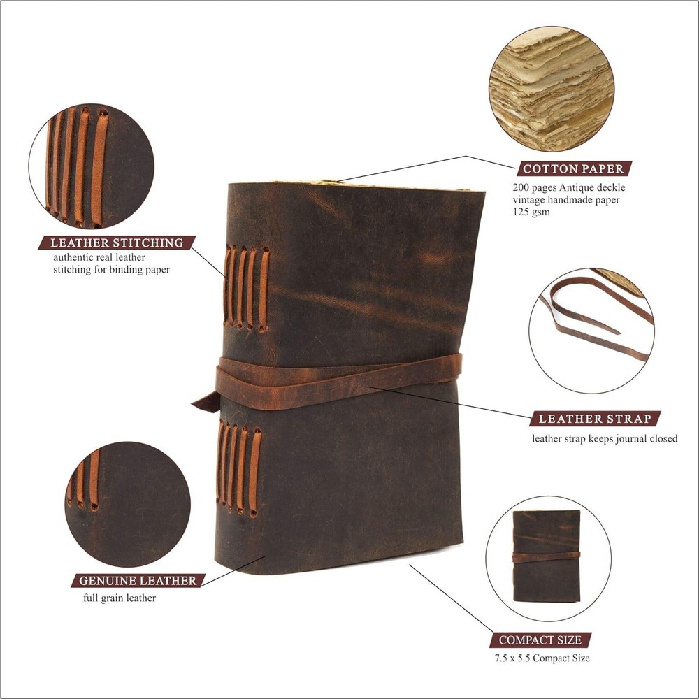 Leather Journal Travel Diary, Handmade Vintage Bound Notebook For Men & Women, Antique Finish, Genuine Buffalo Leather- Quality Unlined Paper Perfect for Notes, Art Sketchbook, 7X5 Inches, Brown Description BEAUTIFUL JOURNALS THAT WILL LAST Beautifully Soft and Durable Dark Brown Genuine Water Buffalo Leather (Not Faux or PU leather used) No glue used - hand-stitched binding means the pages stay firmly in place (Paper is not refillable) A lovely distressed vintage style with a gorgeous, real leather scent Handmade leather - naturally tanned with oil & Deckled, not with acids that end up in rivers. Naturally tanned with special oils, if the distressed leather gets marked or scratched, you can rub these markings and they will fade away. The hand-crafted nature of these journals means no two are quite the same. The soft brown leather gives a vintage look with the asymmetric flap adding a certain rustic charm. It is an utterly unique and wonderful gift for a friend or to treat yourself to as a special keepsake. Tree-Free Paper & No Bleed Through 100 sheets/200 pages (counting both sides) of Blank/Plain/Unlined/Unruled, brown-colored paper Hand-crafted with Recycled Cotton paper, perfectly complementing the brown leather Tree-free and Acid- free means you are purchasing a product that is less harmful to the environment. The perfect number of pages, not too bulky, so it is easy to write in from the very first page 125gsm thickness means it is beautifully soft to write and draw on, use any pen without any ink bleeding through Made by gifted artisans using handcrafted techniques passed down through many generations. Our Leather Journals come in 2 handy sizes: Medium 7" x 5" Portable Traveller’s size Large 9" x 6" For Home and Office use Easy for handwriting, drawing, or sketching and compact for carrying in your bag. Use it for Daily Notepad or Bullet Journal Artists Sketchbooks or Poetry Work Instagram Photobook or Scrapbook Girls Diaries or Teen Journaling Food Planner and Grocery Lists Travel Diary Weight Watchers Records Appointments Reminders Journalists Notebook. Features: DURABLE BUFFALO LEATHER made from premium quality buffalo leather is second to none with a wonderful leather smell, its soft-feeling, yet super tough. Oil pulled leather finish. Beautifully crafted & unique design. Soft & Supple Dark Brown Genuine Water Buffalo Leather with a real leather scent. Being hand-made from 100% natural leather, our journals can vary in look & shade, producing a unique item, no two are quite the same - a special keepsake for your thoughts, plans & ideas. RUSTIC DESIGN- It has an asymmetric shape at the front as its hand made and decorative leather string stitching on the spine adds antique charm to this lovely keepsake for kids, men, women, students, artists, journalists, or travelers of all ages. A long leather strap wraps around the journal to secure the notebook firmly when not in use. Perfect for all your daily writing and drawing needs. This versatile notebook is ideal for several uses and allows for easy handwriting, sketching, and drawing EARTH-FRIENDLY: 100 sheets/200 Handmade cotton pages (counting both sides) of Blank/Plain/Unlined/Unruled, brown-colored paper (NON-REFILLABLE), hand-crafted with eco-friendly recycled cotton which is acid-free & tree free - environmentally kind! This rustic leather notebook from Rustic Vintage is the perfect writing companion for journal lovers and anyone with a taste for things with an antique or vintage feel. NO BLEED THROUGH- You can Easily Draw through from any type of Pencil, Pen, Ball Pen, Gel Pen, Sketch Pen, Ink Pen, Sparkle Pen will glide through the paper smoothly without any ink bleeding through on this thick quality paper weighing 125gsm. Easy for handwriting, drawing, or sketching and compact for carrying in your bag. Ideal for Artists, Diaries, Travelling, Business, Teen Journals, Poetry Work, Journalists, laboratory notebook, Food Planner, Scrapbook, and Christian Bible Journaling. PERFECT COMPACT SIZE: for any writer 7" x 5" so easy to carry when traveling or to keep at home or work next to your bed or desk. The gift box included making this a perfect gift for Kids, Adults, Young & Elderly Man & women for Birthdays, festivals, Christmas, Anniversaries. Whether you are a huge fan of keeping a journal or just beginning, this rustic writing diary is here for you! Such a great way to empower your thoughts and ideas, record important life events, or simply blow off some steam! Product Details: Brand: RusticVintage Color: Brown Unlined Theme: Book Sheet Size: 5.5-x-7.5-inch Pages: 200 Pages Cover Material: Leather Style: 7X5 Inches - Brown Unlined (Deckled Edge) Ruling Type: Plain Special Feature: Lock Number of Items: 1 Manufacturer: Rustic Vintage Brand: RusticVintage Item Weight: 15.8 ounces Product Dimensions: 5 x 1.5 x 7 inches Is Discontinued By Manufacturer: No Color: Brown Unlined Cover Material: Leather Material Type: leather Number of Items: 1 Size: 7 Inches X 5 Inches Ruling: Plain Sheet Size: 5.5-x-7.5-inch Manufacturer Part Number: JB 005 Date First Available: November 24, 2020 Handling We will ship all orders within 3 business day of payment. Delivery We Do Not Ship Outside of the Continental US. Return Policy All items qualify for returns within 30 days of receipt. Buyer is responsible for return shipping on any item that is not damaged. Feedback We take our reputation seriously, we buy and sell online, so we understand the value of trust. If you are unsatisfied with your order, please contact us and we will work with you to resolve it to your satisfaction.