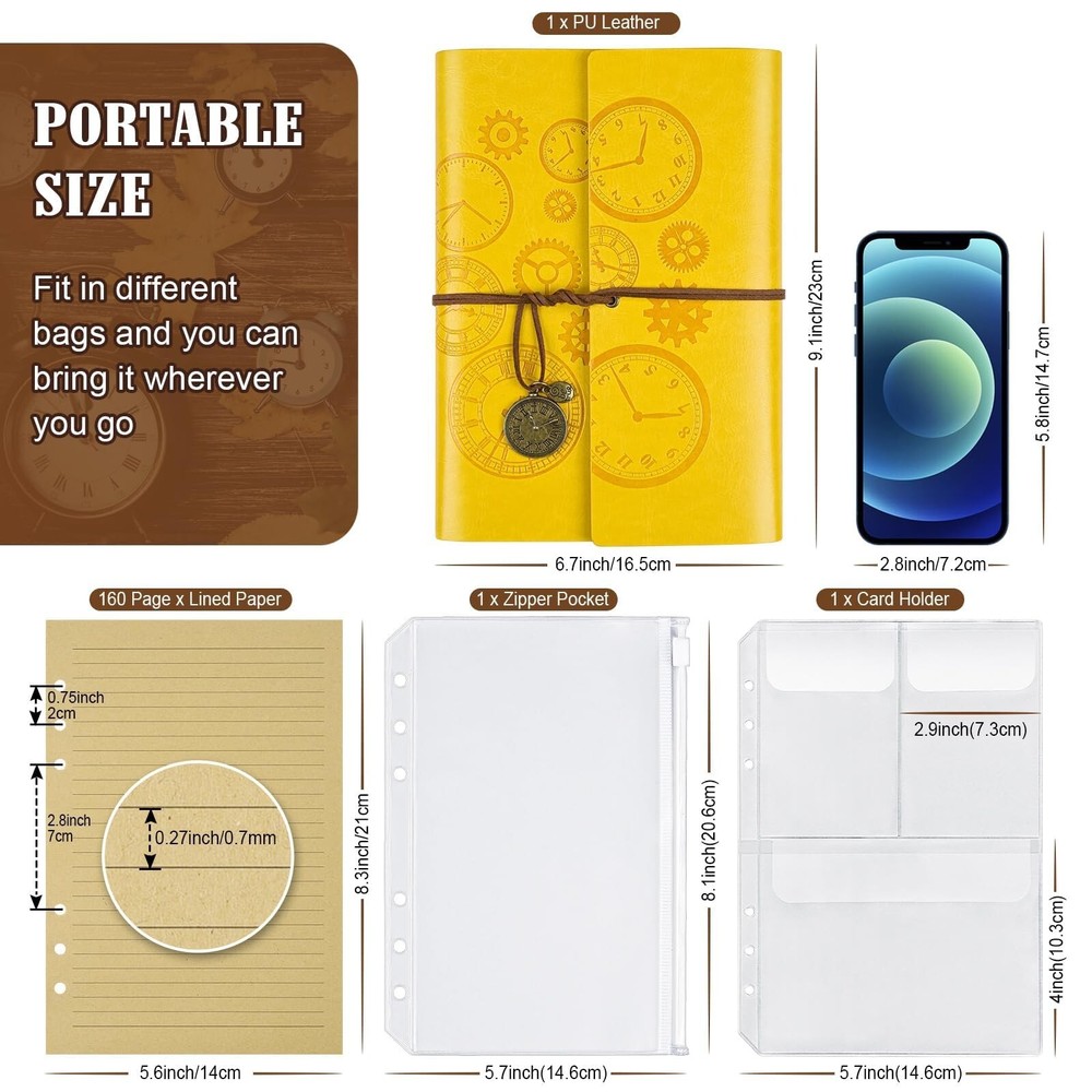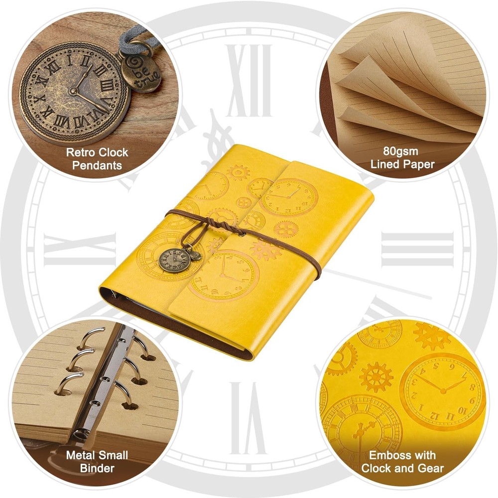 Leather Journal, Travel Journal, Vintage Journal for Women Men, Leather Bound Journal for Writing, Refillable Journal Notebook with Lined Page, Diary for Girls Boys Gift, 9.1" x 6.5" (A5, Yellow) Description Features: Timeless Vintage Appeal:Wrapped in durable PU leather, this leather notebook is designed to withstand the tests of time. Its cover boasts a captivating embossed clock and gear motif, paying tribute to bygone eras. Perfect for wanderers, business visionaries, creative souls, and wordsmiths alike a gift that resonates deeply. Luxurious No-Bleed Lined Pages:Delve into your thoughts and chronicle life's nuances with our 80 sheets/160 pages of college-ruled, thick, and 100gsm lined paper.Crafted from premium-grade paper, it preserves your words for years to come and allows for fountain pen writing on both sides, enhancing your writing pleasure. Embrace the Charm of Timeless Journaling: Crafted with a metal binder, this refillable notebook empowers you to effortlessly insert or remove pages without compromising its charming aesthetics. The metal binder ensures robustness for regular use, while its discreet size won't hinder your writing experience. Travelers Notebook On the Go:At a portable A5 size of 7.3 x 5.1 inches, it slips effortlessly into various bags, ensuring your writing sanctuary accompanies you everywhere. Our leather notebook journal offers the convenience of 1 zipper bag and 6 card holders a repository for your pen, phone, business cards, and memories. Incredibly practical for both daily use and travels. Thoughtful and Memorable Gift Choice : Dive into journaling as you capture fleeting moments, attend meetings, or immerse yourself in your thoughts. Let this personalized journal be a vessel of expression, a daily diary, and a cherished companion. An ideal Valentine's Day or birthday gift, sure to warm the hearts of friends and family alike. Product Details: Brand: Asten Color: Yellow Theme: Book Sheet Size: A5 Cover Material: Faux Leather Style: Vintage Ruling Type: Ruled Special Feature: Lock Number of Items: 1 Specific Uses For Product: Note Taking, Journal Writing Manufacturer: Asten Brand: Asten Item Weight: 14.4 ounces Package Dimensions: 9.13 x 6.65 x 1.18 inches Color: Yellow Cover Material: Faux Leather Number of Items: 1 Size: A5 Ruling: Ruled Sheet Size: A5 Manufacturer Part Number: SZBEN-A5-LHUANG Date First Available: August 21, 2023 Handling We will ship all orders within 3 business day of payment. Delivery We Do Not Ship Outside of the Continental US. Return Policy All items qualify for returns within 30 days of receipt. Buyer is responsible for return shipping on any item that is not damaged. Feedback We take our reputation seriously, we buy and sell online, so we understand the value of trust. If you are unsatisfied with your order, please contact us and we will work with you to resolve it to your satisfaction.
