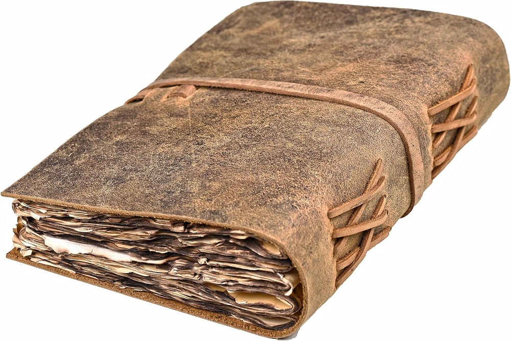 VINTAGE JOURNAL: A Perfect Journal for Women and Men by Leather Village. This Vintage Leather Journal is Made from Cruelty Free Genuine Buffalo Leather which is naturally tanned with oils. As these Daily Journals are made with genuine Cruelty free leather so each vary in look and shade producing a unique item. The Distress/Old Leather look only available at Leather Village combined with Antique Vintage paper makes it a perfect Book of shadows - Spell Book. JOURNAL NOTEBOOKS WITH STURDY BINDING: A sturdy hand stitched binding to make sure that no paper comes out loose. This big life Journal comes in three sizes 7x5 Inches, 9x6 inches and 11.5x8 inches in size. Use this Blank Journal as a Travel journal, Daily journal, Gratitude Journal, pregnancy journal, Bible Journal & Prayer Journal, Wedding Guest Book Alternative, Writing Journal etc. PERFECT GIFT: IDEAL GIFT FOR WOMEN MEN. This Leather Notebook makes a Unique Gift for Women Men - Teen Girls Boys. VINTAGE GIFTS FOR ANTIQUE JOURNAL LOVER, Personalised gifts for women men, Harry Potter Gift, Birthday gift, Christmas Gift, Anniversary Gift, Holiday Gift. Easy for handwriting, drawing and sketching and compact for carrying in your bag. USE ANY KIND OF PEN; sketch, doodle on your blank Journal with a Calligraphy Pen, Fountain Pen, Brush Pen and many more. BURNT EDGES VINTAGE PAPER:- This Watercolor Journal comes with No Bleed BUNT EDGES VINTAGE PAPER. The leather Bound Journal has 170 Pages ( 340 Both Sides ). This is the Masterpiece of Leather Village Vintage Leather Journal Collection. We bypassed time to bring this thousand year old look to you. LEATHER VILLAGE PROMISE: - Leather Village Journal comes with the Trust and promise of Purity of craftsmanship with each Writing Journal. Leather Village prides itself on making products from the highest quality materials with attention to detail. But for any reason if you are not satisfied with the quality of your journal kindly contact us for replacement. Product Description Vintage Leather Journal Artisan crafted leather bound journal notebook, unique art journal. Made with thick genuine water buffalo leather with earthy scent combined with unbeatable Indian craftsmanship and designed with precision.Because each hide is unique, it’s possible to find slight variations in color among Notebooks which make them ONE OF A KIND. The soft and supple dark brown leather has a distressed finish which gets better with time, and will last for years to come. Sturdy Leather Binding Secure hand binding so no paper comes out loose from your Vintage Notebook . An ideal gift for artist writers, travelers, graduates, friends, or anyone who has a love for writing and note-taking. A Journal that is worthy of your thoughts and ideas, that will make you feel special every time someone opens it and that will last a lifetime. Takes you back down the years The Journal has antique rustic paper which gives you a feel of writing on a old medieval book . The paper is thick enough to hold all kinds of ink The Burnt edge paper is smooth enough to write with all kind of Pens with no bleed through. It is acid free and pH neutral so whatever you write stays for generations . Buy This to Enjoy !! Feel the magic with this Book of Shadows Aged/Old Paper Notebook Journal with Aged/Old Paper. This Writing Journal Notebook comes with 340 Pages. Real Burnt Edges Vintage Journal with Burnt Paper Edges. Antique Leather Vintage Leather Journal with real vintage look Leather. The Journal has top Grain Buffalo Leather tanned with Natural Oil and Scents. Sturdy Binding Leather Journal has sturdy Coptic Binding. The traditional way of Binding Paper.