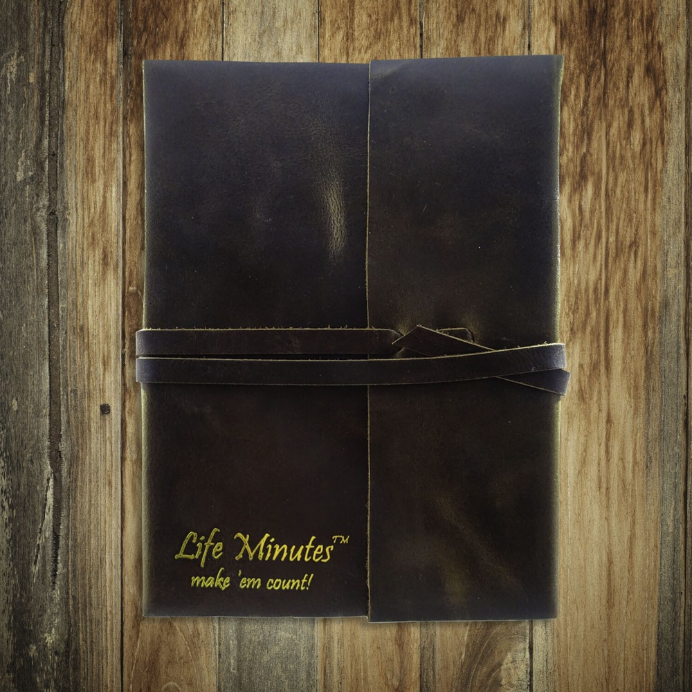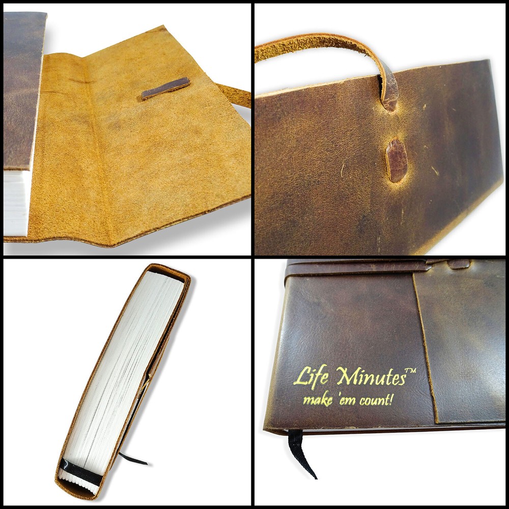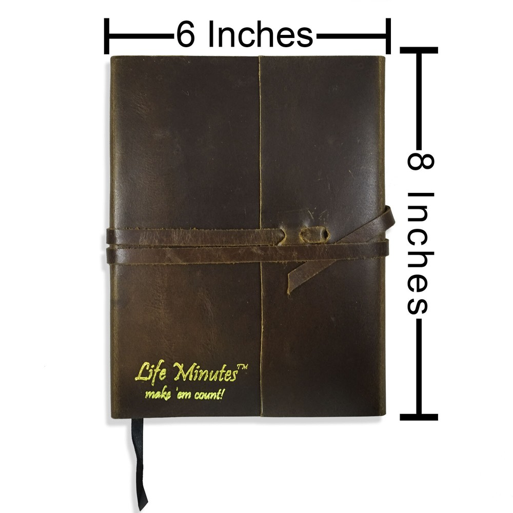 WHILE OTHER JOURNALS are mass produced using cheaper, thinner leather or chemically treated wood-based paper; our Life Minutes journal is HANDMADE BY ARTISANS utilizing a thicker, PREMIUM QUALITY LEATHER which makes your journal more SOFT, DURABLE & SUPPLE. This is combined with handmade THICK, RECYCLED COTTON PAPER which is free of acid and does NOT BLEED THROUGH, giving you an exceptional writing experience in a journal designed to LAST A LIFETIME. Having trouble finding the PERFECT GIFT for that important person in your life? Someone thoughtful, and intelligent, but HARD TO SHOP FOR? Our Life Minutes notebook is GUARANTEED TO IMPRESS. This is a gift that will satisfy the recipient. A UNIQUE and SUSTAINABLE gift that will be cherished. Offered by a BOUTIQUE American brand that emodies the CLASSIC elements of TIMELESS DESIGN. Embark on a new adventure! It may be TRAVEL, a new RELATIONSHIP, or a LIFE TRANSFORMATION. You need a journal that is WORTHY of your ideas and thoughts, that will make you FEEL SPECTACULAR every time you open it. Our Life Minutes journal offers the most BEAUTIFUL WRITING EXPERIENCE, satisfying to your senses with its LUXURIOUS feel, top notch CRAFTSMANSHIP and its bold GENUINE LEATHER scent. BUY WITH COMPLETE CONFIDENCE - We pride ourselves on having exceptional customer service and provide a 100% MONEY BACK GUARANTEE. Our customers are at the heart of everything we do. We know the quality of our products and we want you to have the best possible. This is the perfect leather bound journal for a travel diary, for recipes, as a writing notebook, time management, bible journaling, poetry or a daily planner. If you are not satisfied then we will MAKE IT RIGHT or REFUND you. Enjoy this luxurious and ECO-FRIENDLY hand crafted journal. There is NO LEAD OR ARSENIC used during the leather tanning process. We ensure to use 100% NATURAL materials in the most sustainable way possible. Our excellent paper is made from RECYCLED cotton - this not only adds a nice feel to the paper, it also uses wasted materials from the fashion industry to create something usefull and beautiful. Every day many of us take things for granted. Take a look around you, think about how you spend your time; as we call them, your LIFE MINUTES! Often times we get caught up in things that seem important, only to ignore what actually is important. Have your priorities become out of place? We want to help people remember how to focus on what truly counts!