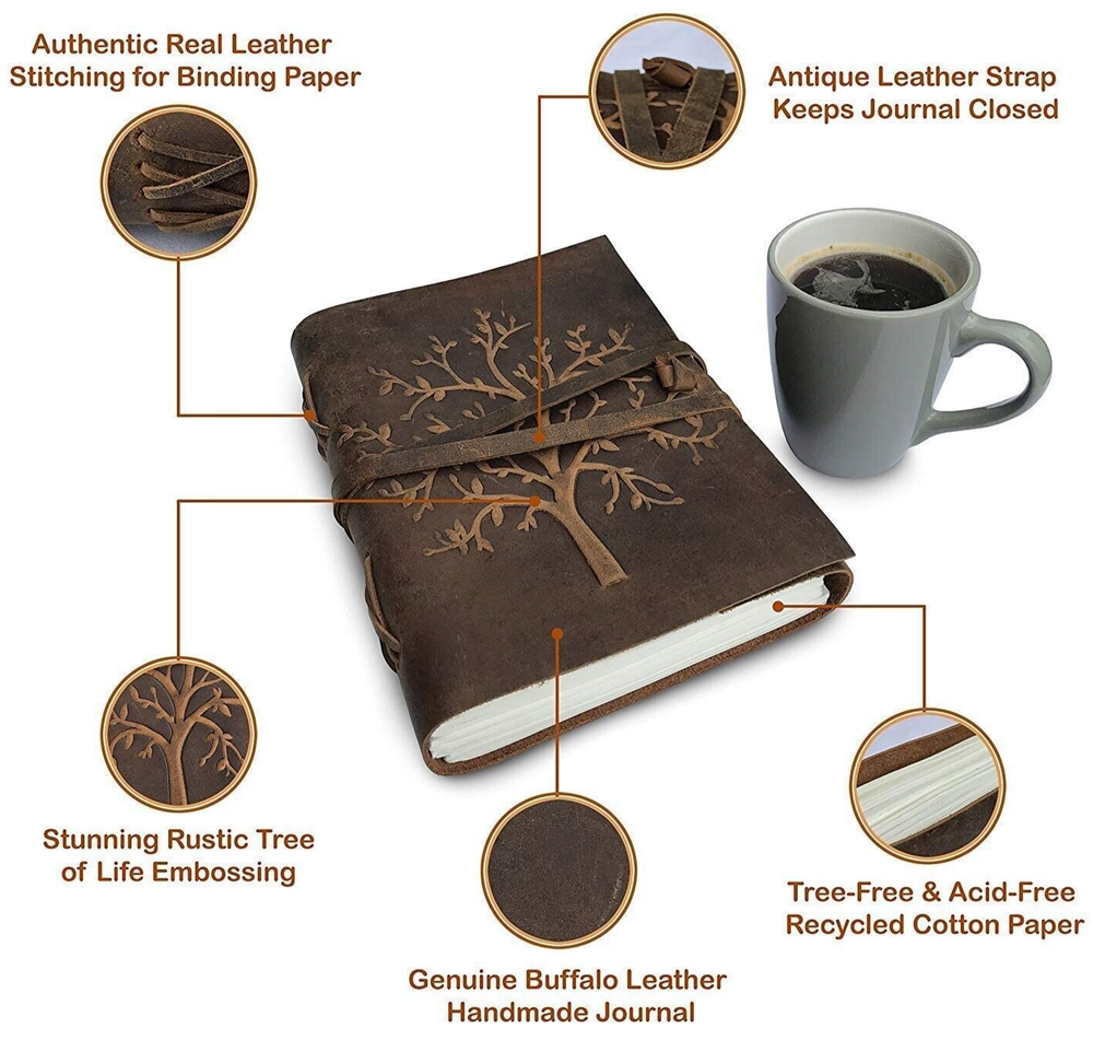 Presenting pure leather journal with Tree of Life embossed on it. This journal is made with full grain leather which has been embossed via a heat press to give it a realistic look. Size: (7 x 5 inches) Key Features: - 100% Handmade and handstitched - 200 Vintage page ( both side) - Premium Paper: Recycled paper pages 100% cotton - Leakproof paper, so you can use any sort of pen/markers. Ships from our workshop in India with Fast shipping (tracked) within 12 hours. please any requirement contact by Mail. very thanks for visit my ebay store.