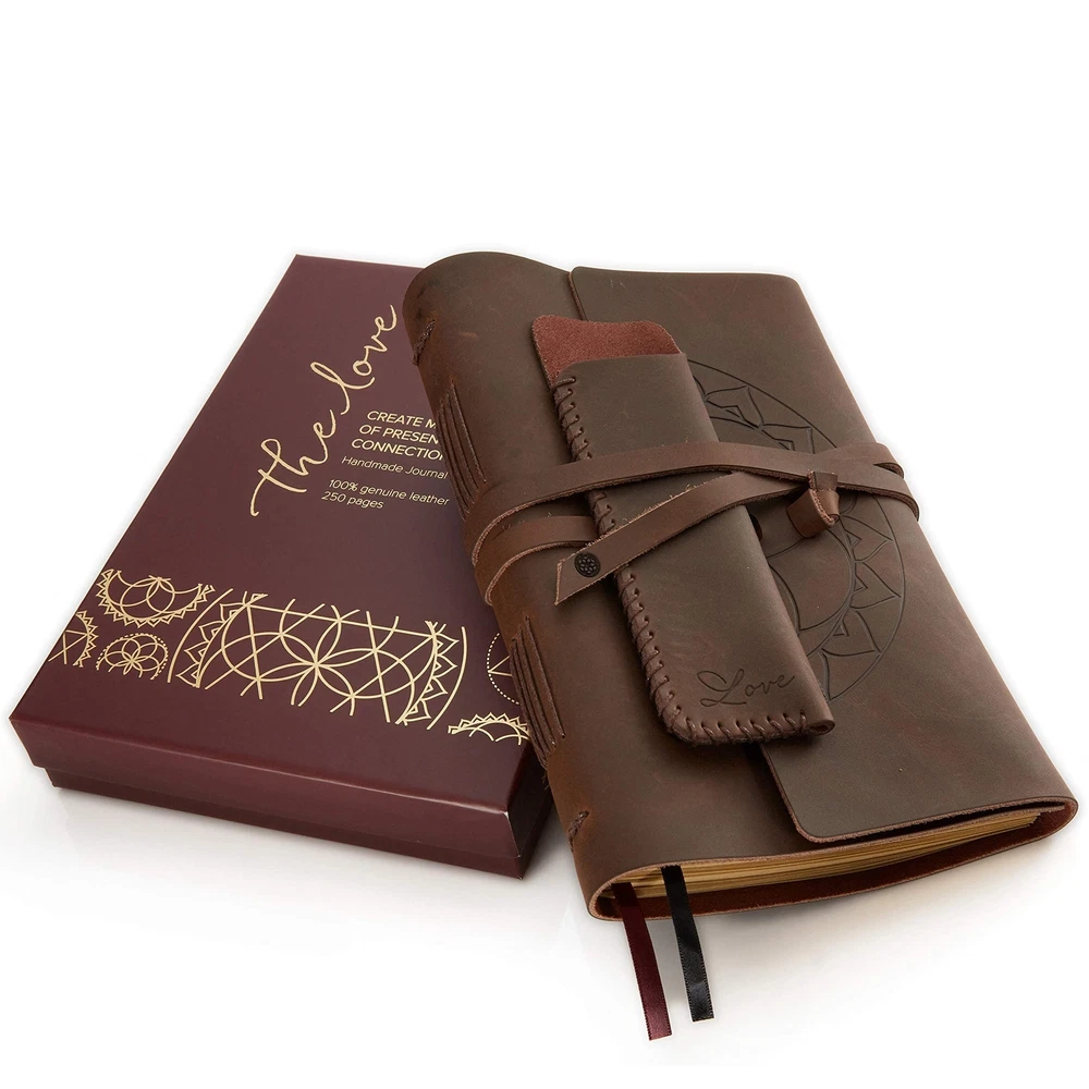 Leather Journal for Women and Men + Pen Holder | 8" x 6" | Lined or Plain Non-Bleed Paper | Sketchbook & Writing Travel Notebook | Handmade Genuine Leather Bound Journal for writing in (Brown, Lined) ✓ Free 60 Day Returns ✓ Free Express Shipping Description: Features: Genuine Leather Handmade Journals - Hand-Stitched, with a secure binding. Feels great, looks gorgeous, smells divine 240 Pages of AMAZING paper - Plain or Lined Pages. Thick, smooth, non-smudge/bleed pages. Perfect for any writer, traveller, thinker, musician or artist Gift Ready - Beautifully packaged with poem gift card BONUS Leather Pen Holder included - Never lose your pen again! Includes beautifully designed page dividers Bookmarks included - Two satin ribbons to save your space so you can get back to writing quickly Product Details: Brand: Sacred Lotus Love Color: Brown Theme: Book Pages: 250 Cover Material: Leather Style: Sacred Lotus Love Leather Journal Ruling Type: Ruled Special Feature: Pen Holder Number of Items: 1 Specific Uses For Product: Book Manufacturer: Sacred Lotus Love Brand: Sacred Lotus Love Item Weight: 1.4 pounds Product Dimensions: 8.3 x 6 x 2 inches Item model number: Love Journal Is Discontinued By Manufacturer: No Color: Brown Cover Material: Leather Material Type: Lined Number of Items: 1 Size: 8.75 x 6 Ruling: Ruled Manufacturer Part Number: Sacred Leather Journal Date First Available: August 19, 2018