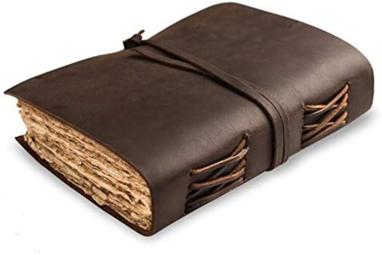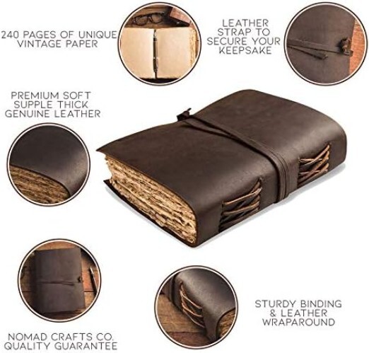 Leather Journal-Vintage Leatherbound Journal - Handmade Antique Deckle Edge Paper - Leather Sketchbook - Book of Shadows Journal - Thick Journal - Vintage Journal Unique Handmade Vintage Paper - Nomad Crafts Co. Vintage Journal is made with 240 pages of Antique Paper which looks like it was pulled from history. You will fall in love with the the antique handmade cotton paper which is very unique to our Nomads Vintage journal. Use Any Kind Of Pen - Sketch, Doodle, Write on your Leather Bound Journal with a Calligraphy Pen Fountain Pen, Brush Pen, Ball Pen, Acrylic Colours, Watercolor and many more. Premium Soft Supple Thick Genuine Leather - The Nomad Leather Journal is made from naturally tanned full grain leather which feels and smells Amazing. It's soft and very comfortable in the hands. Don't be fooled with competitors using cheap substitutes, this is the real deal. Sturdy Binding And Leather Wraparound - Sturdy hand stitched binding to make sure that no paper comes out loose from your vintage notebook . The leather wraparound keeps the papers of the journal safe and secure. Our 365 Day Promise - We are very confident that you will fall in love with your Vintage Journal that we offer a 1 SATISFACTION GUARANTEE .If you are not happy with your leather journal for any reason we will offer a resolution or a FREE . No Questions asked!