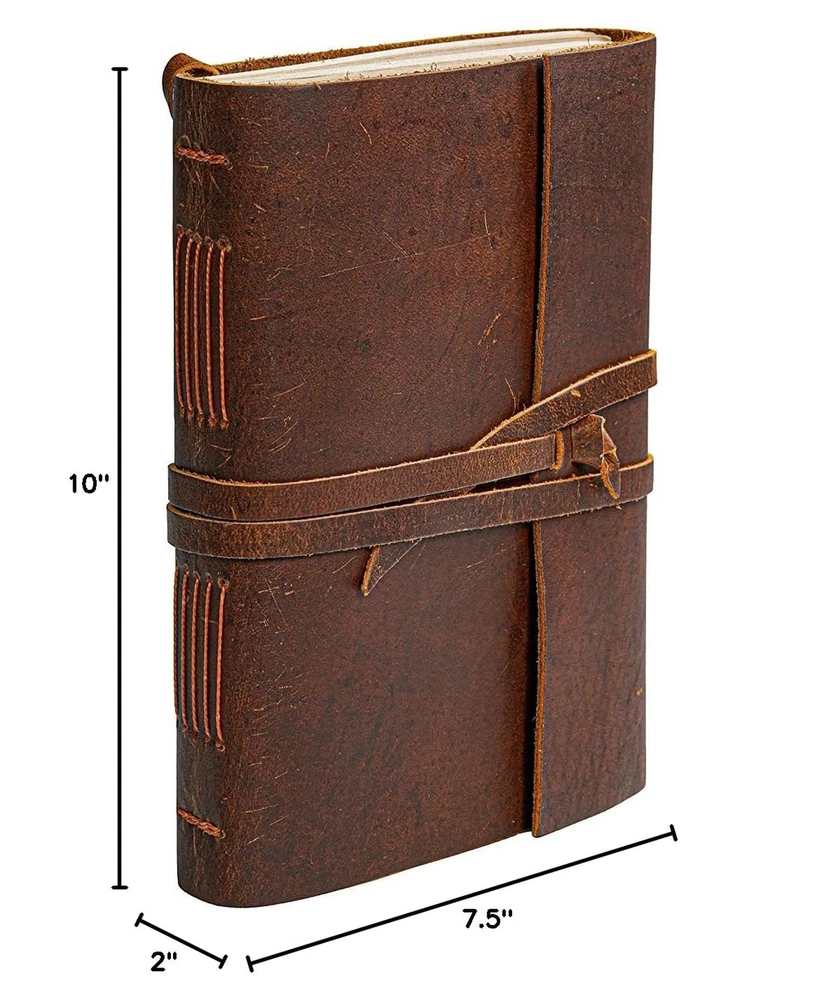 Leather Notebook - Rustic Handmade Vintage Leather Bound Journals for Men and Women - Leather Craft Unlined Paper 300 Pages, Leather Book Diary Pocket Notebook, Diary to Write in (7.5" x 10" Inch) Product Details Size: 7.5" x 10" Inch Brand: HLC MPN: r56esf UPC: Does not apply EAN: Does not apply Brand: HLC Color: Brown Theme: Book Sheet Size: 5-x-8-inch inches Pages: 300 Cover Material: Leather Style: Vintage & Unique Ruling Type: Plain Special Feature: Soft cover Product Dimensions: 10"L x 7.5"W x 2"Th Manufacturer: hlc Brand: HLC Item Weight: 1.3 pounds Product Dimensions: 10 x 7.5 x 2 inches Item model number: r56esf Color: Brown Cover Material: Leather Material Type: leather Number of Items: 1 Size: 7.5" x 10" Inch Ruling: Plain Sheet Size: 5-x-8-inch inches Manufacturer Part Number: r56esf Date First Available: March 13, 2021 HANDCRAFTED FROM GENUINE LEATHER: Each journal is specially designed and handmade from premium split leather. Artful hand stitching to create a timeless space for your thoughts OUR 1 YEAR REPLACEMENT PROMISE & IDEAL SIZE: Handheld, Large size (10 x 7.5 x 2 inches). Easily carry this journal in your daily life and on your most exotic adventures. You don't have to take risk If your vintage journal arrives damaged & any mistakes with the craftsmanship, YOU CAN DIRECTLY CONTACT TO US within 1 year and we will send you a FREE REPLACEMENT or FULL REFUND. No questions asked, Makes an Awesome FRIEND'S Birthday Gift! Buying 2, 3 etc Thanks. THICK UnlINED PAPER: 300 pages of thick, natural 100 GSM cream paper. Perfect for use with fountain pen, felt pen, markers. Pages are Unlined. Note: page count is 300 pages, 150 sheets Approx TELL YOUR STORY: We designed this classic leather journal as a time capsule for your thoughts. Capture your important memories, accomplishments (and failures), life-changing moments and evolving dreams as a keepsake to reflect upon in years to come THE PERFECT GIFT QUALITY YOU CAN TRUST: high-quality craftsmanship makes this an essential tool for Poetry, Art, Sketching, Writing, Drawing, Calligraphy Leather Journal Give your loved ones a thoughtful gift that will last for years to come! Great for a birthday, anniversary, or graduation
