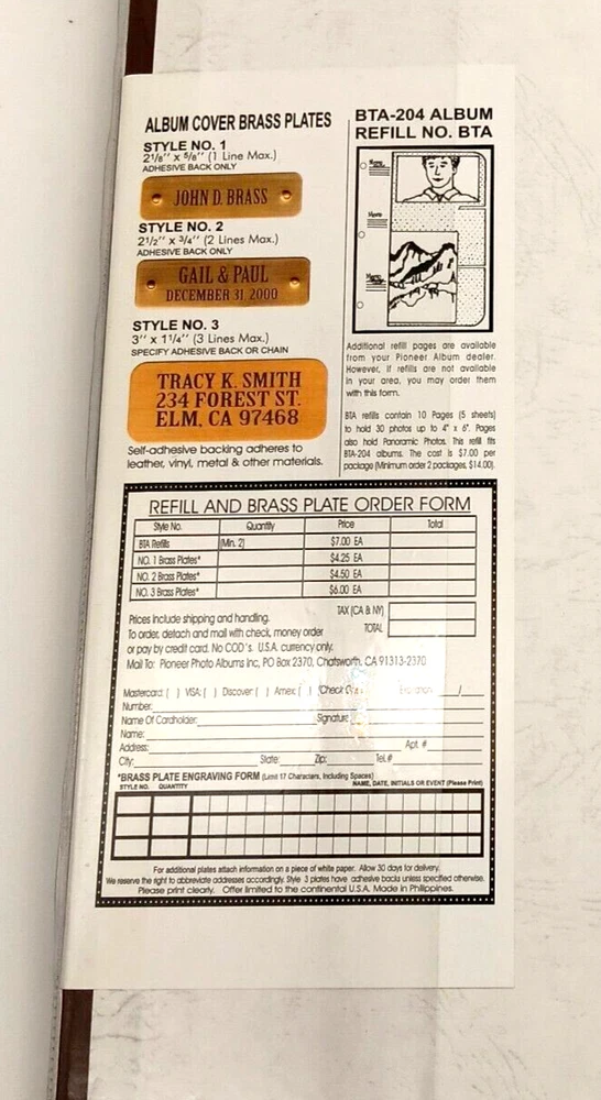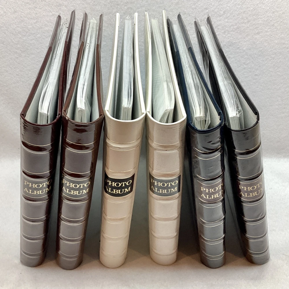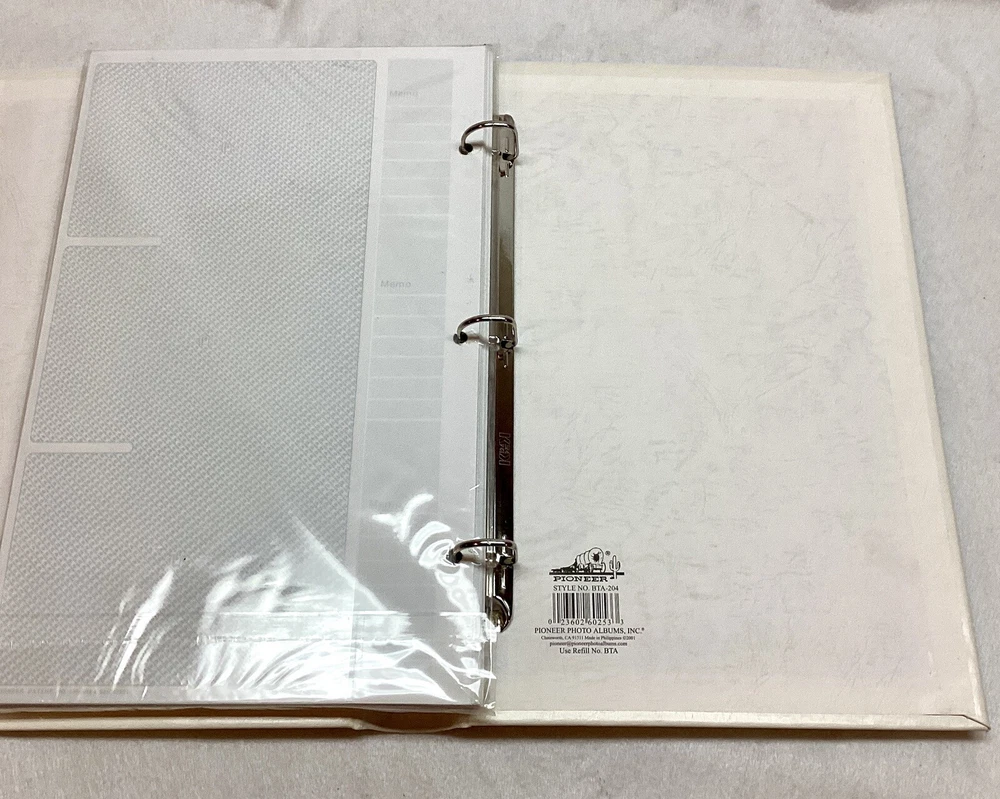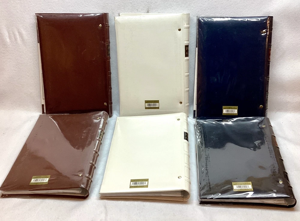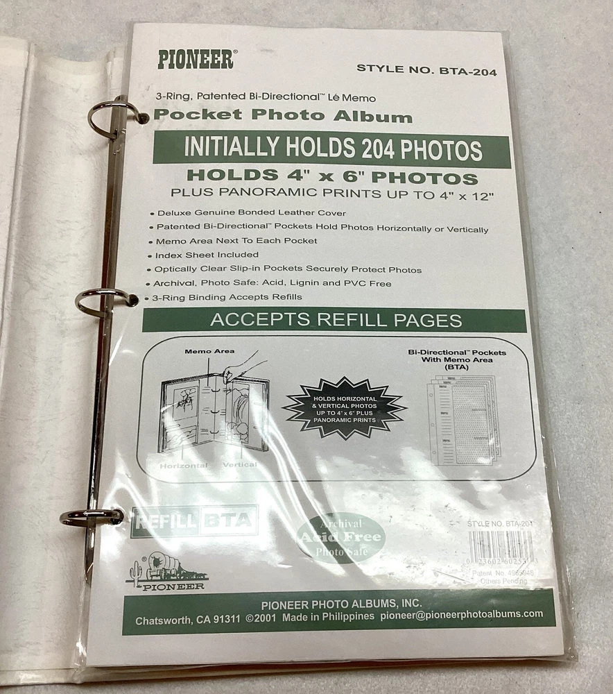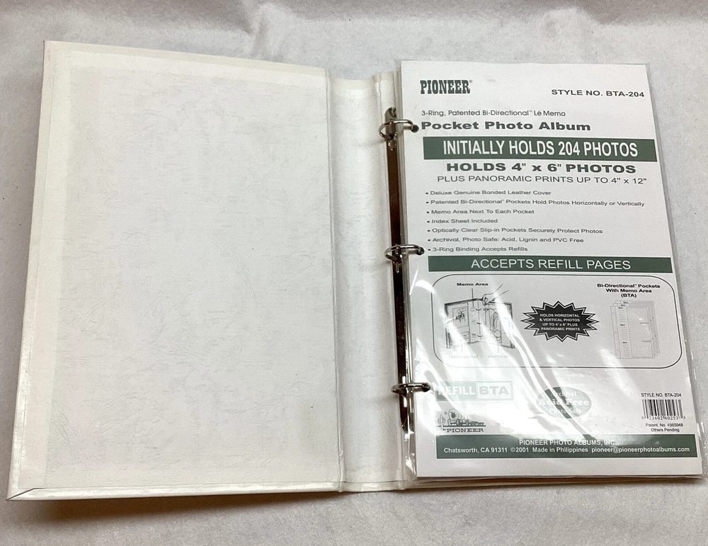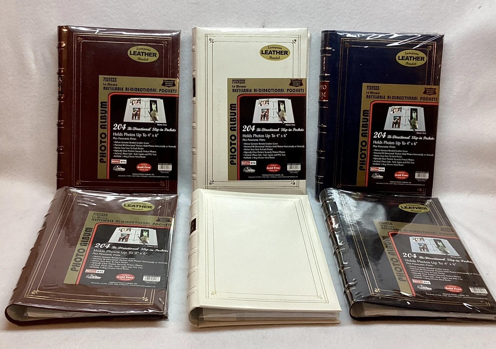 Lot of 6 Pioneer Bonded Leather Photo albums Style BTA-204 Pioneer Photo Albums 91311 Factory Sealed New except one white does not have outside wrap White - 2 pieces, Brown 2 pieces, Blue 1 piece, Black 1 piece 3 D-Ring Bi Directional - Hold up to 204 4" X 6" photos plus panoramic prints up to 4' X 12" Deluxe genuine bonded leather cover Memo area next to each pocket Index sheet included Optically clear slip in pockets securely protect photos Archival photo safe - acid, lignin and PVC free Accepts BTA refills Made in Philippines