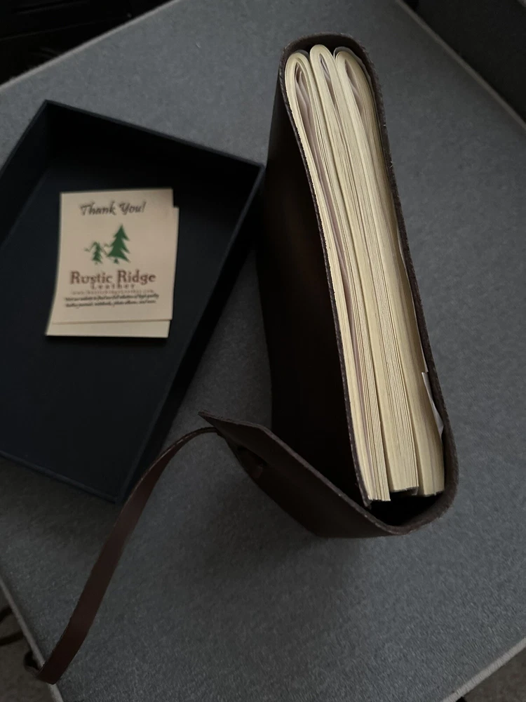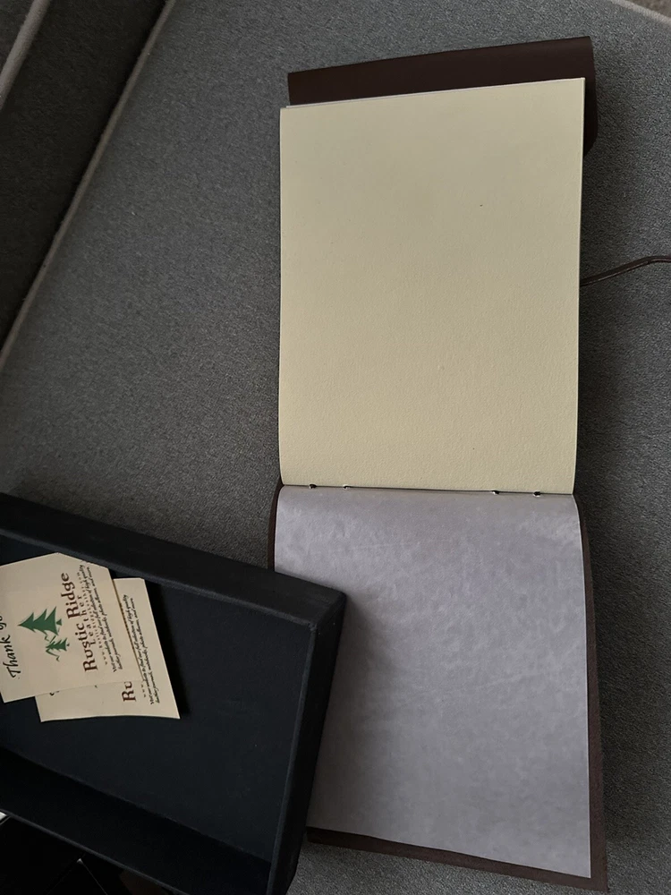 New in box, never used. Description from Amazon: Rustic Genuine Leather Scrapbook Photo Album with Gift Box - Scrapbook Style Pages - Holds 100 4x6 or 5x7 Photos - Memory Book. Costs $40 on Amazon.