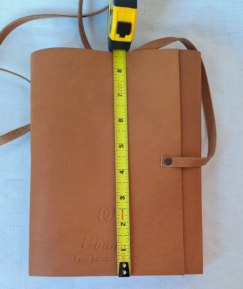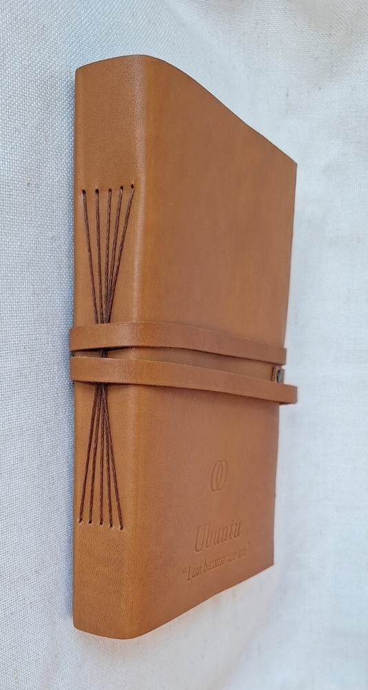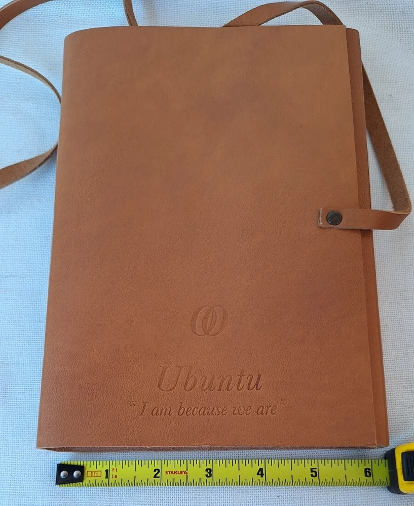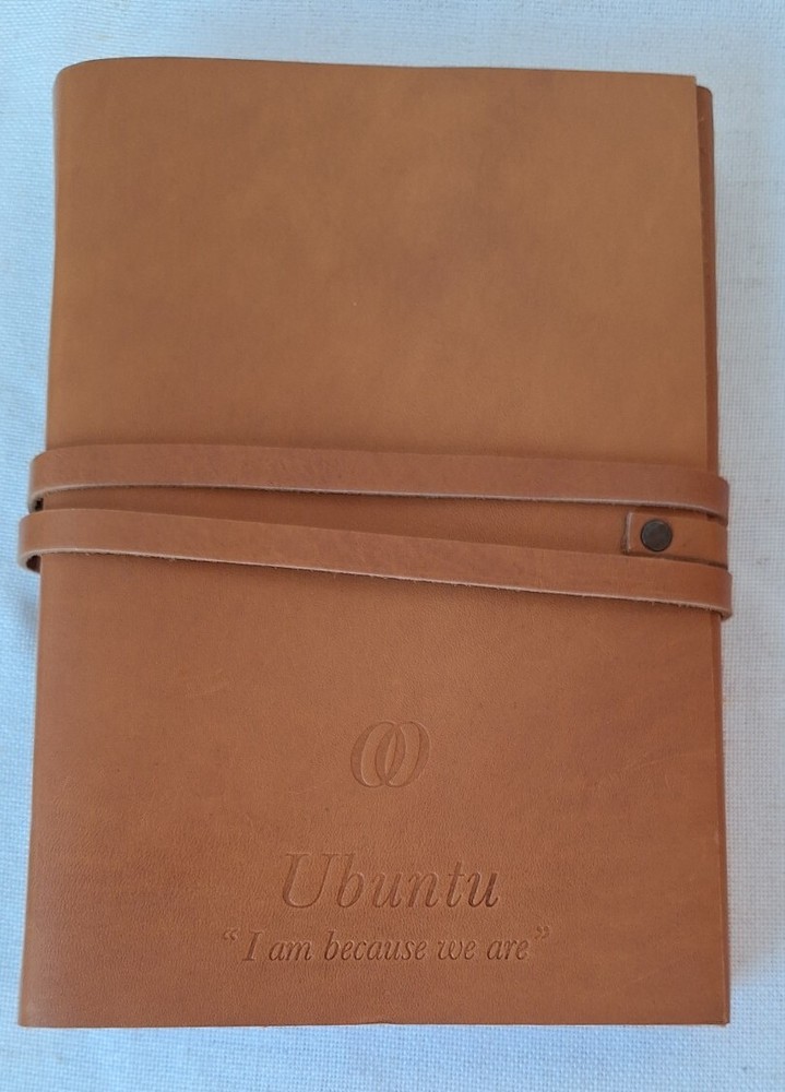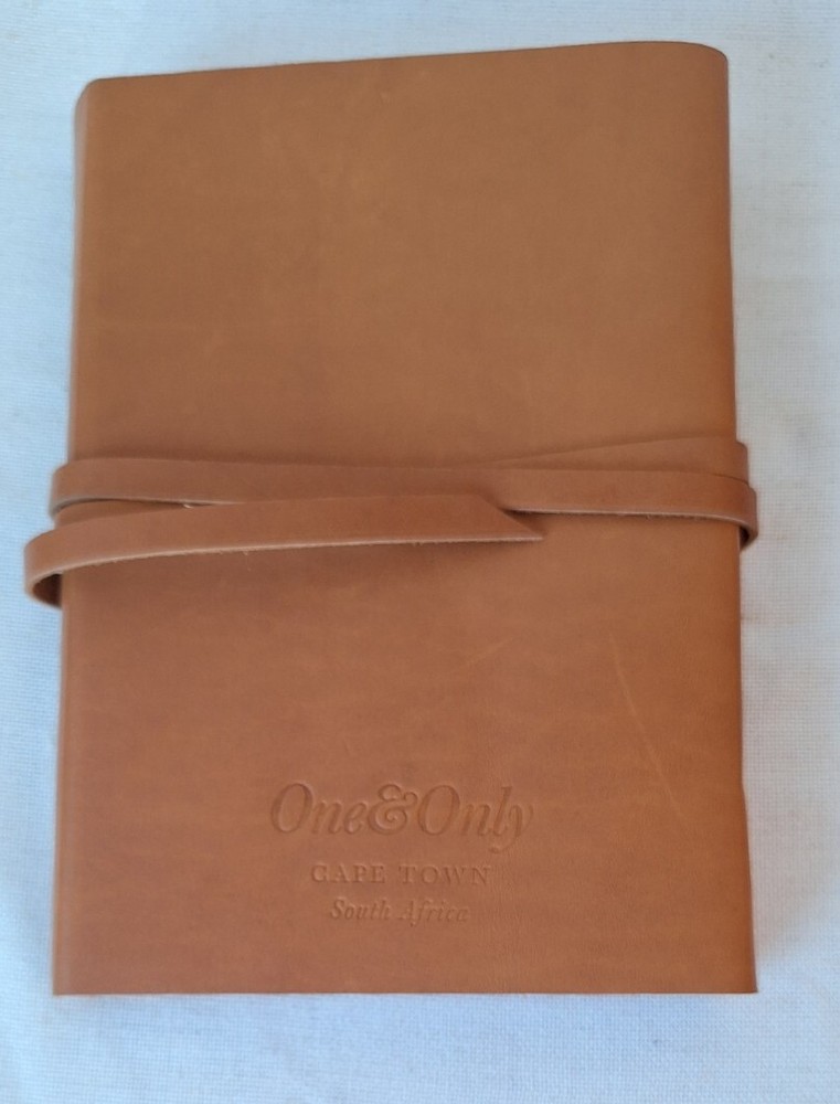 This Leather journal is from the Luxury Resort One & Only in Cape Town South Africa, the branding is on the back of the journal as shown in the Photos. The front says Ubuntu "I am because we are" That is the translation of Ubuntu. This is a Preowned New Condition item. This leather-bound journal is an ideal writing accessory for those who appreciate high-quality materials. The cover is made from leather and has a soft texture that feels great in your hands. The journal's unlined pages are ideal for freeform writing or for drawing sketches, making it a versatile addition to any collection.With dimensions of 8.75"L x 6"W x 1.2"Th, this journal is compact and easy to carry with you wherever you go. The soft cover makes it lightweight, while the durable material ensures it will last for years to come. Whether you're using it to jot down notes during a meeting or to record your thoughts at home, this leather journal is sure to become a cherished possession.