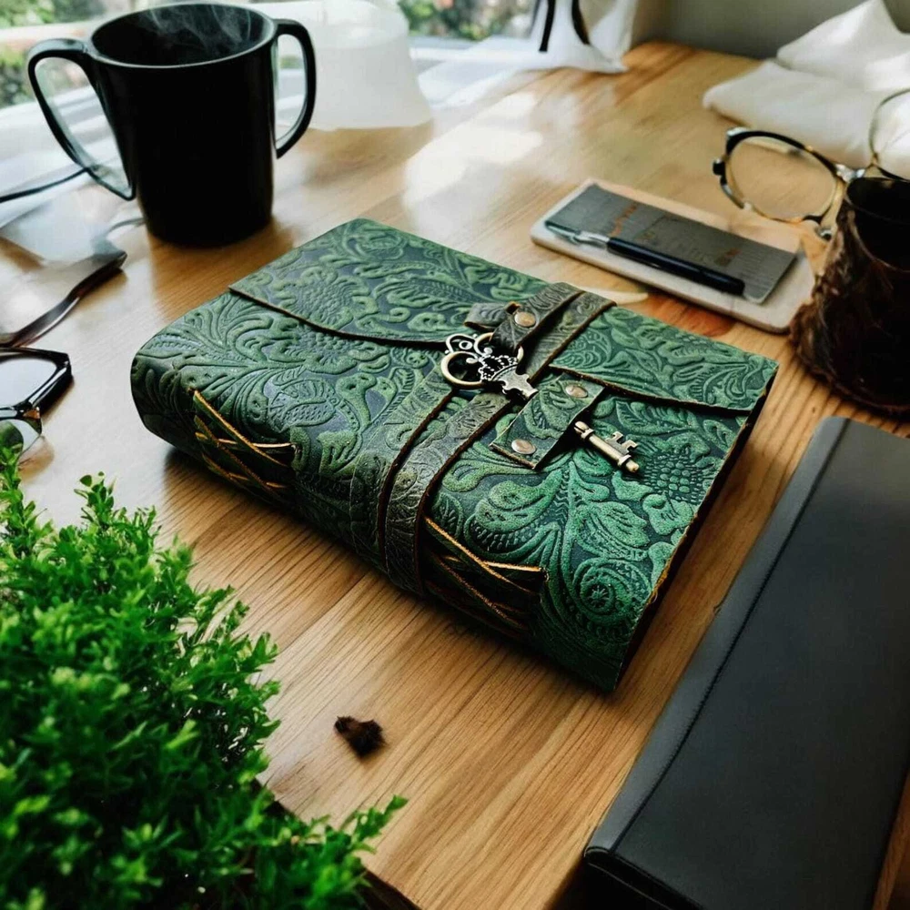 Unique garden flowers key bound handmade leather journal antique deckle edges paper office notebook sketchbook grimoire daily diary book garden flower handmade leather journal notebook • Size - 7×5 inches, 8x6 inches, 10x7 Inch. • Color - black, Brown, red, Blue • C-Lock Brad's • Genuine leather • Vintage deckle edge old paper ● Vintage Journal is made of unique vintage paper which looks like it was pulled from history. ● The vintage lock will keep all your valuable writing locked inside. Study hand stitched binding to make sure that no paper comes out loose from your vintage notebook. ● Sketchbook is great for keeping by the bedside to jot down dreams, or for use as a diary or journal. ● The paper is made from sustainable cotton and jute canvas. The paper is acid-free and pH neutral therefore is a timeless piece of art. Leather notebook, leather journal, leather grimoire, book of shadows, gift for him, gift for her, gift for boyfriend, gift for girlfriend, gift for mother, wiccan, pagan, recipe notebook, travel notebook, wedding guest book.