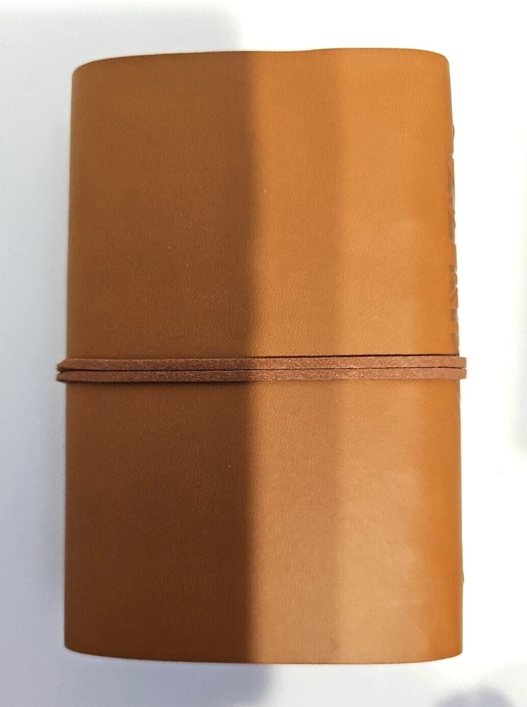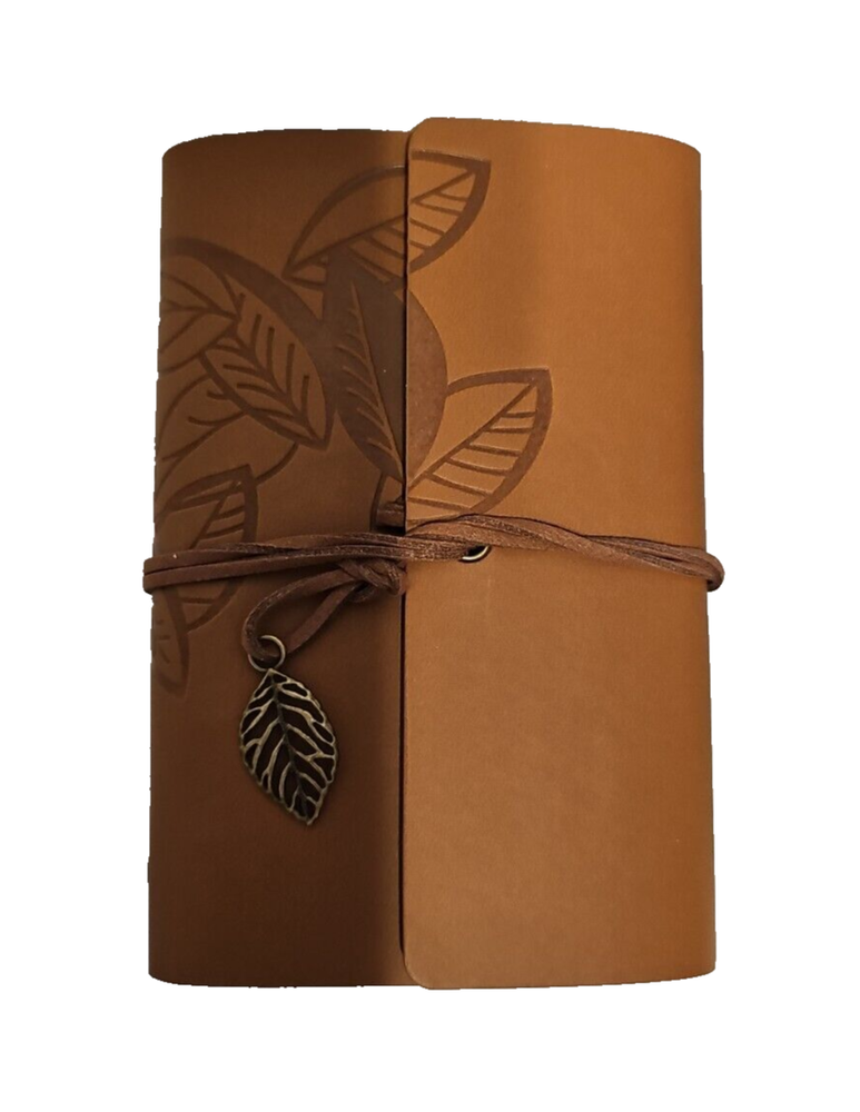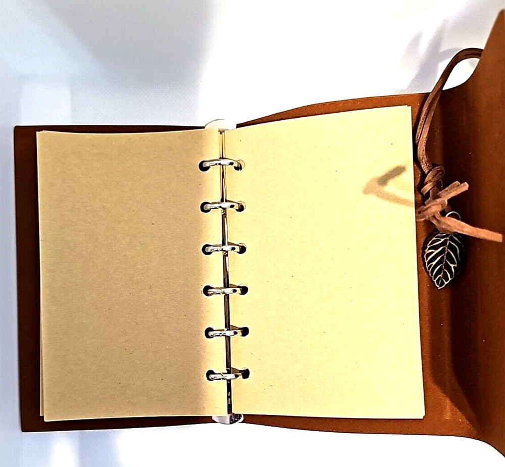 Leatherette Bound Journal Vintage Refillable Lined Pages Loose Leaf Notebook Leatherette Binder wrap includes a bronze-toned leaf charm, also embossed into the front of the journal. The 4" x 6" Passport size is ideal for travel.
