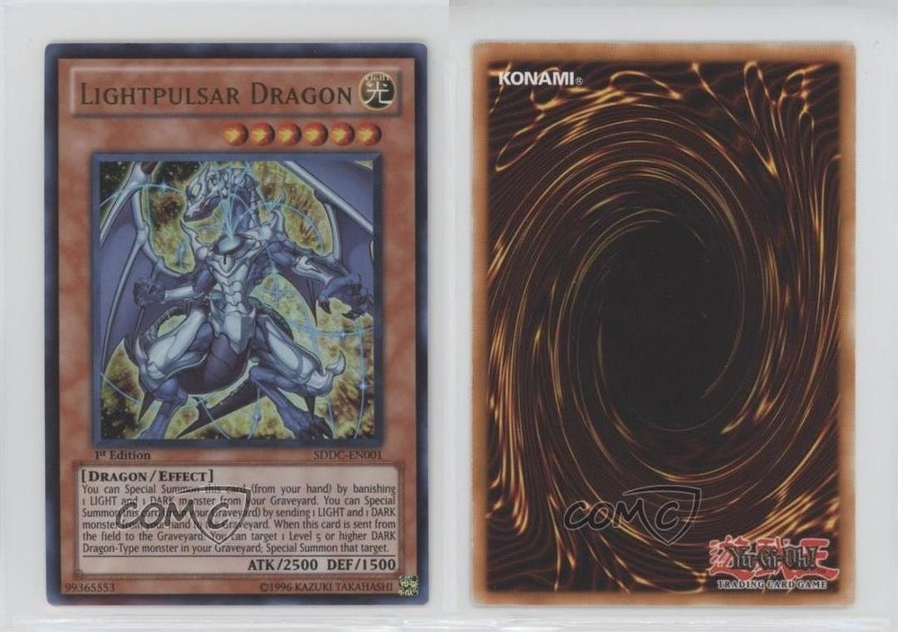 2012 Yu-Gi-Oh! Dragons Collide - Structure Deck [Base] - 1st Edition #SDDC-EN001 Lightpulsar Dragon (UR) COMC Item: 90447639 - YuGiOh Card - Featuring Lightpulsar Dragon Search for more: 2012 Yu-Gi-Oh! Dragons Collide Search for more: 2012 Yu-Gi-Oh! Dragons Collide - Structure Deck [Base] - 1st Edition View all of our Listings Auctions Buy It Now About Us Located in the beautiful Pacific Northwest, COMC (Check Out My Cards) is the world's largest consignment service for trading card singles. More than 10,000 people have used our consignment service to list over 50 million trading cards. Find out how we can help you consign your items on eBay by contacting us through eBay messaging. COMC -- "The Safe & Easy Way to Buy & Sell" Raw Condition for Modern Cards Unless otherwise noted, raw modern cards are listed in Near Mint-Mint condition or better. A NM-MT card appears to be Mint at first glance, but upon closer inspection, may exhibit some of the following: minor print defects (e.g. roller marks, print line, dimple), minor scratches, slight edge wear, and slight corner wear. Centering is clearly visible in the images provided and does not factor into our condition assessment. Raw Condition for Vintage Cards Unless otherwise noted, raw vintage cards are listed in Excellent condition or better. An EX card may exhibit some of the following: minor rounding of corners, surface wear, print defects, light scratches, and slight edge wear/chipping. Centering is clearly visible in the images provided and does not factor into our condition assessment. Domestic Shipping Combined shipping for multiple items is available. To receive combined shipping, please ensure all desired items are in your eBay shopping cart before proceeding to checkout. eBay limits orders to 40 items per order. We automatically combine multiple orders placed on the same day. If you place multiple orders on the same day, please contact us to request a refund of applicable shipping costs. Signature confirmation may be required on invoices over $400. All cards are protected and shipped securely. International Shipping COMC offers eBay's International Shipping (EIS) for international orders under $2,500* (see country exceptions below). All duties and import fees are paid at checkout; in the rare event that there are additional import fees upon delivery, these are borne by the buyer. EIS packages route through a shipping hub in Erlanger, KY before shipping to their final destination. Please note that EIS does not allow for combined shipments. The shipping rates are determined by eBay and cannot be adjusted. *Maximum sale price exceptions: Colombia, Kuwait ($2,000); Taiwan ($1,539); Chile, Costa Rica, Guatemala, Honduras, Trinidad and Tobago ($1,000); Antigua and Barbuda, Aruba, Belize, Dominica, Grenada, Philippines, Saint Kitts and Nevis, Saint Lucia, Montserrat, Turks and Caicos Islands ($500); Dominican Republic, El Salvador ($200). Please request a shipping quote through eBay messaging for orders that exceed the maximum sale price supported by eBay's International Shipping. You will be responsible for all duties and import fees for international orders shipped outside the EIS. All cards are protected and shipped securely. Payment COMC does not accept offers on our cards through our eBay storefront. COMC utilizes eBay’s managed payments system. If you are experiencing difficulties making a payment, please contact eBay for assistance. Return Policy Returns are only accepted on the rare occasion the item is not as described. If you are making a return, please initiate the return process through eBay so a mailing label can be provided for you. Prior to listing, our expert team carefully assessed this item to represent it accurately. Please review the description and high-definition images prior to purchasing to ensure this item meets your satisfaction. We welcome you to contact us if you have further questions about this item. Trust and Integrity COMC carefully assesses each item consigned to us to prevent fraudulent items from entering the marketplace. If you believe an item offered on COMC may be fraudulent, please contact us with details so we can investigate the issue. Items we determine are outside our supported items policy may be removed. Last Modified: 5/28/2025 8:56:19 PM PDT