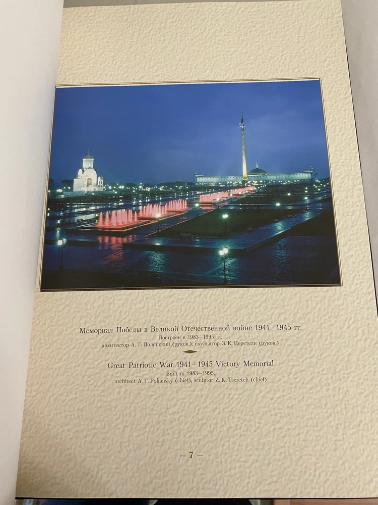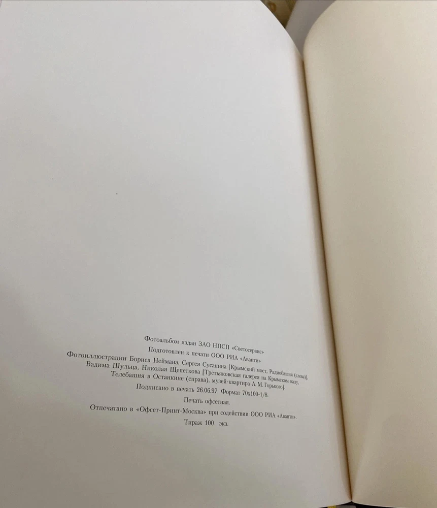 Extremely Rare Commemorative Edition – Only 100 Copies Printed Offered here is a remarkable piece of Moscow history: Lights of Moscow , a large-format photographic tribute celebrating the city's 850th anniversary in 1997. This exquisite photo album was produced in a strictly limited edition of just 100 copies , making it an exceptional collector’s item rarely seen on the market. Prepared for printing by RIA Avanti LLC and published by ZAO NPSP "Svetoservis", the book features powerful and atmospheric night-time photography of Moscow’s most iconic landmarks, including the Crimean Bridge, Ostankino TV Tower, Tretyakov Gallery, and Gorky's apartment museum. The contributing photographers — Boris Neiman, Sergey Susanin, Vadim Shults, and Nikolay Shchepetkov — capture the grandeur and spirit of a city at a historical milestone. Highlights: Printed in Moscow on June 26, 1997 Offset-printed on fine quality paper, large 70x100 1/8 format Housed in its original protective slipcase No writing, markings, or inscriptions – clean and well-preserved Intended as a gift or presentation edition for officials or dignitaries This was not sold to the general public and was likely reserved for institutional or ceremonial distribution. Whether you’re a collector of Russian memorabilia, a fan of architectural photography, or seeking a rare gift with cultural and historical depth, Lights of Moscow stands as a beautifully produced artifact from a momentous occasion. Don’t miss the chance to own this scarce and elegant piece of modern Russian history. Only 100 exist — and even fewer have survived in such excellent condition.