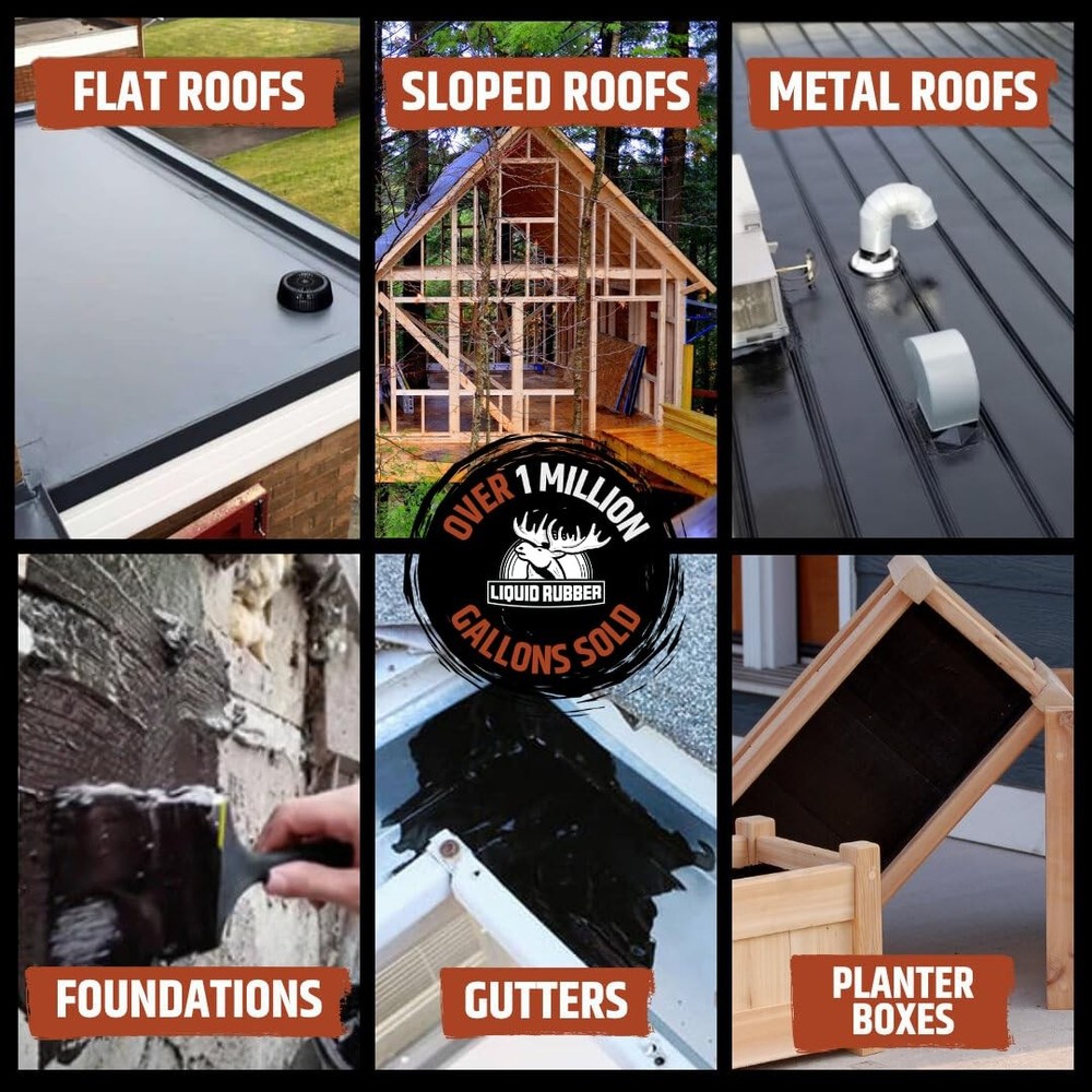 Liquid Rubber Waterproof Sealant is a premium waterproofing solution that creates a seamless, flexible membrane for ultimate protection against leaks and water damage. This professional-grade roof coating combines quality bitumen polymers with ease of use to deliver long-lasting results for any DIY or professional project. Transform your flat roof, metal roof, or low slope roof with a durable protective barrier that prevents leaks and extends the life of your structure. Our industrial-grade formula also excels at foundation waterproofing, gutter repair, concrete sealer applications, planter boxes, and more. The high-performance elastomeric membrane creates a watertight seal that stands up to harsh weather conditions. Technical Results with Simple Application: Unlike complicated roof repair systems, Liquid Rubber applies easily with standard tools - simply use a brush, roller, or sprayer. The formula provides excellent coverage and adhesion to most building materials. For flat/standing water surfaces, apply 3-4 heavy coats to achieve a 60-80 mil membrane (1 gallon covers approximately 15 sq ft). For vertical surfaces like foundations, apply 2-3 heavy coats (1 gallon covers approximately 30 sq ft). Advanced Formula for Challenging Projects: Our water-based formula contains no solvents, VOCs, or harmful odors, making it safer than traditional roof tar or solvent-based sealants. Integrated Waterproofing System: For maximum protection and longevity, use Liquid Rubber Seam Tape or Geo-Textile to reinforce seams, joints, and areas prone to movement. This approach creates a bulletproof waterproofing system that prevents leaks before they start. With millions of gallons sold, Liquid Rubber is used by contractors and professional applicators who demand superior results. Don't settle for sealants that crack and peel - choose the premium waterproof sealant that delivers lasting protection and reliability for your roof, foundation, or basement waterproofing project. INDUSTRIAL STRENGTH BITUMEN FORMULA - Create a seamless waterproof membrane on flat roofs, metal roofs, low slope roofs, foundations, gutters, concrete surfaces, planter boxes, and more. Our premium liquid rubber forms a durable barrier against water infiltration where other sealants fail. Superior alternative to traditional roof tar or patch products SUPERIOR FLEXIBILITY & DURABILITY - With over 950% elongation, this waterproof sealant maintains adhesion even with building movement and temperature changes. Our sealant is designed to resist cracking, peeling, and UV damage. Creates a flexible rubberized coating that delivers long-lasting protection PROFESSIONAL COVERAGE SPECIFICATIONS - Brush, roll or spray on - For flat/low slope roofs & standing water surfaces: 1 gallon covers 15 sq ft (3-4 heavy coats to achieve 60-80 mil membrane). For vertical surfaces like foundations: 1 gallon covers 30 sq ft (2-3 heavy coats for 30 mil membrane). Ideal for both roof repair and preventative maintenance applications WATER-BASED ADVANCED FORMULA - Unlike harsh roof tar or solvent-based products, our water-based formula contains no VOCs or harmful odors, making it perfect for indoor and outdoor use. Doesn't damage foam insulation or sensitive materials. Perfect for waterproofing projects in confined spaces ENGINEERED WATERPROOFING SYSTEM - For maximum protection, use with Liquid Rubber Seam Tape or Geo-Textile to bridge joints, seams, vents, skylights, and protrusions where movement may occur. Creates a comprehensive waterproofing system for long-lasting leak repair and prevention on your roof, basement, or foundation USED BY PROFESSIONALS & DIYers ALIKE - With millions of gallons sold, Liquid Rubber is the go-to choice for contractors, property managers, and homeowners tackling projects from roof leak fixes to basement waterproofing. Our high-performance formula delivers professional results whether you're an experienced pro or a first-time DIYer PREMIUM ADHESION TECHNOLOGY - Superior adhesion to most building materials including metal, concrete, wood, and more. This hardware sealer can remain tacky after curing - NOT suitable for walking surfaces such as walkways, patios or decks. Use for waterproofing applications where foot traffic where foot traffic is minimal or not needed