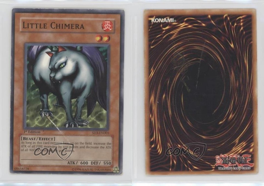 2005 Yu-Gi-Oh! Blaze of Destruction - Structure Deck [Base] - 1st Edition #SD3-EN005 Little Chimera COMC Item: 122874826 - YuGiOh Card - Featuring Little Chimera Search for more: 2005 Yu-Gi-Oh! Blaze of Destruction Search for more: 2005 Yu-Gi-Oh! Blaze of Destruction - Structure Deck [Base] - 1st Edition View all of our Listings Auctions Buy It Now About Us Located in the beautiful Pacific Northwest, COMC (Check Out My Cards) is the world's largest consignment service for trading card singles. More than 10,000 people have used our consignment service to list over 50 million trading cards. Find out how we can help you consign your items on eBay by contacting us through eBay messaging. COMC -- "The Safe & Easy Way to Buy & Sell" Raw Condition for Modern Cards Unless otherwise noted, raw modern cards are listed in Near Mint-Mint condition or better. A NM-MT card appears to be Mint at first glance, but upon closer inspection, may exhibit some of the following: minor print defects (e.g. roller marks, print line, dimple), minor scratches, slight edge wear, and slight corner wear. Centering is clearly visible in the images provided and does not factor into our condition assessment. Raw Condition for Vintage Cards Unless otherwise noted, raw vintage cards are listed in Excellent condition or better. An EX card may exhibit some of the following: minor rounding of corners, surface wear, print defects, light scratches, and slight edge wear/chipping. Centering is clearly visible in the images provided and does not factor into our condition assessment. Domestic Shipping Combined shipping for multiple items is available. To receive combined shipping, please ensure all desired items are in your eBay shopping cart before proceeding to checkout. eBay limits orders to 40 items per order. We automatically combine multiple orders placed on the same day. If you place multiple orders on the same day, please contact us to request a refund of applicable shipping costs. Signature confirmation may be required on invoices over $400. All cards are protected and shipped securely. International Shipping COMC offers eBay's International Shipping (EIS) for international orders under $2,500* (see country exceptions below). All duties and import fees are paid at checkout; in the rare event that there are additional import fees upon delivery, these are borne by the buyer. EIS packages route through a shipping hub in Erlanger, KY before shipping to their final destination. Please note that EIS does not allow for combined shipments. The shipping rates are determined by eBay and cannot be adjusted. *Maximum sale price exceptions: Colombia, Kuwait ($2,000); Taiwan ($1,539); Chile, Costa Rica, Guatemala, Honduras, Trinidad and Tobago ($1,000); Antigua and Barbuda, Aruba, Belize, Dominica, Grenada, Philippines, Saint Kitts and Nevis, Saint Lucia, Montserrat, Turks and Caicos Islands ($500); Dominican Republic, El Salvador ($200). Please request a shipping quote through eBay messaging for orders that exceed the maximum sale price supported by eBay's International Shipping. You will be responsible for all duties and import fees for international orders shipped outside the EIS. All cards are protected and shipped securely. Payment COMC does not accept offers on our cards through our eBay storefront. COMC utilizes eBay’s managed payments system. If you are experiencing difficulties making a payment, please contact eBay for assistance. Return Policy Returns are only accepted on the rare occasion the item is not as described. If you are making a return, please initiate the return process through eBay so a mailing label can be provided for you. Prior to listing, our expert team carefully assessed this item to represent it accurately. Please review the description and high-definition images prior to purchasing to ensure this item meets your satisfaction. We welcome you to contact us if you have further questions about this item. Trust and Integrity COMC carefully assesses each item consigned to us to prevent fraudulent items from entering the marketplace. If you believe an item offered on COMC may be fraudulent, please contact us with details so we can investigate the issue. Items we determine are outside our supported items policy may be removed. Last Modified: 6/2/2025 3:28:36 AM PDT