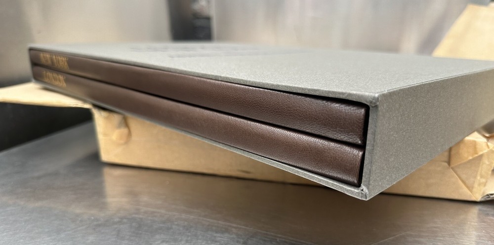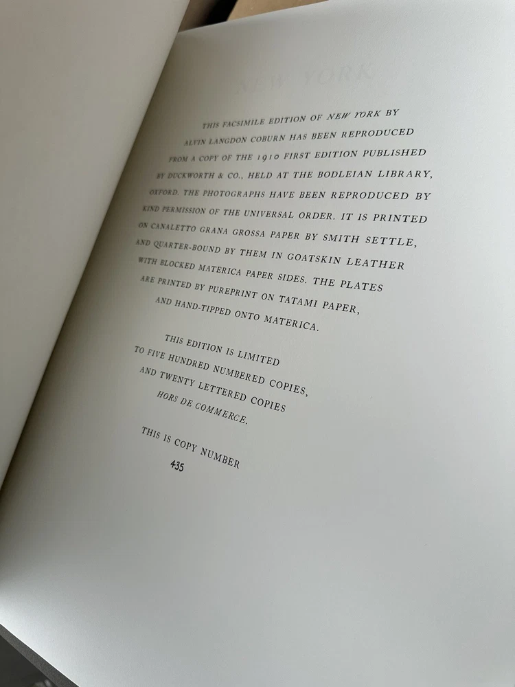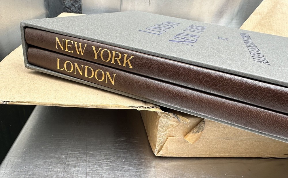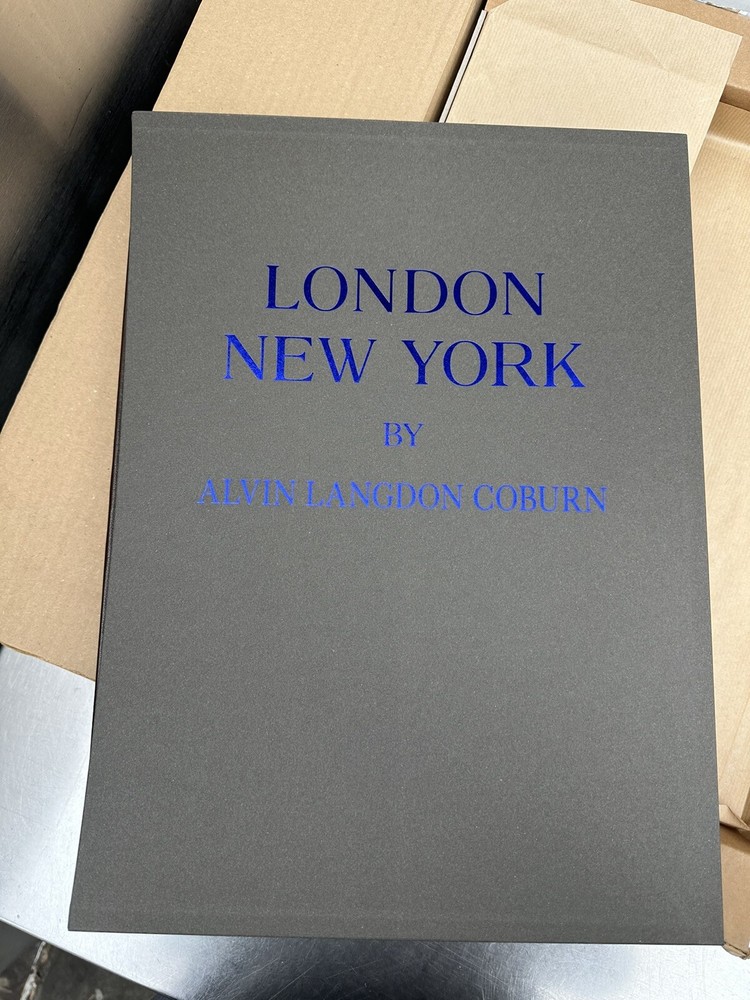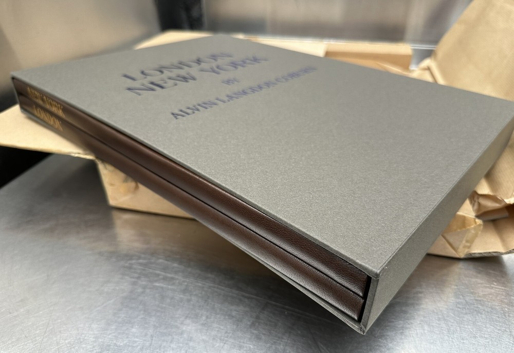 London & New York by Alvin Langdon Coburn. Folio Society. Limited 500 copies, the is number 435. Album contains two volumes, one is London, and one is New York. This was purchased as a gift for someone, and the way it is packed in the cardboard box shown is how it came from Folio Society. It arrived late from UK, and it has just sat in my home in the box it came in since I received it. Book is new. It was opened upon receiving, and the New York copy was opened to the first page to see what number this book was. This will come as it is shown in the box shown. Comes as shown. See picture for details.