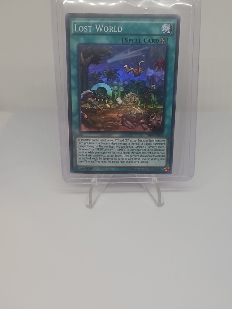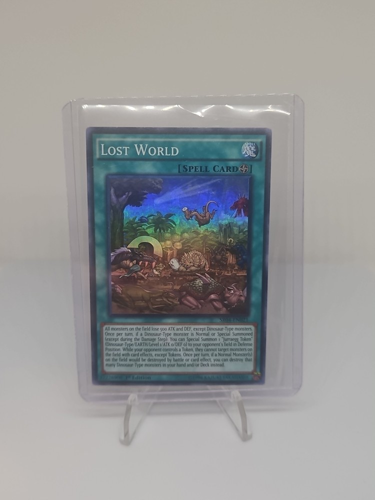 Elevate your Yu-Gi-Oh! TCG gameplay with the formidable "Lost World" card from the Structure Deck: Dinosmasher's Fury-1st Edition set. As a Spell-Field card, it offers strategic depth by affecting all monsters on the field, stripping them of their ATK and DEF, except for Dinosaur-Type monsters. This card also allows you to capitalize on your opponent's Token usage, denying them the ability to target monsters with card effects while they control a Token. "Lost World" is a Super Rare card with the card number SR04-EN021, printed in English and manufactured by Konami. It's a must-have for any serious player or collector, featuring the 1st Edition marker, indicating its rarity and potential value. Once you've unlocked its potential in your deck, "Lost World" stands ready to even the playing field in your duels.