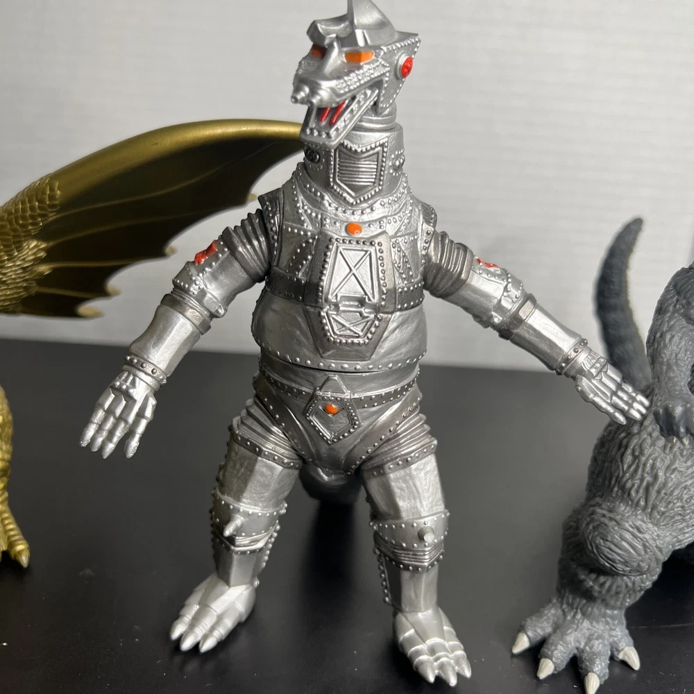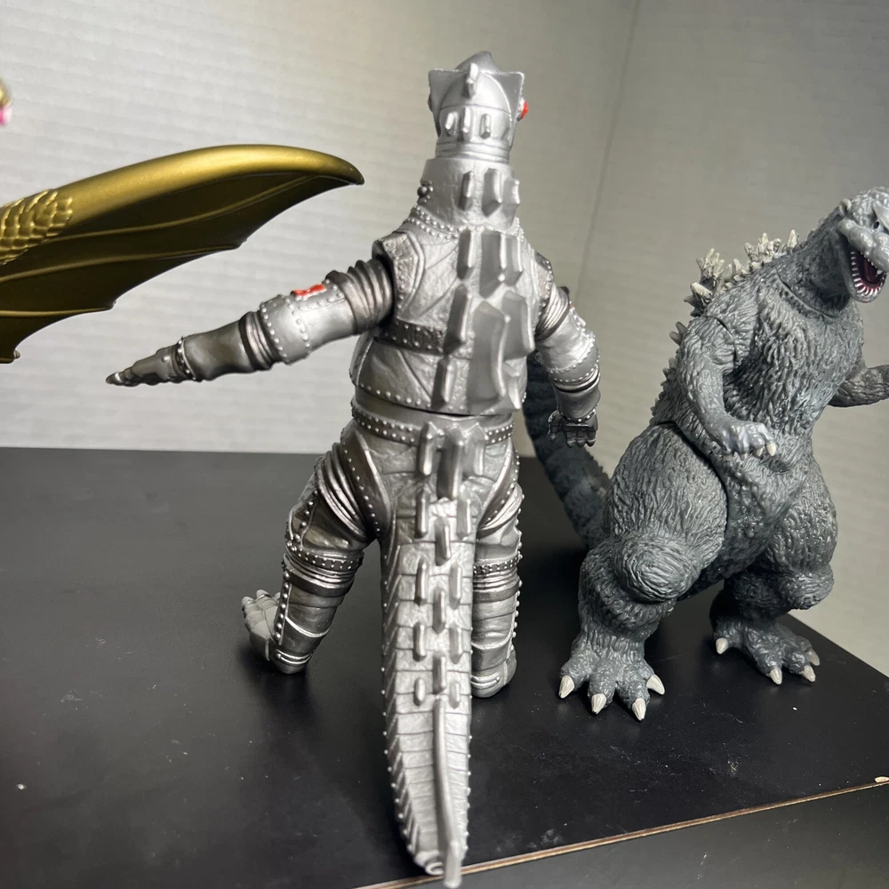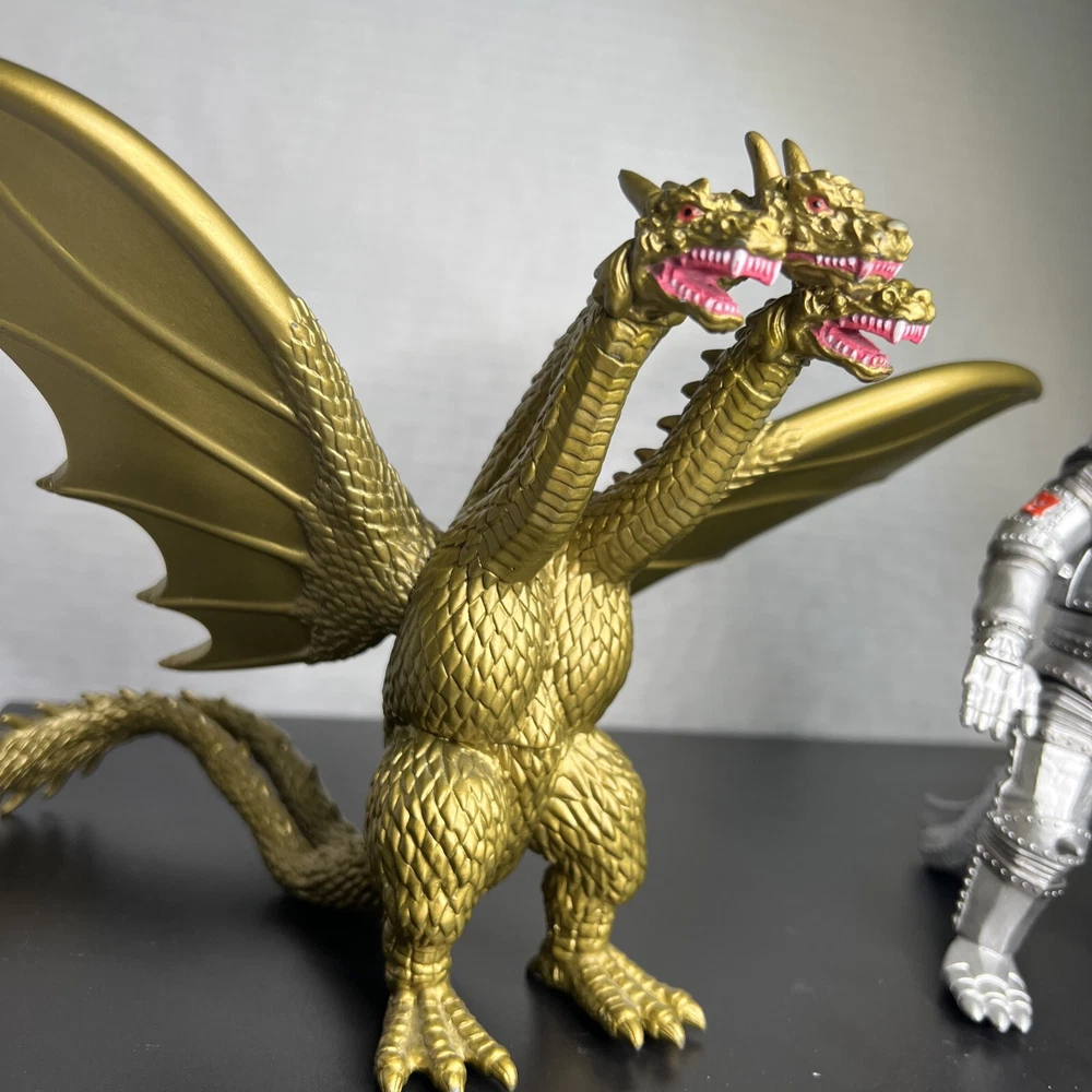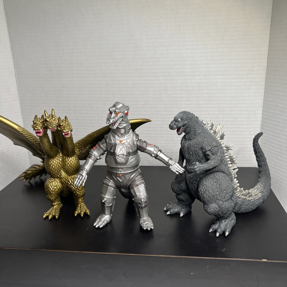 The product is a set of three Godzilla figures and three headed dragon figures by Toho, Bandai, and Neca. These figures are part of the Godzilla theme and are likely intricately detailed and poseable. Perfect for collectors or fans of the Godzilla franchise, this lot offers a variety of iconic characters to add to any collection of monsters, robots, and space toys. One Godzilla is missing part of finger and a spike in its back The other two seem to be complete .