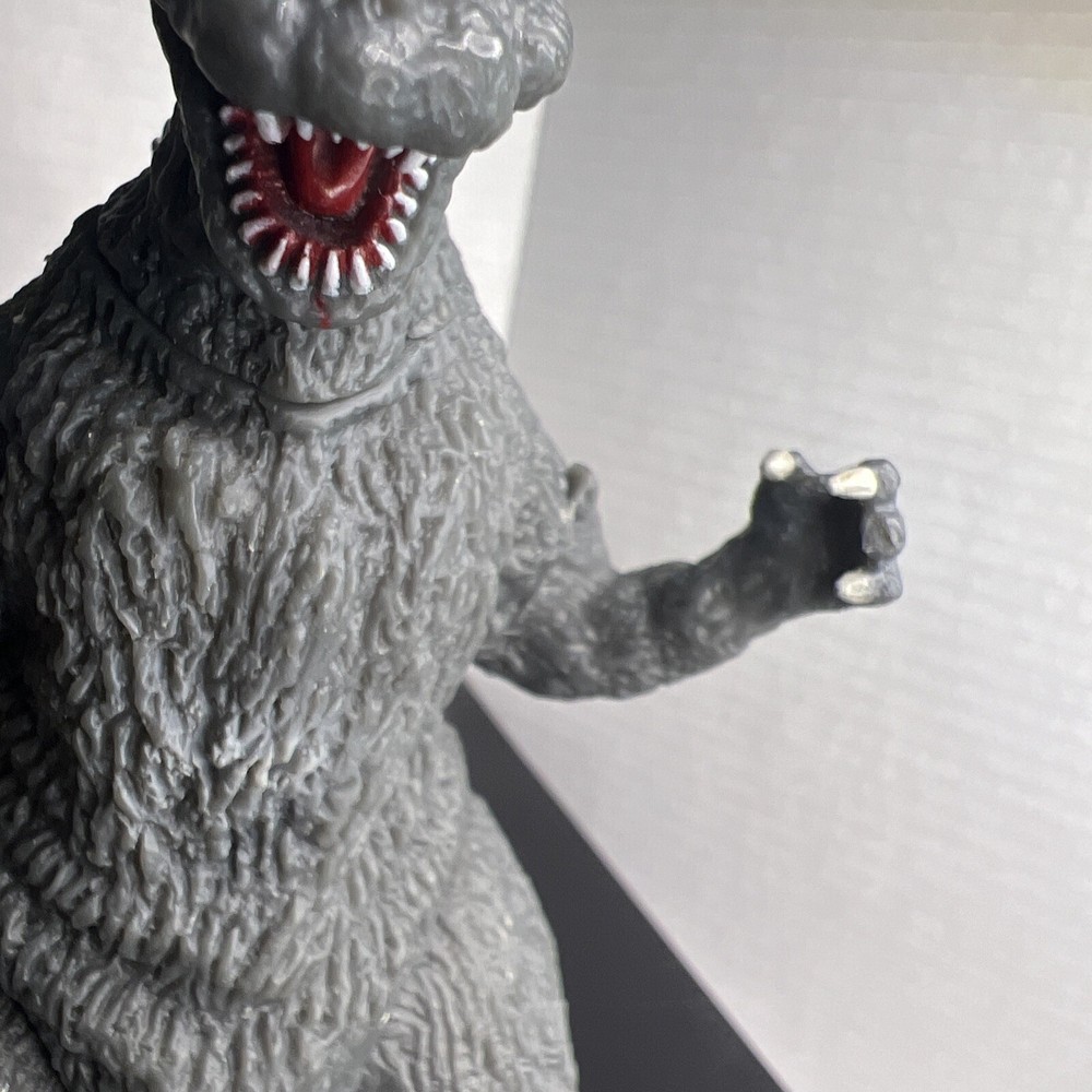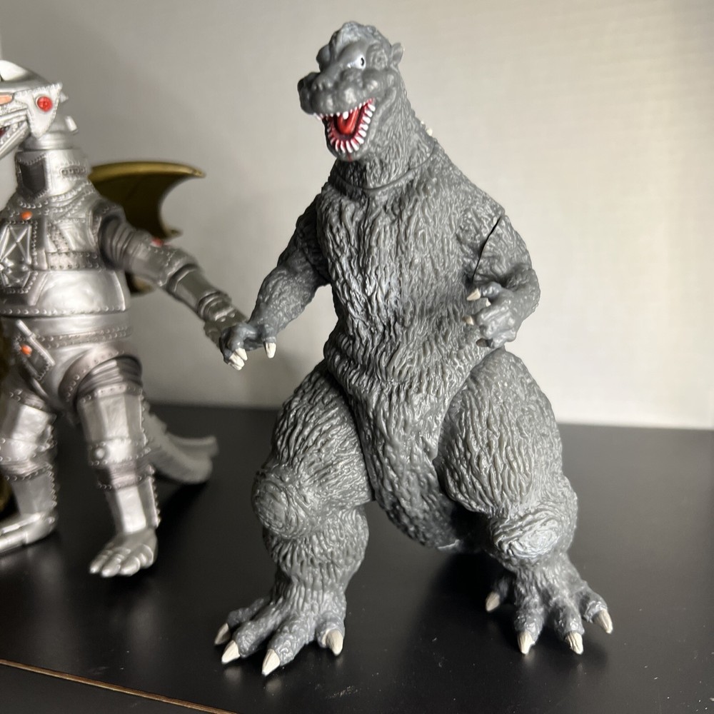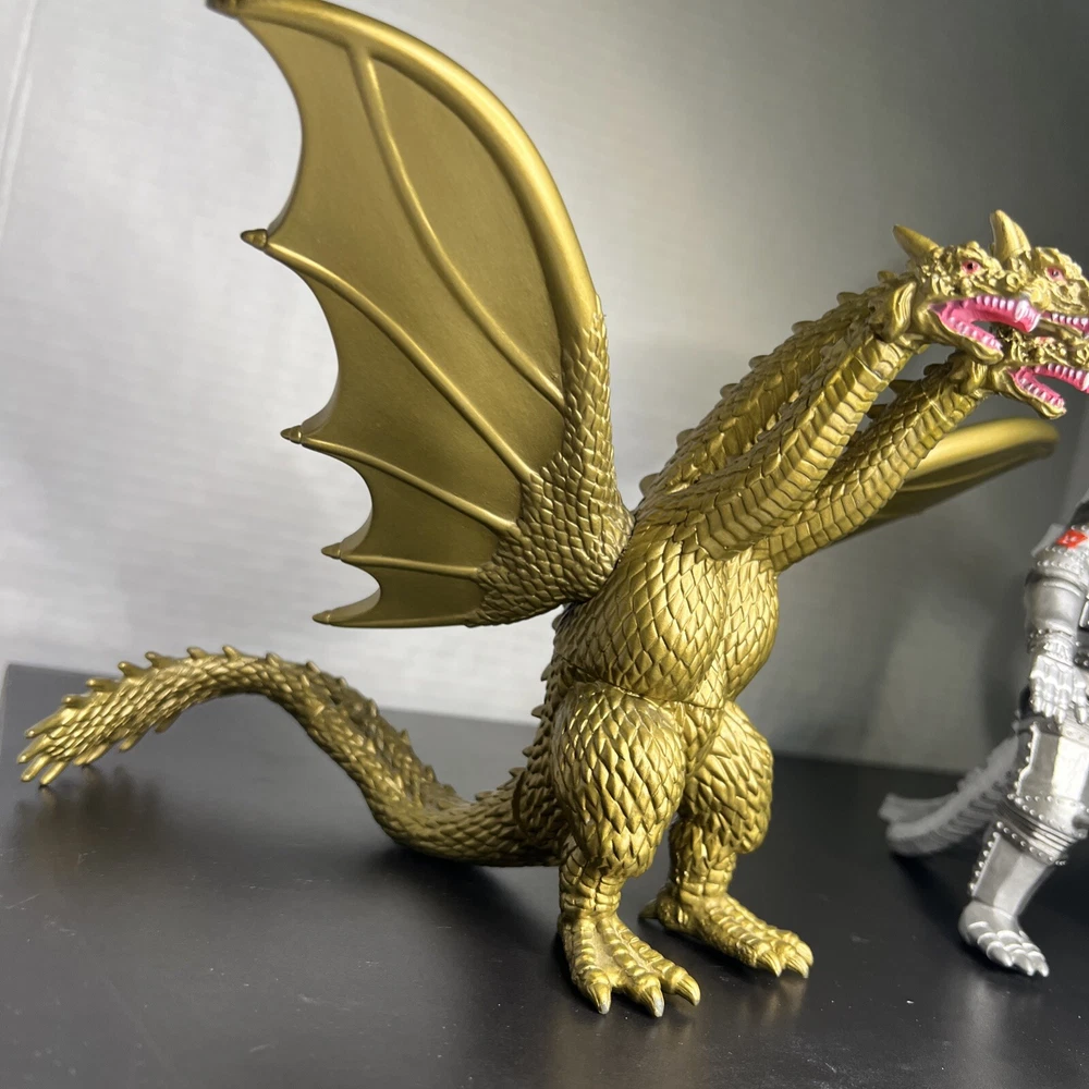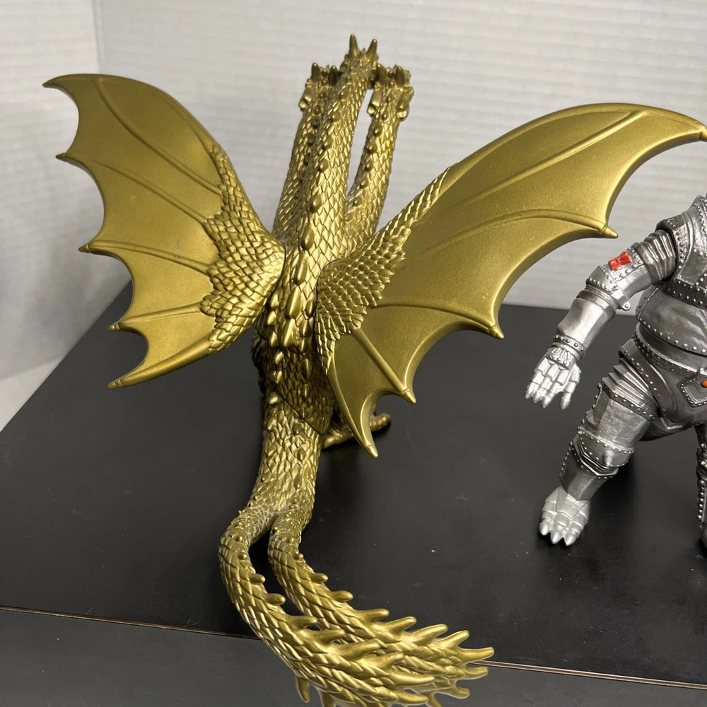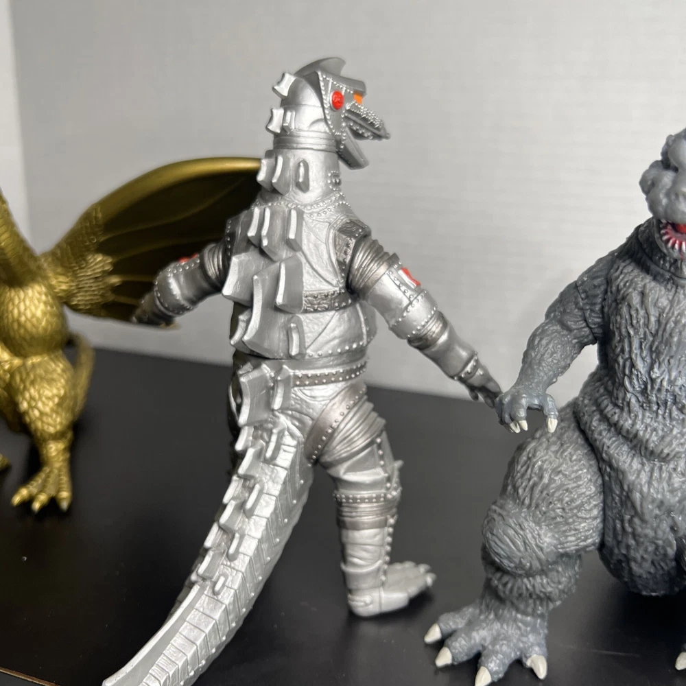 The product is a set of three Godzilla figures and three headed dragon figures by Toho, Bandai, and Neca. These figures are part of the Godzilla theme and are likely intricately detailed and poseable. Perfect for collectors or fans of the Godzilla franchise, this lot offers a variety of iconic characters to add to any collection of monsters, robots, and space toys. One Godzilla is missing part of finger and a spike in its back The other two seem to be complete .