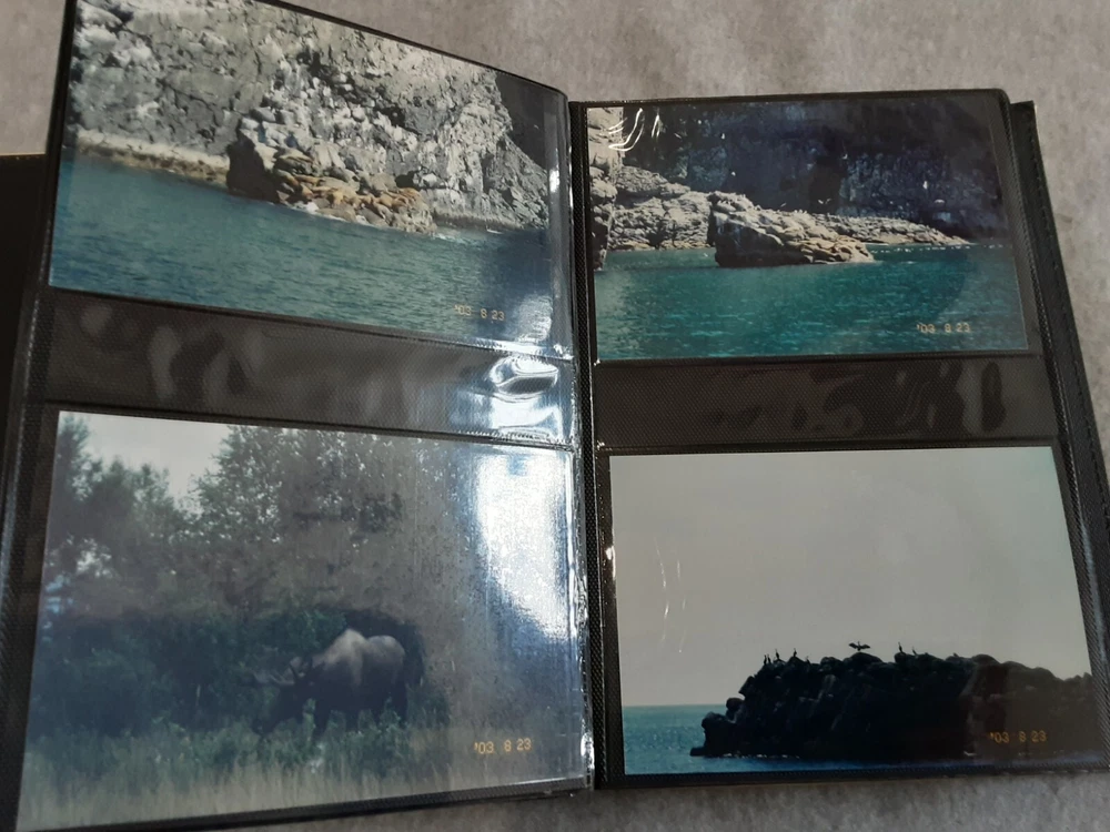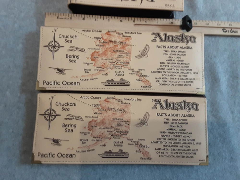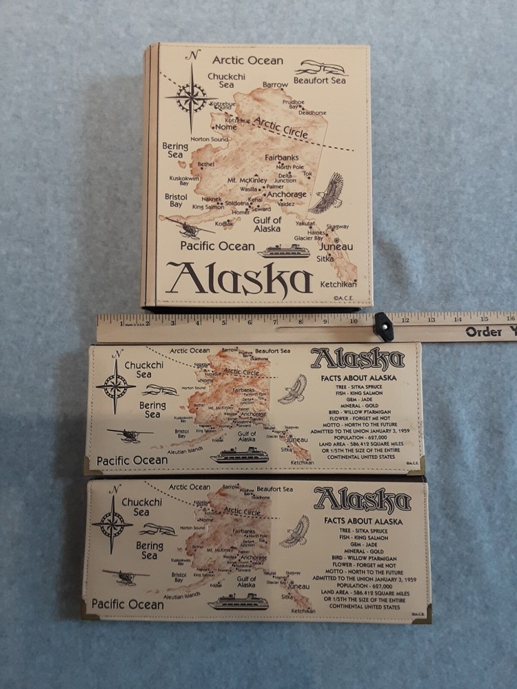 Lot of 3 Alaska Vacation Photo Albums Embossed Map Faux Leather 200 photos. These 3 albums are in good, pre-owned condition. The larger square one holds 200 pics and includes labels that can be inserted on each page. Two of the plastic film covers has torn loose as shown in pics but overall very nice. Holds 4x6 pics. The other two albums hold 24 pics each and I measured a pic left in album and it is 11.25x4. One of these has just a bit of adhesive on cover as shown circled in pic. I left any pics that were in album. There aren't many but in case someone could enjoy them they have been left. EBSBKS770100921