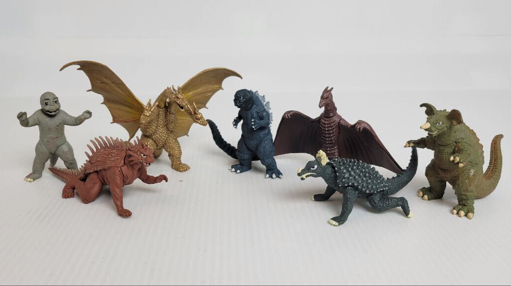 Minya has paint marks all over. Ghidorah has paint marks on his wings. Baragon has some paint marks on his body and horn tip. Rest of the figures are in good condition.