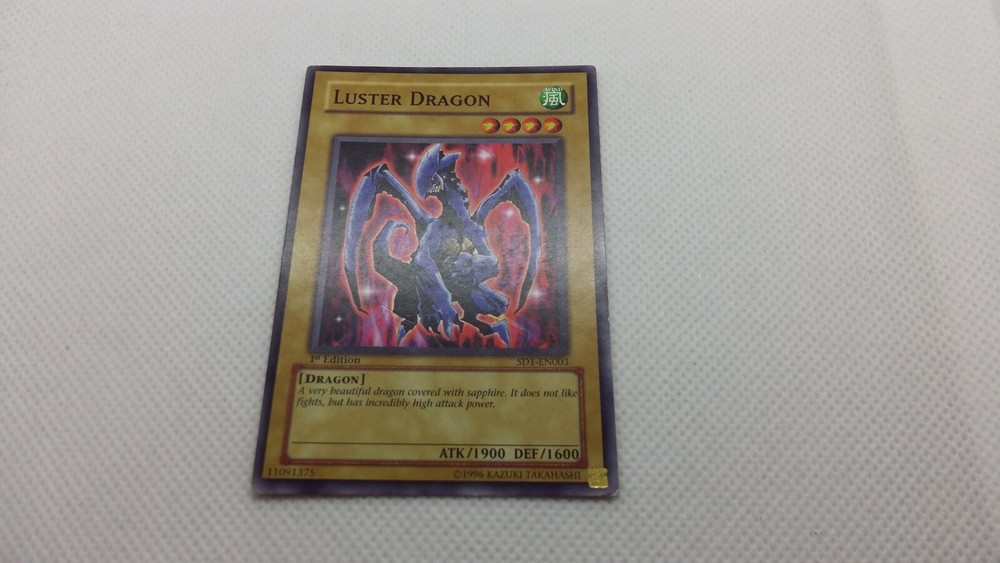 This rare and highly sought-after Luster Dragon card from the Yu-Gi-Oh! TCG is now available in its original 1st edition form. The card features a stunning attack power of 1900 and a defense/toughness of 1600, making it a formidable addition to any collection. The card is part of the Structure Deck: Dragon's Roar set and has a card number of SD1-EN003. It is manufactured by Konami and is in English language. This card is a must-have for any serious collector or Yu-Gi-Oh! player. Don't miss your chance to own this incredible piece of dragonic history!