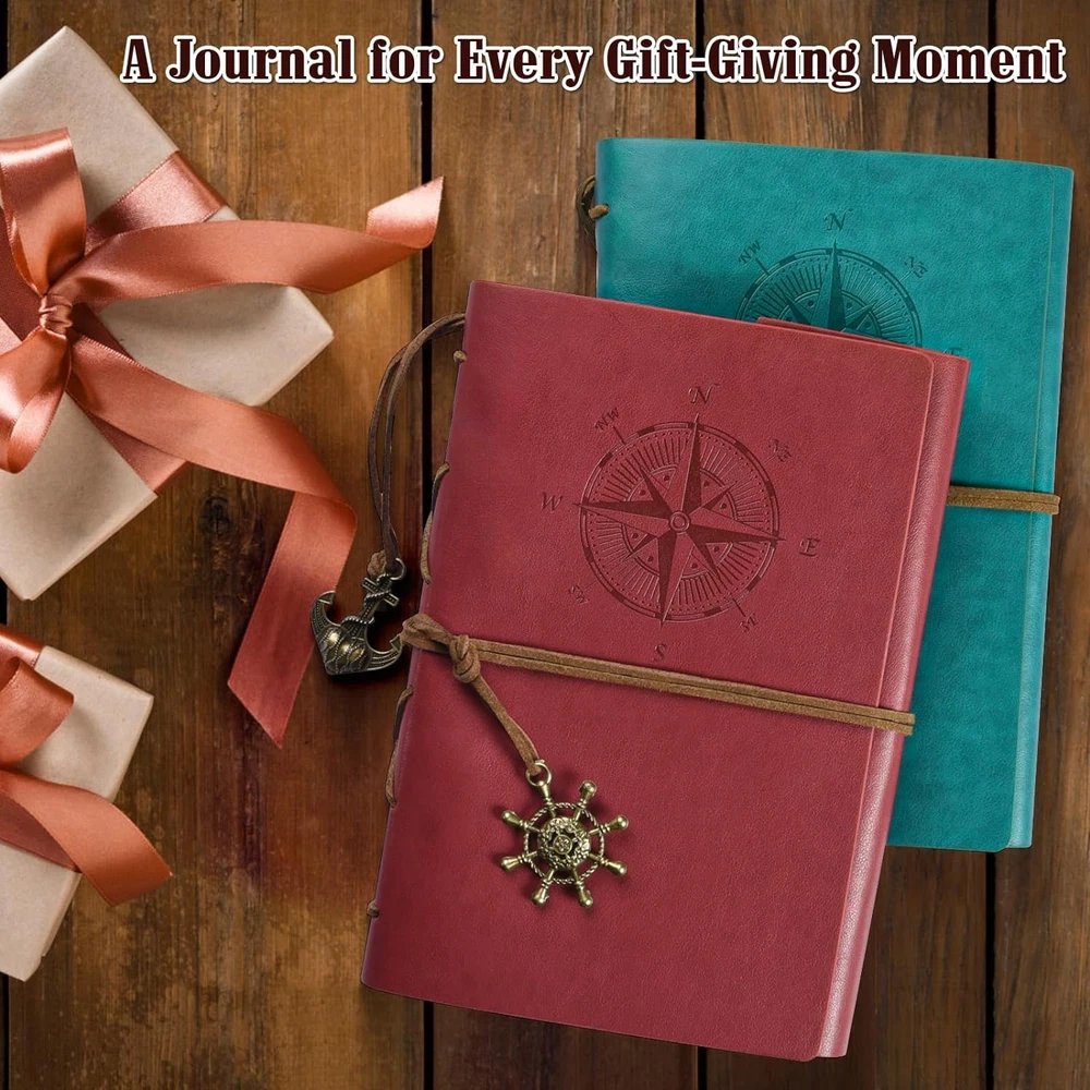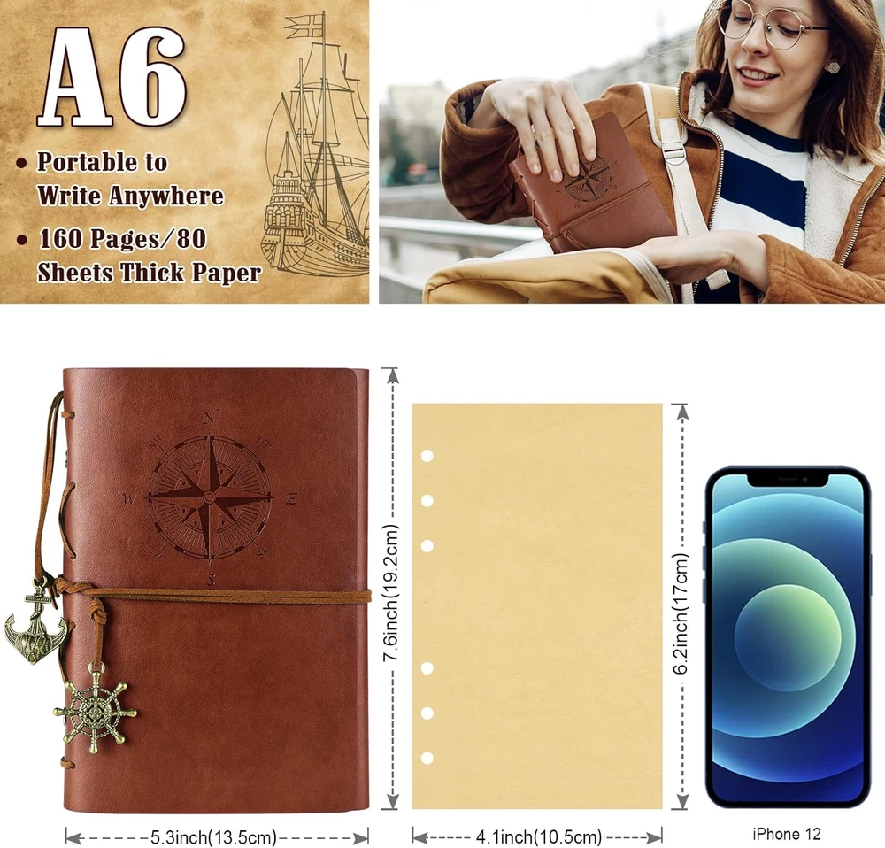 MALEDEN Leather Writing Journal Notebook, Classic Spiral Bound Notebook Refillable Diary Sketchbook Gifts with Unlined Travel Journals to Write in for Girls and Boys (Sky Blue) Blank Paper: No lined feature, you can draw mind maps, sketch ideas or write notes freely on the page.Perfectly work as writing journal, drawing pad, scetch book, travelers notebook, diary planner, coupon organizer, photo album and so on. Refillable Notebook: Take out pages that aren't important and swap in for blanks to keep filling it out.Take paper out or in easily so that you can record any instant memory no mater where and when you are. Leather Journal: Made of high quality PU leather,soft in hands,durable for travel or outdoor adventure.Inserts are craft paper which can keep your writing and drawing the same as beginning to help you reread easily in future.Both cover and insert work to give you a permanent memory. Convenient Journey Diary:Perfect size for handbag and schoolbag(5x7inch);Built-in small binder help you add refills planner,calender pages easily;Available for any pen,gel pen,pencil,ballpoint pen and so on.More surprise you will find when getting Maleden journal. MALEDEN Brand:Come with MALEDEN exquisite package.A perfect Birthday gift,Halloween gift,Christmas present for yourself,families and friends. Product Description Where Creativity Sets Sail: MALEDEN Journals Everyone will be captivated by the stunning compass rose embossed on the cover, which symbolizes direction, guidance, and the spirit of adventure. Capture your moments, dream your dreams, and navigate your way through the pages of this exquisite journal. Our compass-embossed journals are crafted using high-quality vegan leather materials, ensuring durability and elegance. You'll find that the cover feels smooth to the touch, and the compass design adds a subtle texture that's both visually appealing and tactile. Retro pendants adds more aesthetics. Perfectly works as bookmark. Inside, you'll discover a world of possibilities. The journal features plenty of blank pages, giving you the freedom to write, sketch, or plan your journeys. It's not just a journal; it's a canvas for your thoughts and creativity. Perfect for Travelers and Dreamers Whether you're an avid traveler, a dreamer with a wanderlust spirit, or someone looking to embark on a personal journey of self-discovery, our compass-embossed journal is an ideal companion. It's the perfect place to record your adventures, thoughts, and dreams. Looking for a thoughtful gift? Consider our compass-embossed journal. It's a symbol of guidance and inspiration, making it a meaningful present for friends, family, or loved ones who share your passion for exploration. Capture your moments, dream your dreams, and navigate your way The compass rose is a symbol of direction and guidance. It is often associated with exploration, travel, and the spirit of adventure, which suggests a desire for adventure, both in terms of physical journeys and personal exploration. What is the cover material? The journal is made of vegan leather, which is known for its durability and resistance to wear and tear and combines the aesthetics and texture of traditional leather with ethical and eco-conscious principles. Why choose blank paper? Blank Paper provides a canvas for a wide range of creative and practical uses. Its flexibility allows everyone to tailor its purpose to their unique needs and interests, making it a versatile and customizable tool for self-expression. Does the paper ink bleed? No. All paper is premium kraft paper, no bleeding and no smearing for pens, marker to journaling. Is there suitable refills availble for it? Yes, we provide suitable sizes and many styles sheets for refillable journal. There are lined, dotted, graph and refills set. Please go to MaleDen store to purchase. Will it be a perfect gift for holiday and birthday? Yes, there are more than 50000 people choose our journal as the first gift choice.