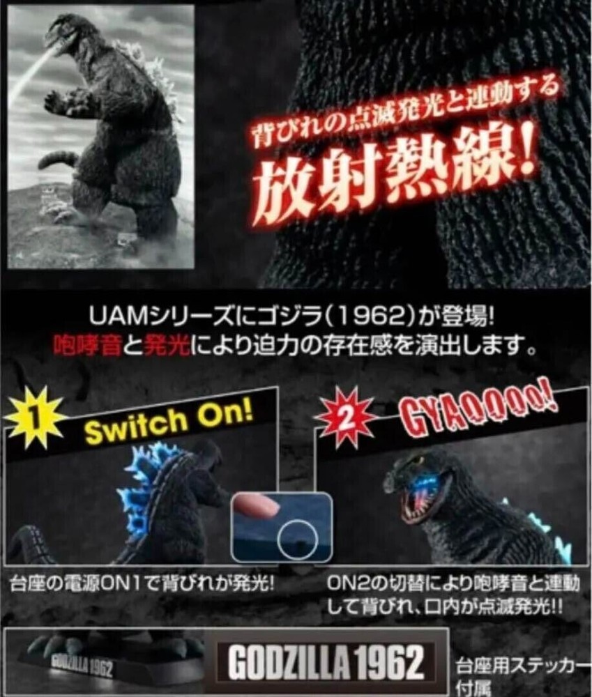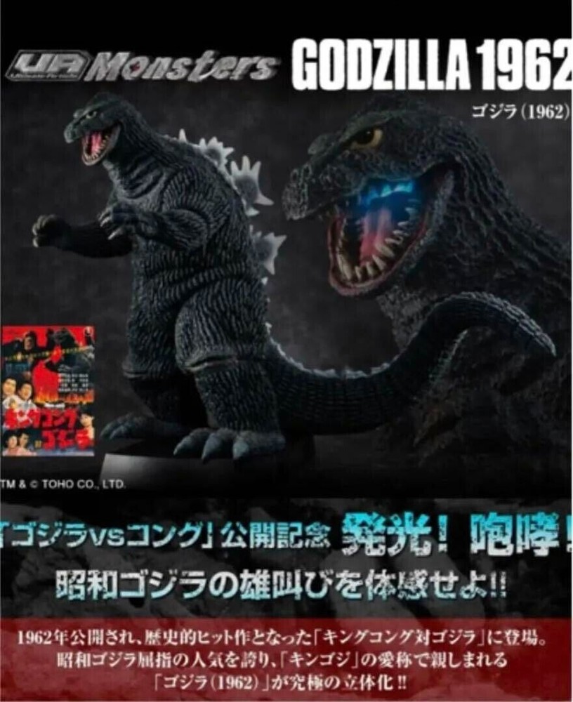 Bring home the epic 1962 battle between Godzilla and King Kong with this MegaHouse UA Monsters battery powered light-up action figure. This figure features intricate details of the beloved characters from the acclaimed Godzilla vs King Kong movie franchise. The packaging is original and has been opened to verify the light-up figure as working. The figure is still unopened and wrapped in its original plastic. Released in 2023, this high-quality action figure is a must-have for any fan of the franchise. Add it to your collection and relive the iconic scenes from the movie. Don't miss out on the opportunity to own this amazing piece of memorabilia. SHIPS FROM USA