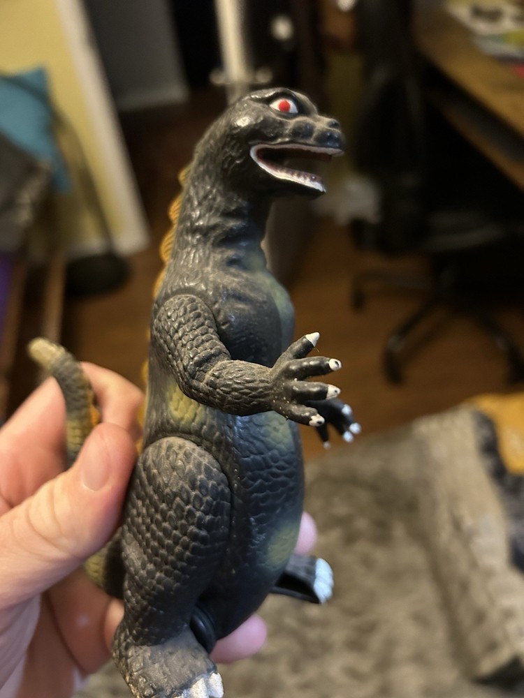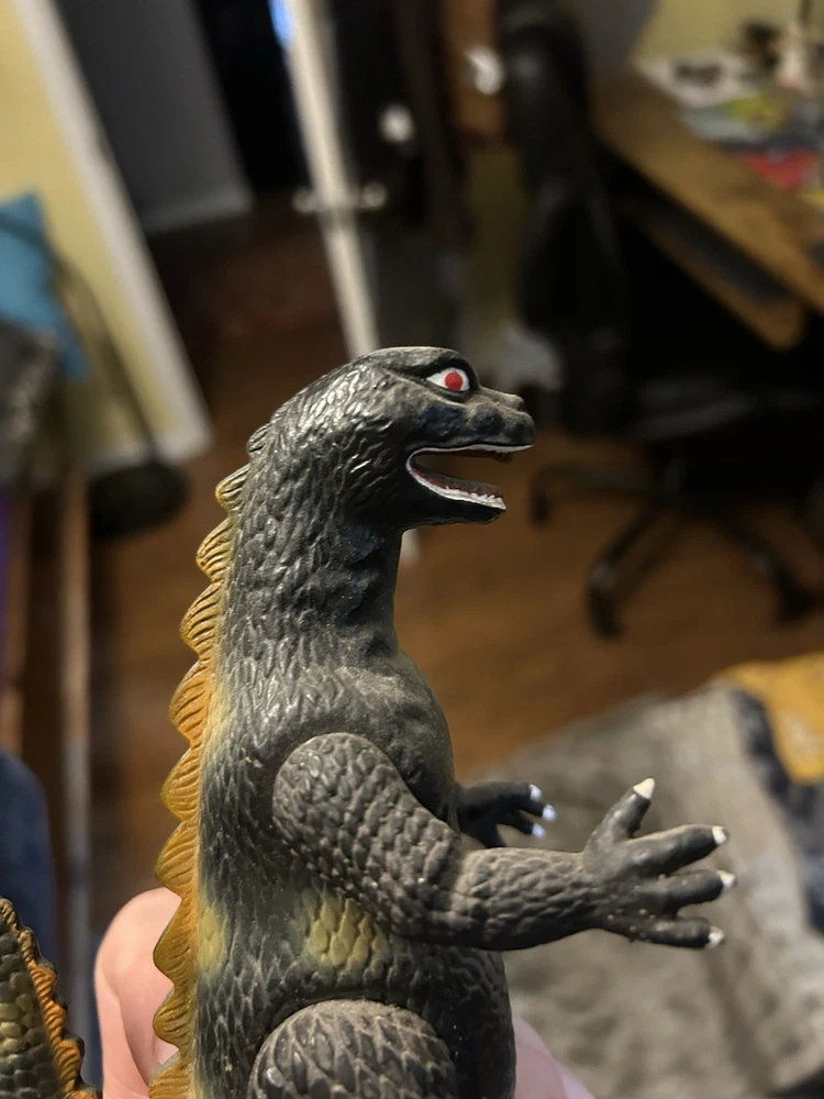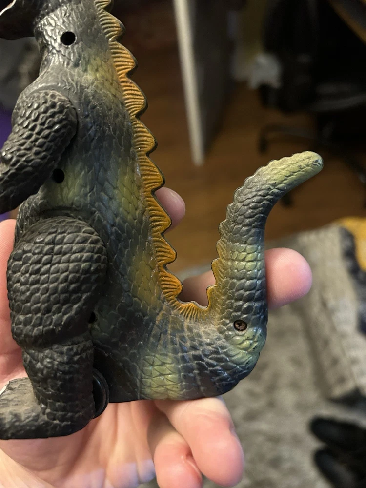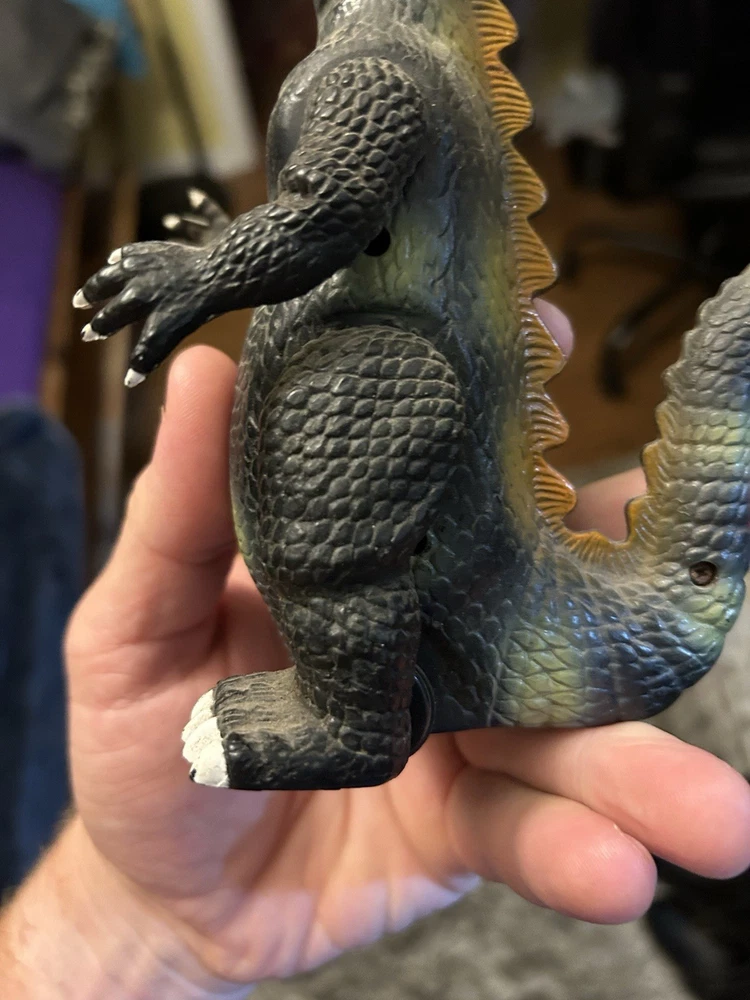 This vintage, Godzilla pull toy, pull action figure is a rare and hard to find peace. I do not have the original box, but everything on the toy does still function. The pullback function does still work and it does show normal signs of where for vintage age and does have a few spots of color loss on the white fingertips and white tips of the toes, but other than that, it is still in great shape. This would be an excellent addition to any collection. Please zoom in on photos and please ask any questions that you might have before purchasing. Payment is due at time of purchase, all items are sold as is and all sales are final. No returns accepted.