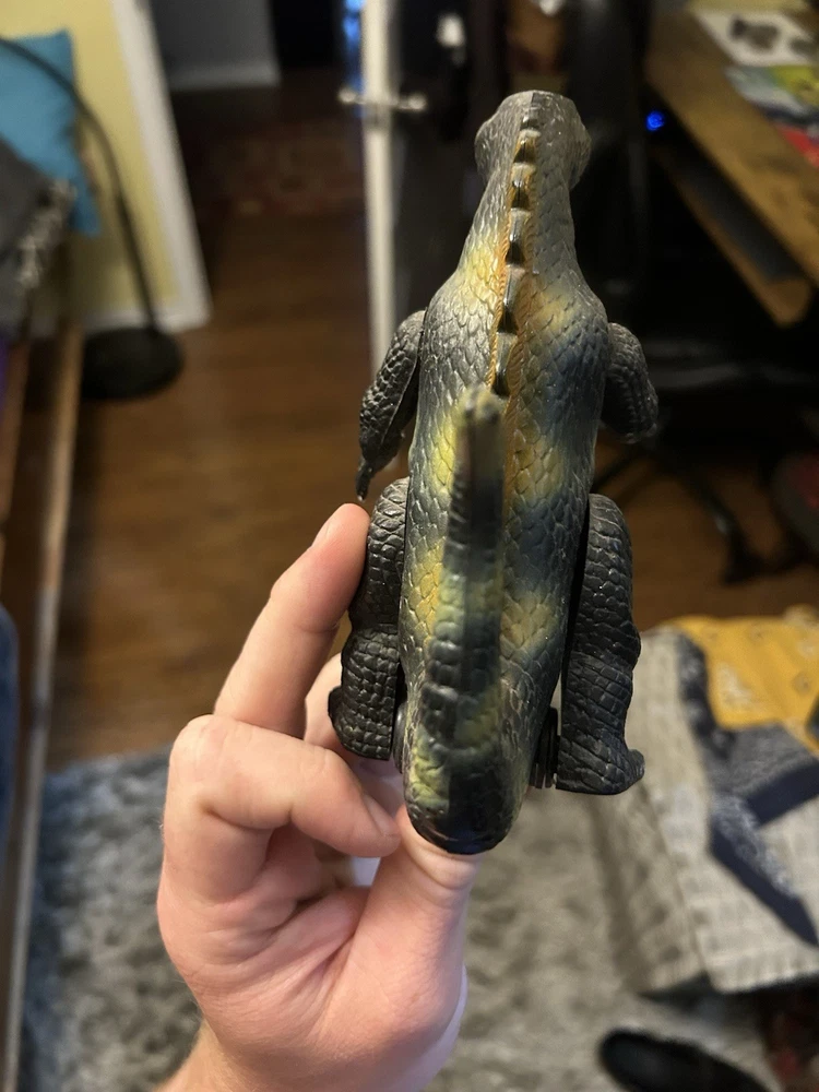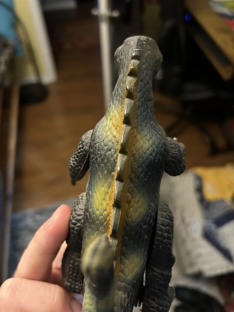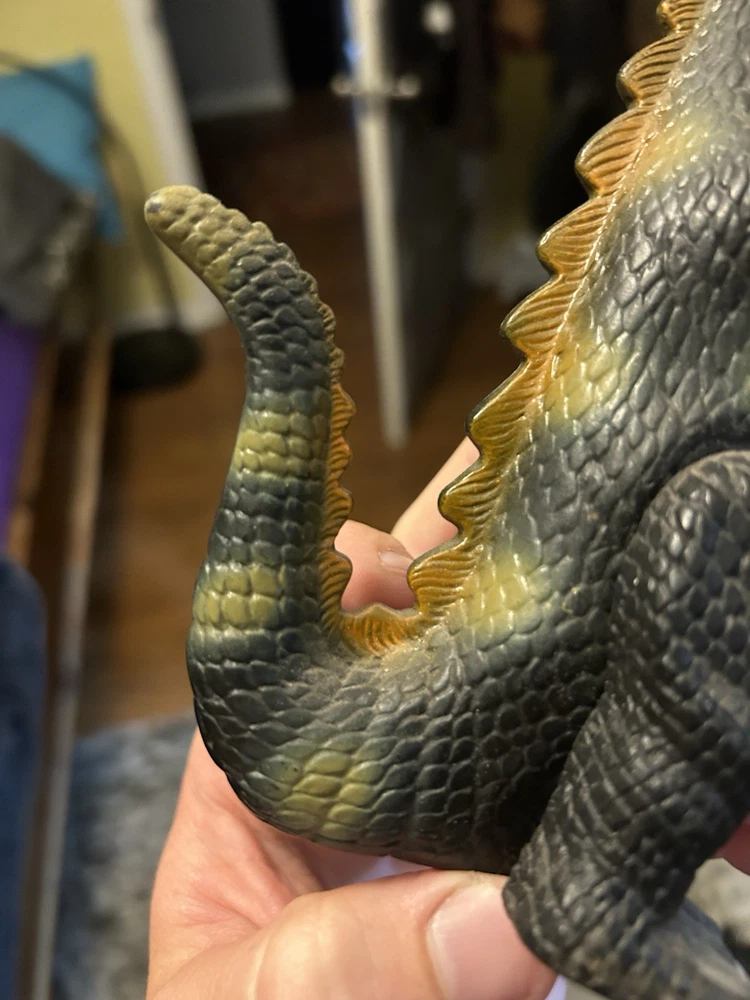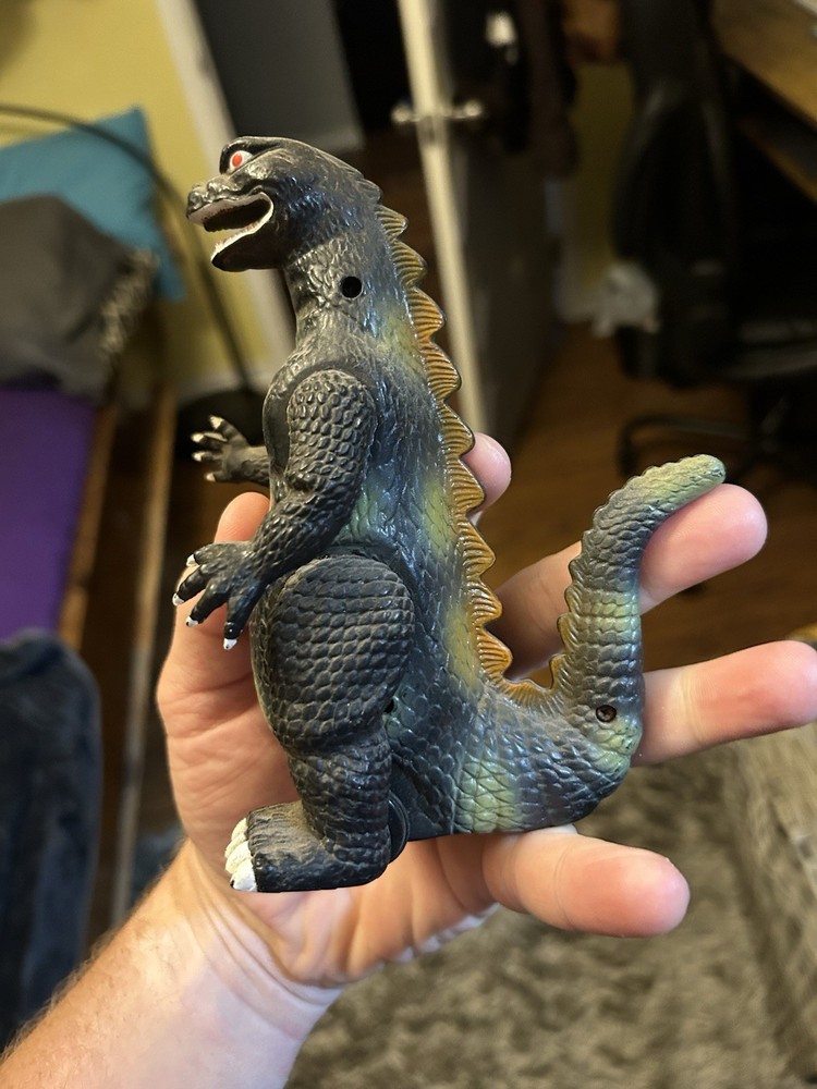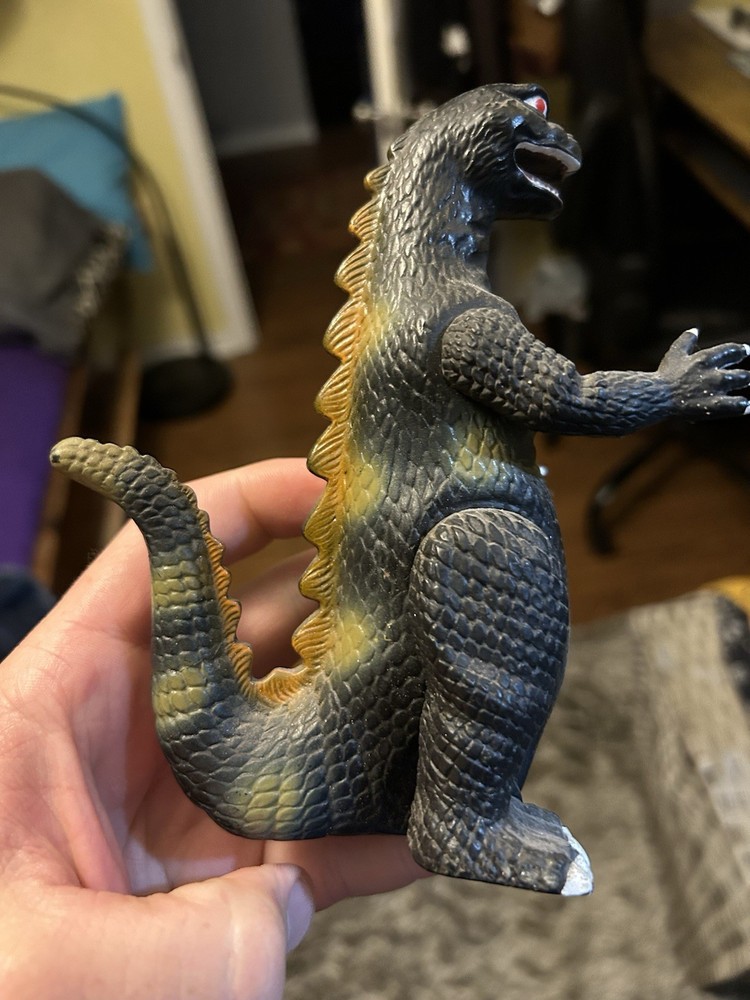 This vintage, Godzilla pull toy, pull action figure is a rare and hard to find peace. I do not have the original box, but everything on the toy does still function. The pullback function does still work and it does show normal signs of where for vintage age and does have a few spots of color loss on the white fingertips and white tips of the toes, but other than that, it is still in great shape. This would be an excellent addition to any collection. Please zoom in on photos and please ask any questions that you might have before purchasing. Payment is due at time of purchase, all items are sold as is and all sales are final. No returns accepted.