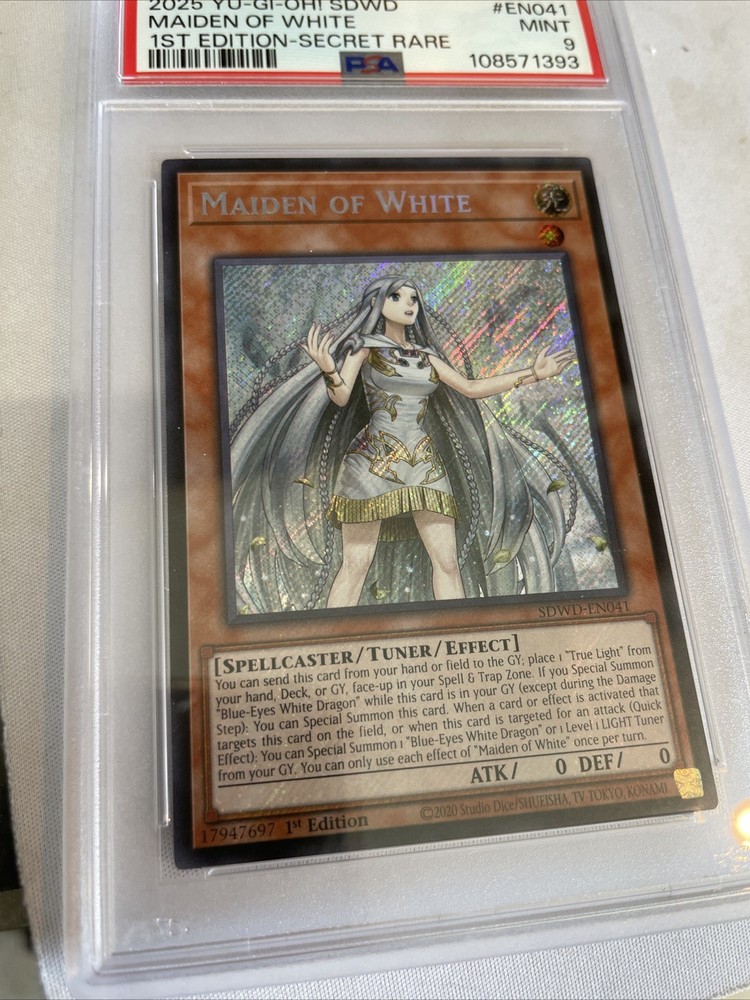 The "Maiden of White" card is a highly sought-after Secret Rare card from the Yu-Gi-Oh! TCG's Structure Deck: Blue-Eyes White Destiny. This Light attribute Spellcaster card, manufactured by Konami as a 1st Edition English version, features unique abilities as an Effect and Tuner card. With a card number of SDWD-EN041, this collectible card is a valuable addition to any Yu-Gi-Oh! card collection for fans and players alike.
