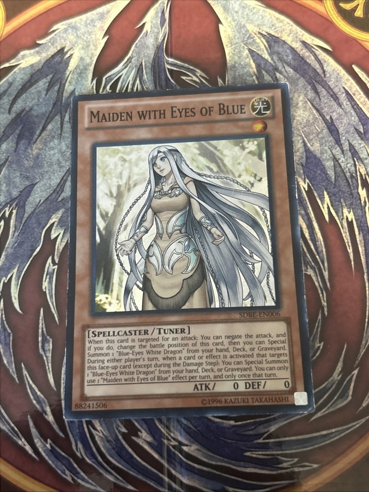 | Card Text | When this card is targeted for an attack: You can negate the attack, and if you do, change the battle position of this card, then you can Special Summon 1 "Blue-Eyes White Dragon" from your hand, Deck, or Graveyard. During either player's turn, when a card or effect is activated that targets this face-up card (except during the Damage Step): You can Special Summon 1 "Blue-Eyes White Dragon" from your hand, Deck, or Graveyard. You can only use 1 "Maiden with Eyes of Blue" effect per turn, and only once that turn. |