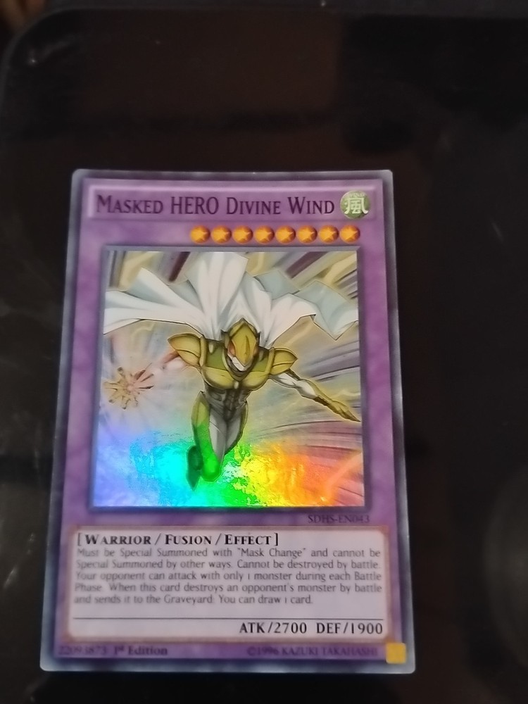 The Masked HERO Divine Wind SDHS-EN043 Structure Deck: HERO Strike 1st Edition is a super rare Yu-Gi-Oh! trading card manufactured by Konami. This English-language card features a Wind attribute, with a defense of 1900 and an attack power of 2700. As a Warrior-type card, it is part of the Structure Deck: HERO Strike set and belongs to the Effect and Fusion card types. The 1st Edition feature adds to its collectible value, making it a sought-after addition for fans and collectors of the Yu-Gi-Oh! TCG.