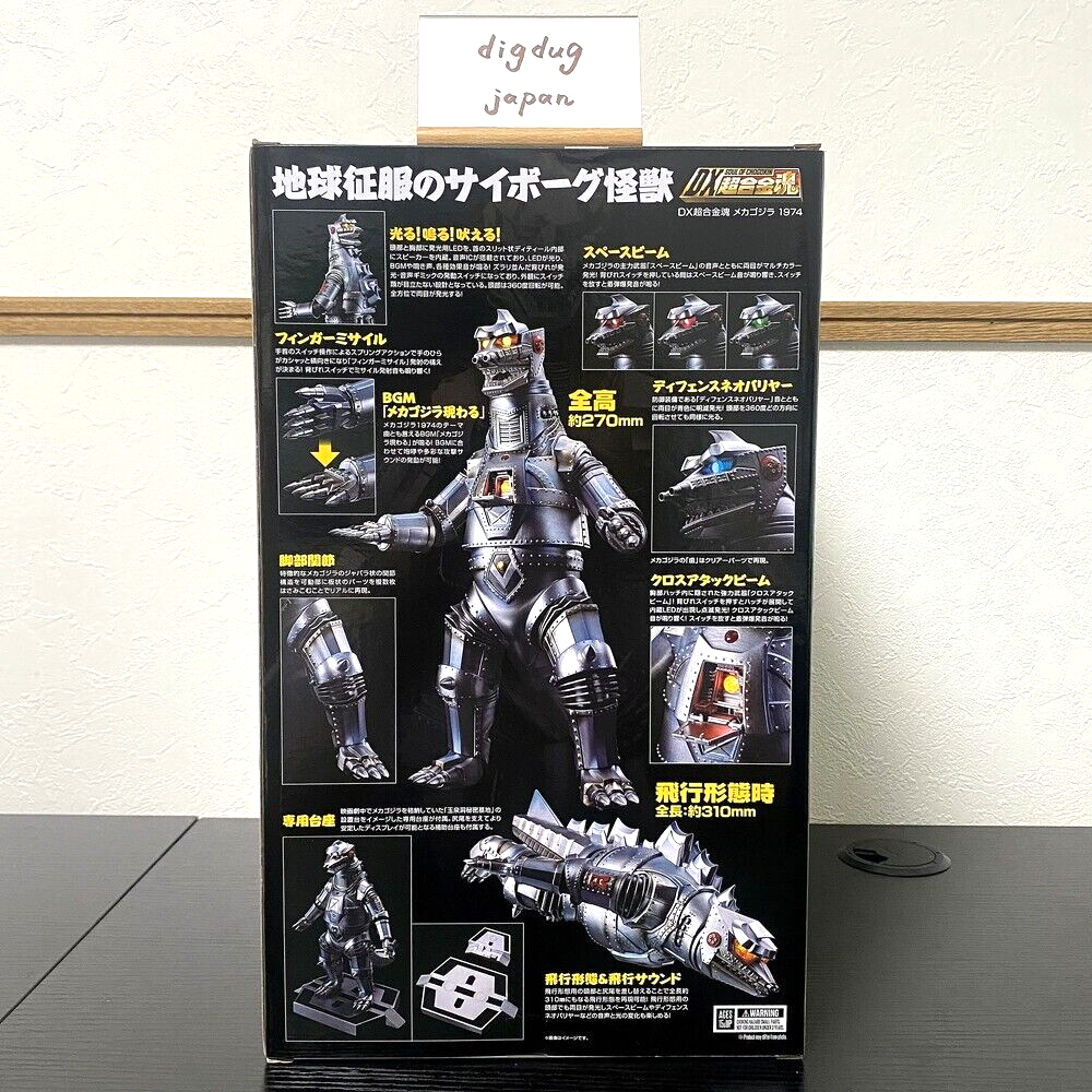 Mechagodzilla 1974 Godzilla vs Mechagodzilla Action Figure DX Soul of Chogokin Description Condition: New You can see the specific actions in this video: https://www.youtube.com/watch?v=ZA7FaLF2Qvo&t=164s It Lights Up! Roars! And Screams! Mechagodzilla, celebrating its 50th anniversary, launches as a DX Chogokin Soul figure! Standing at 270mm tall, the die-cast body is equipped with built-in LED lights and a sound IC. The row of dorsal fins doubles as the activation switch, and when powered on, the iconic appearance sound is accompanied by the glowing eyes and roaring action! Experience the multi-colored glowing "Space Beam" effect from the eyes along with the sound, or the "Cross Attack Beam" sound as the chest hatch opens and its internal LEDs light up! The diverse functions of Mechagodzilla are faithfully recreated with light and sound. Additionally, the flight mode can be recreated by swapping the head and tail parts. This 270mm tall first-generation Mechagodzilla debuts in DX Chogokin Soul form! Featuring built-in LEDs and a sound IC, its BGM, attack sounds, roars, and LED effects are activated by pressing the dorsal fins. It’s the ultimate collectible to celebrate the 50th anniversary of the movie Godzilla vs. Mechagodzilla! Product Specifications Size: Approx. 270mm (10.6") Materials: Die-cast, ABS, POM Set Contents Main figure Flight mode head Flight mode tail Display base set All my products are 100% Authentic. Please feel free to contact us if you have any question. Shipping Please note that for buyers residing in remote areas, an additional 'Remote Area Shipping Fee' may apply. If applicable, this fee is the responsibility of the buyer. Shipping is only available to the address registered in eBay. If you want us to send another address, please change your address on eBay and then place an order. Shipping is available from Monday to Friday. Weekends are not available because freight (shipping) companies are closed. We do not mark merchandise values below value or mark items as "gifts" - Japan, US and International government regulations prohibit such behavior. About Importer's Obligation Import duties, taxes, and charges are not included in the item price or shipping cost. These charges are the buyer's responsibility. Please check with your country's customs office to determine what these additional costs will be prior to bidding or buying. Thank you for your understanding.