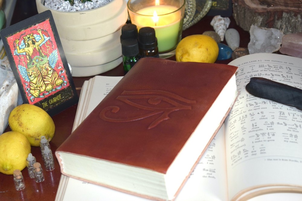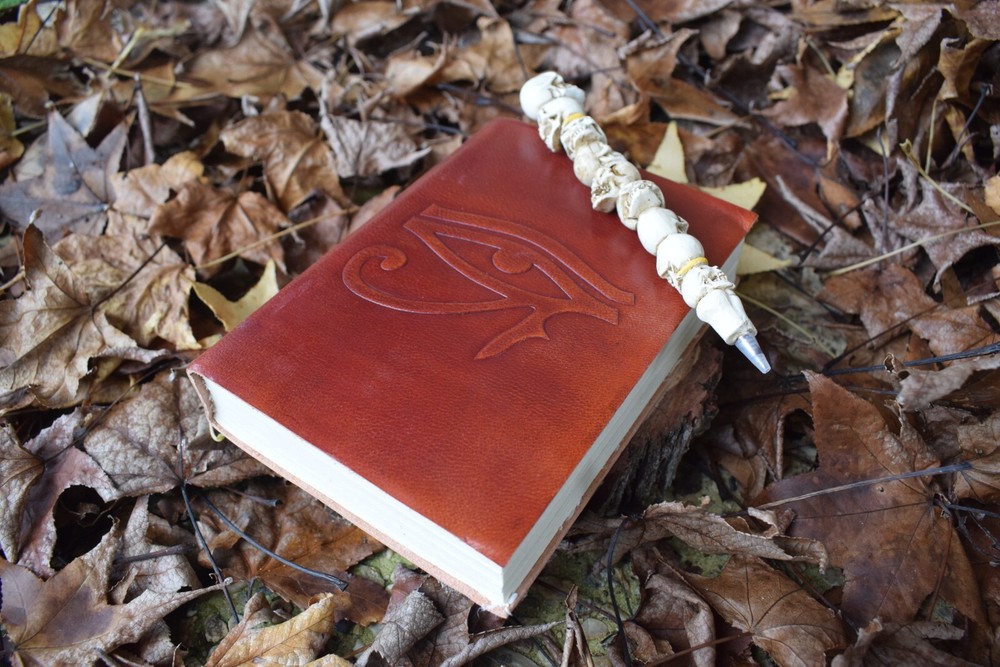 Medium Leather Bound Book of Shadows EYE OF HORUS Journal, Grimoire or Diary What Michael said about this Eye of Horus Book of Shadows: ★★ ★ ★★ " Excellent service. Fast postage and great service " ~ Michael Unlock the power of the ancient Egyptian god Horus with our small leather-bound notebook. The Eye of Horus, symbol of protection and power, is beautifully embossed on the front cover. Inside, you'll find recycled handmade unlined paper pages, perfect for recording your thoughts, spells, and rituals. Each notebook is crafted with care and attention to detail, making it a perfect tool for the spiritual seeker on their journey. This notebook is not only a tool of organisation, but a talisman for manifestation. Elevate your practice to the next level. Your Grimoire Details Size of Grimoire Height: 17cm ( 6 ¾") Width: 12cm (5 ¾") Depth: 3cm (1 ¼") Contains: 1 Leather-bound Grimoire