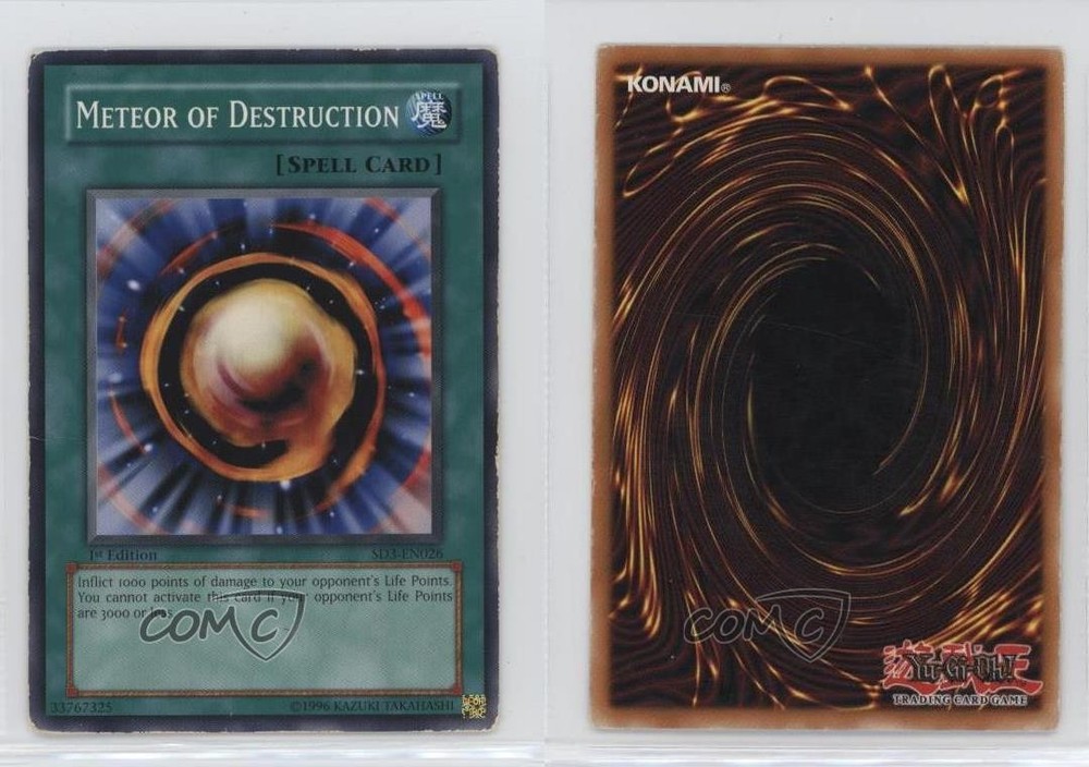 2005 Yu-Gi-Oh! Blaze of Destruction - Structure Deck [Base] - 1st Edition #SD3-EN026 Meteor of Destruction COMC Item: 172152985 - YuGiOh Card - Featuring Meteor of Destruction Search for more: 2005 Yu-Gi-Oh! Blaze of Destruction Search for more: 2005 Yu-Gi-Oh! Blaze of Destruction - Structure Deck [Base] - 1st Edition View all of our Listings Auctions Buy It Now About Us Located in the beautiful Pacific Northwest, COMC (Check Out My Cards) is the world's largest consignment service for trading card singles. More than 10,000 people have used our consignment service to list over 50 million trading cards. Find out how we can help you consign your items on eBay by contacting us through eBay messaging. COMC -- "The Safe & Easy Way to Buy & Sell" Raw Condition for Modern Cards Unless otherwise noted, raw modern cards are listed in Near Mint-Mint condition or better. A NM-MT card appears to be Mint at first glance, but upon closer inspection, may exhibit some of the following: minor print defects (e.g. roller marks, print line, dimple), minor scratches, slight edge wear, and slight corner wear. Centering is clearly visible in the images provided and does not factor into our condition assessment. Raw Condition for Vintage Cards Unless otherwise noted, raw vintage cards are listed in Excellent condition or better. An EX card may exhibit some of the following: minor rounding of corners, surface wear, print defects, light scratches, and slight edge wear/chipping. Centering is clearly visible in the images provided and does not factor into our condition assessment. Domestic Shipping Combined shipping for multiple items is available. To receive combined shipping, please ensure all desired items are in your eBay shopping cart before proceeding to checkout. eBay limits orders to 40 items per order. We automatically combine multiple orders placed on the same day. If you place multiple orders on the same day, please contact us to request a refund of applicable shipping costs. Signature confirmation may be required on invoices over $400. All cards are protected and shipped securely. International Shipping COMC offers eBay's International Shipping (EIS) for international orders under $2,500* (see country exceptions below). All duties and import fees are paid at checkout; in the rare event that there are additional import fees upon delivery, these are borne by the buyer. EIS packages route through a shipping hub in Erlanger, KY before shipping to their final destination. Please note that EIS does not allow for combined shipments. The shipping rates are determined by eBay and cannot be adjusted. *Maximum sale price exceptions: Colombia, Kuwait ($2,000); Taiwan ($1,539); Chile, Costa Rica, Guatemala, Honduras, Trinidad and Tobago ($1,000); Antigua and Barbuda, Aruba, Belize, Dominica, Grenada, Philippines, Saint Kitts and Nevis, Saint Lucia, Montserrat, Turks and Caicos Islands ($500); Dominican Republic, El Salvador ($200). Please request a shipping quote through eBay messaging for orders that exceed the maximum sale price supported by eBay's International Shipping. You will be responsible for all duties and import fees for international orders shipped outside the EIS. All cards are protected and shipped securely. Payment COMC does not accept offers on our cards through our eBay storefront. COMC utilizes eBay’s managed payments system. If you are experiencing difficulties making a payment, please contact eBay for assistance. Return Policy Returns are only accepted on the rare occasion the item is not as described. If you are making a return, please initiate the return process through eBay so a mailing label can be provided for you. Prior to listing, our expert team carefully assessed this item to represent it accurately. Please review the description and high-definition images prior to purchasing to ensure this item meets your satisfaction. We welcome you to contact us if you have further questions about this item. Trust and Integrity COMC carefully assesses each item consigned to us to prevent fraudulent items from entering the marketplace. If you believe an item offered on COMC may be fraudulent, please contact us with details so we can investigate the issue. Items we determine are outside our supported items policy may be removed. Last Modified: 6/8/2025 9:22:37 PM PDT