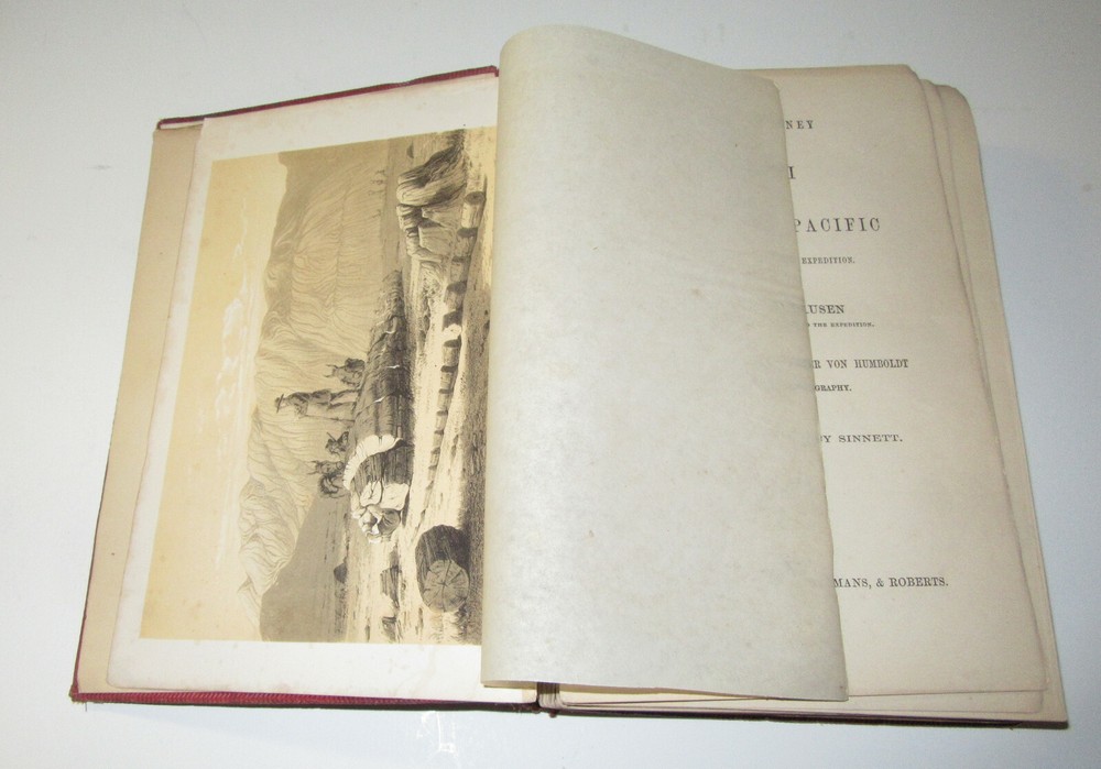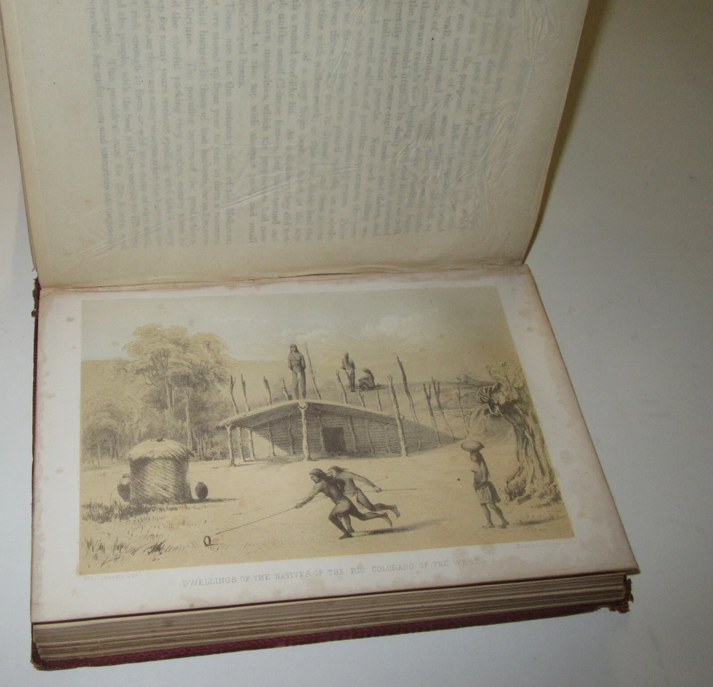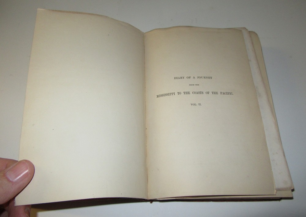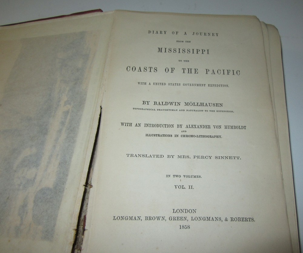 This is a rare original copy of "Diary Of A Journey from The Mississippi to The Coasts of The Pacific With a United States Government Expedition, Volume II MOLLHAUSEN, BALDWIN Diary of a Journey from the Mississippi to the Coasts of the Pacific with a United States Government Expedition. MOLLHAUSEN, Baldwin. Diary of a Journey From the Mississippi to the Coasts of the Pacific With a United States Government Expedition, Vol. II. London: Longman, Brown, Green, Longmans, & Roberts, 1858. Volume II only. Octavo (8.75" x 6"); [xi], 397p. Some toning . Binding separated front, tape outside. Not an ex-library copy. It is well bumped, rubbed and aged. That said the illustrations, text and map are pretty good. There is some foxing and age browning, but it is still quite good for its age. See photos for details and condition. A highly regarded account of the southern route of the Pacific Railroad Survey under the command of A.W. Whipple. Mollhausen had come to the U.S. in 1849 and toured the Rockies in 1851. This work contains striking chromolithographed plates made from his drawings. We are not experts on this book or books in general, feel free to ask questions and we will try and help. br-dssr