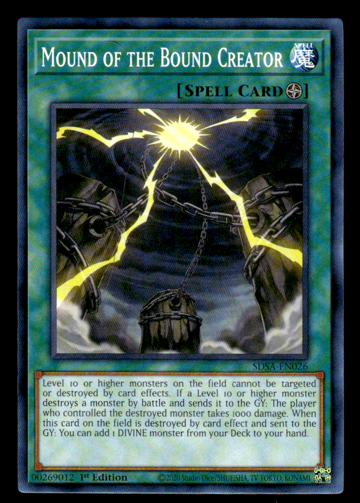 Mound of the Bound Creator - SDSA-EN026 - Common - 1st Edition Image is a stock photo of the card. You will receive the card in Lightly Played condition Condition: Lightly Played ATK/DEF : Attribute : Card Number : SDSA-EN026 Card Rules : Card Text : Level 10 or higher monsters on the field cannot be targeted or destroyed by card effects. If a Level 10 or higher monster destroys a monster by battle and sends it to the GY: The player who controlled the destroyed monster takes 1000 damage. When this card on the field is destroyed by card effect and sent to the GY: You can add 1 DIVINE monster from your Deck to your hand. Card Type : Edition : 1st Level : Monster Type : Name : Mound of the Bound Creator Passcode : 00269012 Pendulum Scale : Rarity : Common Set : Structure Deck: Sacred Beasts Be sure to visit our store for a wide selection of your favorite cards! We are running specials RIGHT NOW!! Shipping Options: ~Ships in a regular white envelope with a stamp for FREE! (THERE IS NO TRACKING INFORMATION AVAILABLE FOR THE ABOVE METHOD. SHIPPING TIME IS 4-10 BUSINESS DAYS) ~Ships in a TRACKEDbubble mailer for $5.99! ~Shipments are handled same or next business day. ~FREE SHIPPING for each additional card, so shop around our store!