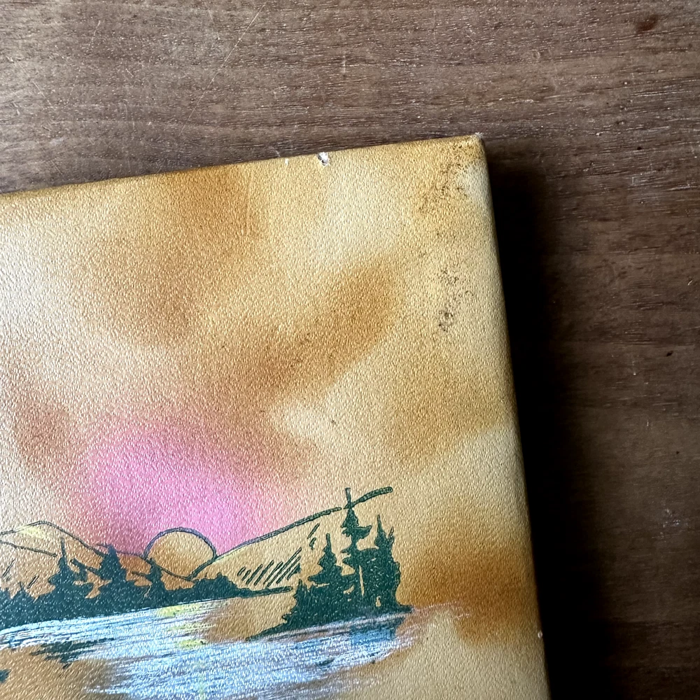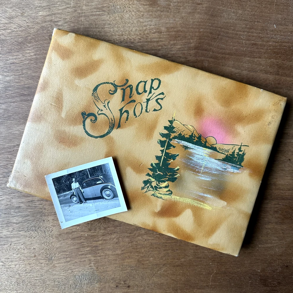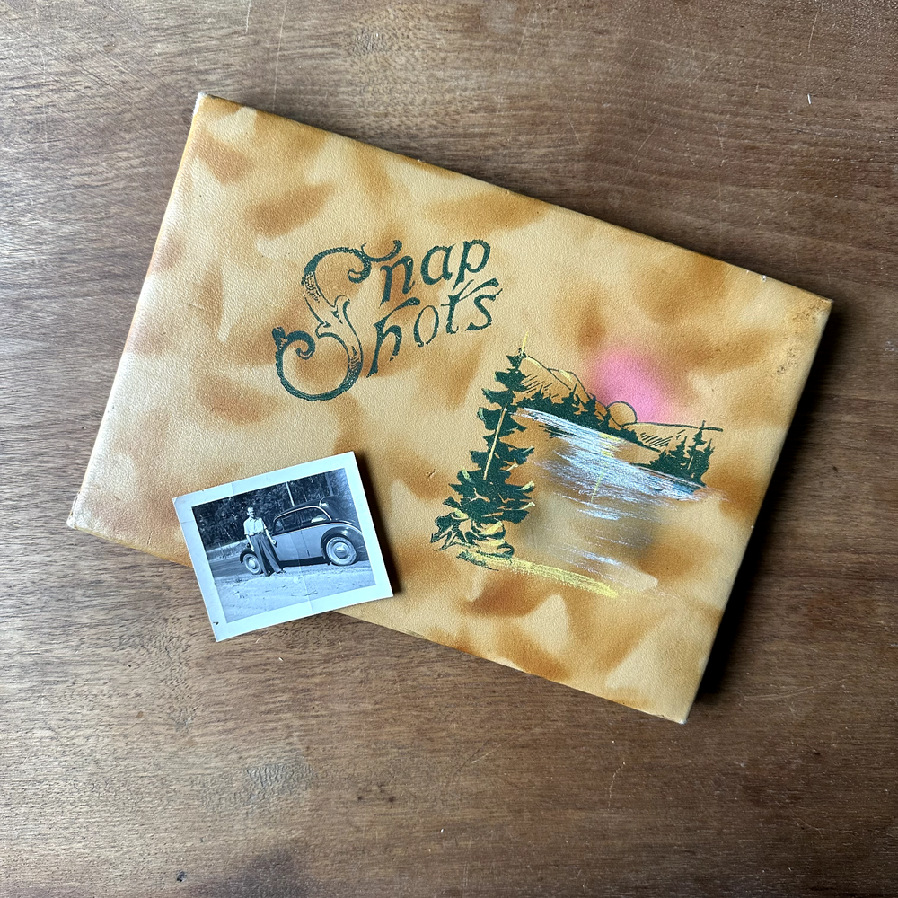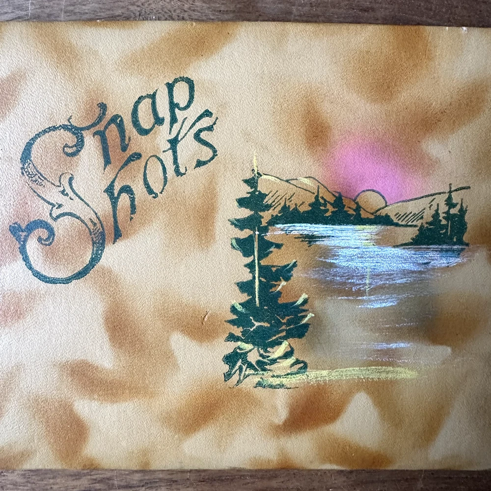 This is a leather style bound Snapshots Album. It has a brown marbled leather style cover with a painted lithograph scene of a mountain lake in shades of green, yellow, white, and pink. The inside is filled with lightweight black cardstock. There is no maker's mark in the album. The album is in good vintage condition for its age and use. The pages are all blank. The covers have some wear, especially to the corners and spine. There is some dark brown smudging to the top right corner of the front cover. The top right edge of the spine is missing the outer cover, exposing the cardboard layer underneath. The pages have faded slightly. The covers are still attached. The album measures 9 inches long by 6.25 inches wide. It is about half an inch thick.