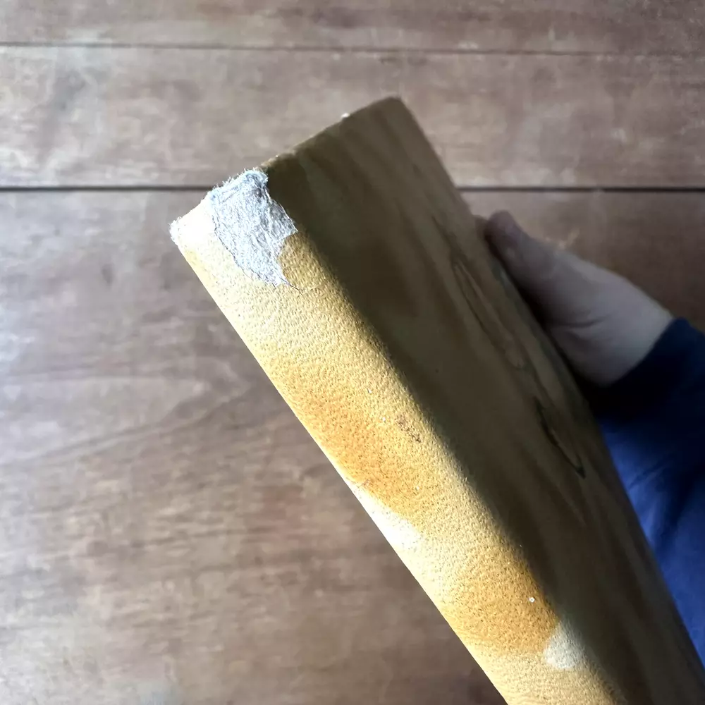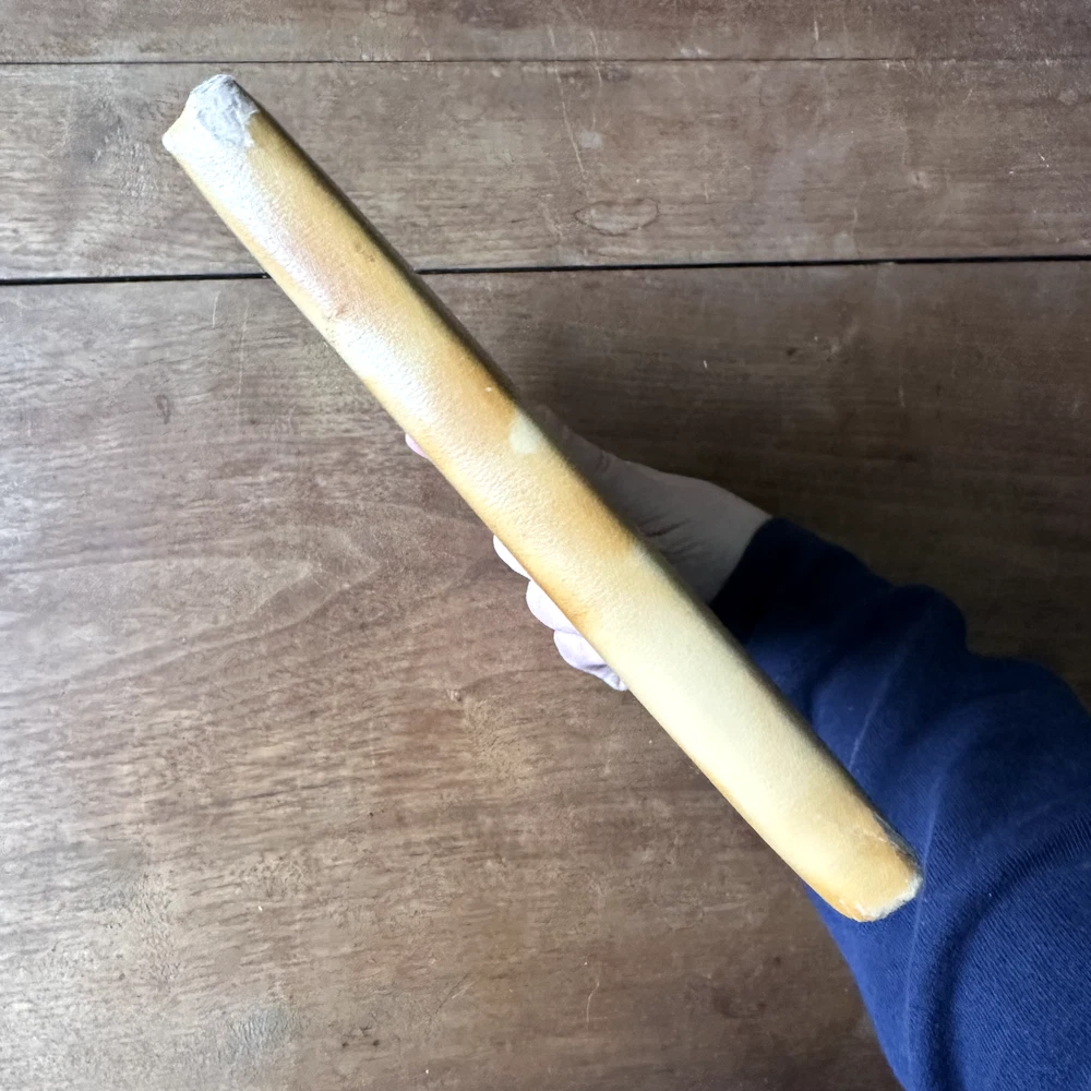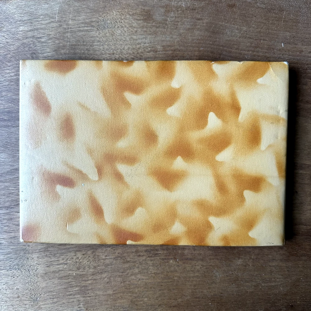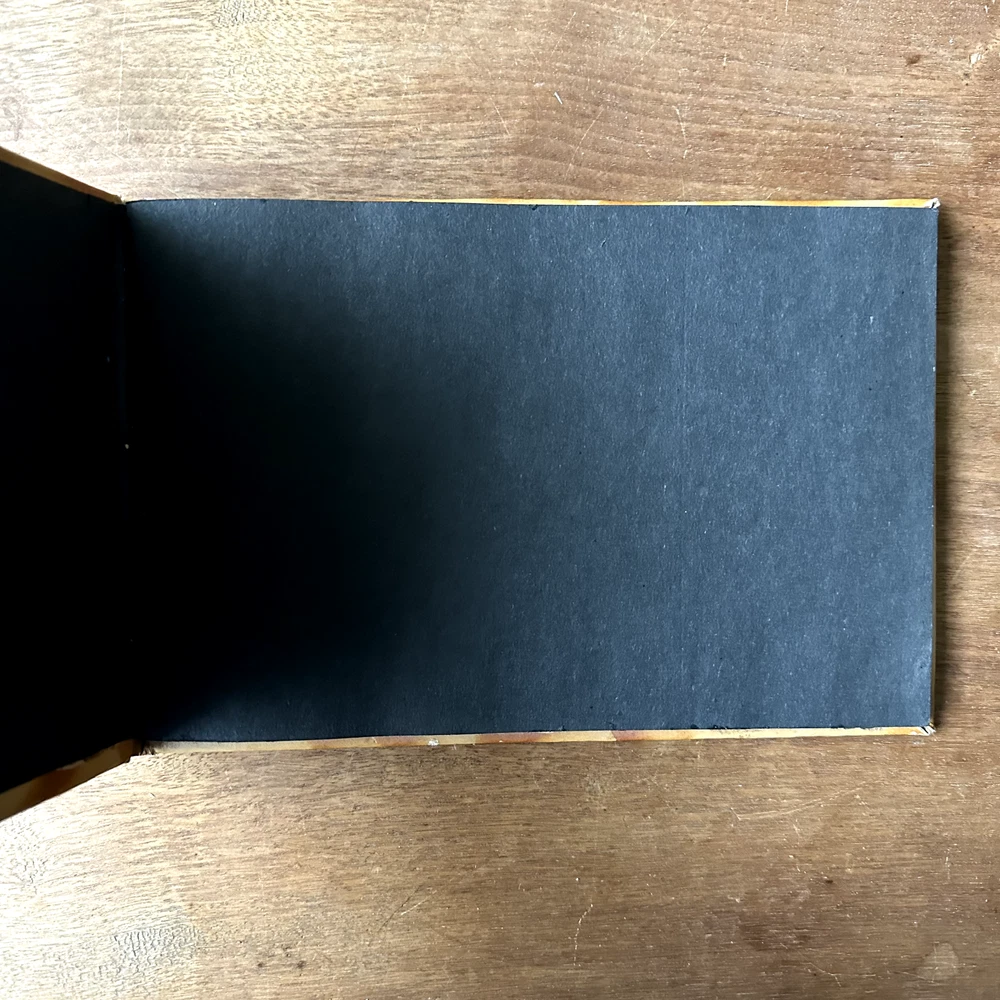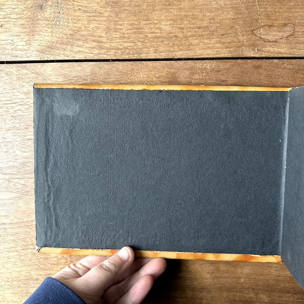 This is a leather style bound Snapshots Album. It has a brown marbled leather style cover with a painted lithograph scene of a mountain lake in shades of green, yellow, white, and pink. The inside is filled with lightweight black cardstock. There is no maker's mark in the album. The album is in good vintage condition for its age and use. The pages are all blank. The covers have some wear, especially to the corners and spine. There is some dark brown smudging to the top right corner of the front cover. The top right edge of the spine is missing the outer cover, exposing the cardboard layer underneath. The pages have faded slightly. The covers are still attached. The album measures 9 inches long by 6.25 inches wide. It is about half an inch thick.
