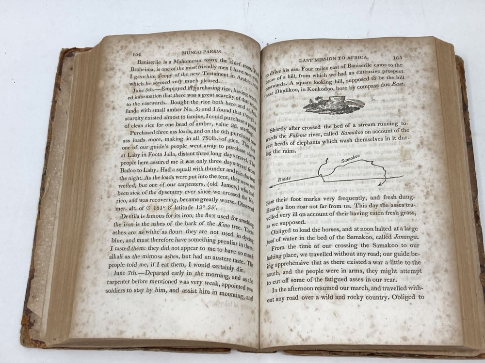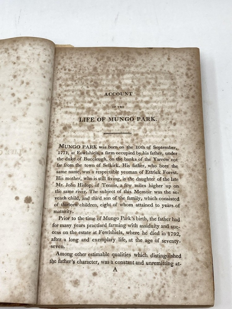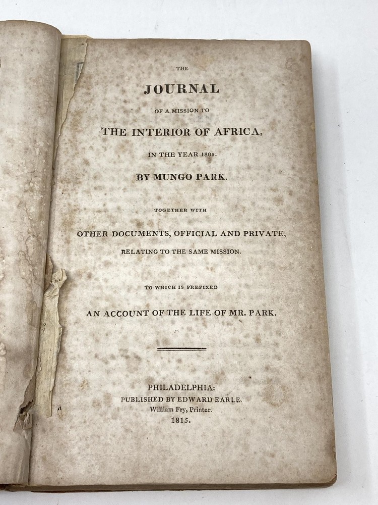 THE JOURNAL OF A MISSION TO THE INTERIOR OF AFRICA IN THE YEAR 1805. TOGETHER WITH OTHER DOCUMENTS, OFFICIAL AND PRIVATE, RELATING TO THE SAME MISSION. TO WHICH IS PREFIXED AN ACCOUNT OF THE LIFE OF MR. PARK Author: Park, Mungo Title: THE JOURNAL OF A MISSION TO THE INTERIOR OF AFRICA IN THE YEAR 1805. TOGETHER WITH OTHER DOCUMENTS, OFFICIAL AND PRIVATE, RELATING TO THE SAME MISSION. TO WHICH IS PREFIXED AN ACCOUNT OF THE LIFE OF MR. PARK Publication: Philadelphia: Edward Earle. 1815 Description: Leather-bound. Old half leather with marbled paper sides (well worn). Hinges cracked. 8vo. 9 in. Considerable foxing throughout, but quite readable. Lacks Map. With Isaaco and Amadi Fatouma's journals as appendices. The journal of Park's second expedition during which his party was attacked and murdered, which may or may not have had something to do with Park's purported propensity to shoot first. NO map. Fair Only. Park was a Scottish explorer of West Africa, who made several important journeys of discovery, in fact was the European "UR" explorer for this region: "His dispassionate — if not scientific or objective — descriptions set a standard for future travel writers to follow and gave Europeans a glimpse of Africa's humanity and complexity. Park introduced them to a vast continent unexplored by Europeans. ...Mungo Park was its first successful explorer, he set a standard for all who followed. After his death, European public and political interest in Africa began to increase. Perhaps the most lasting effect of Park's travels, though, was the influence on European colonial ambitions during the 19th century." (Frank Kryza, "The Race for Timbuktu: In Search of Africa’s City of Gold", 2006, Harper Collins). Seller ID: 82868 Aardvark Rare Books Eugene, OR We work hard to make your Bookbuying Experience safe, easy and fun. Aardvark Books is a proud member of the ABAA (Antiquarian Booksellers Association of America) and IOBA, Independent Online Booksellers Association. Ezra is also an accredited and Qualified Appraiser of Books and Manuscripts, with a designation from the ASA (American Society of Appraisers), with considerable Archive experience as well. Shipping All books shipped to US destinations are sent via the US Postal Service. Faster shipping is available, please ask before paying. We will combine shipping on items purchased at the same time in order to help reduce costs. International shipping is also available. Please inquire for a shipping quote before ordering. This listing was created by Bibliopolis.