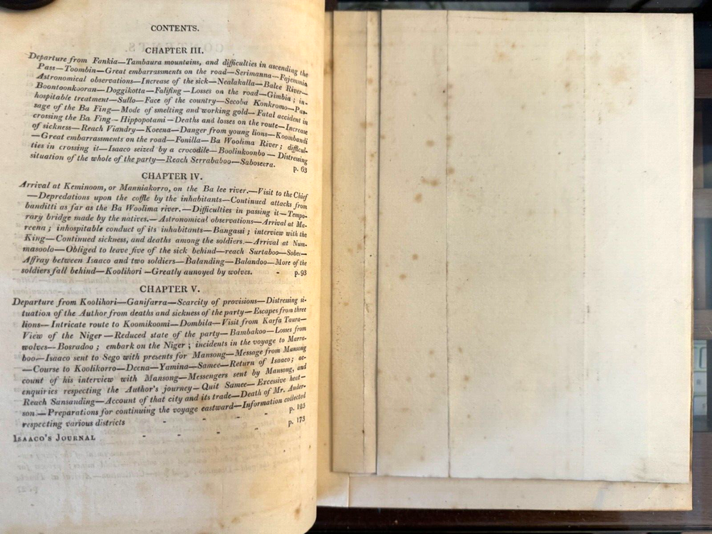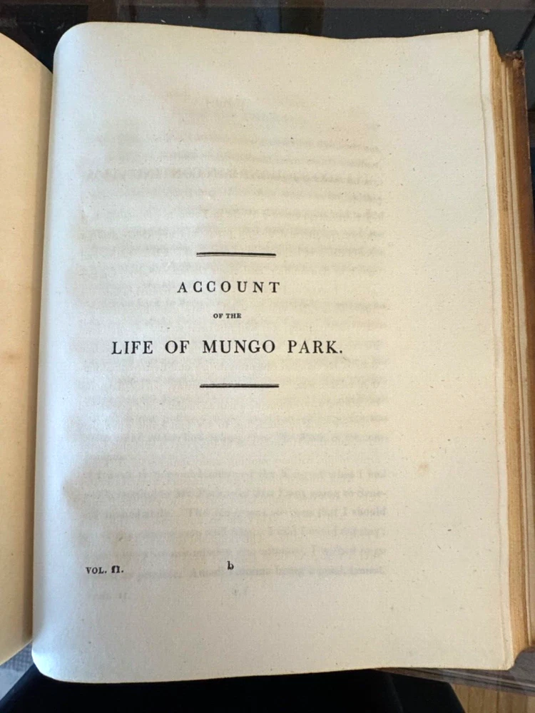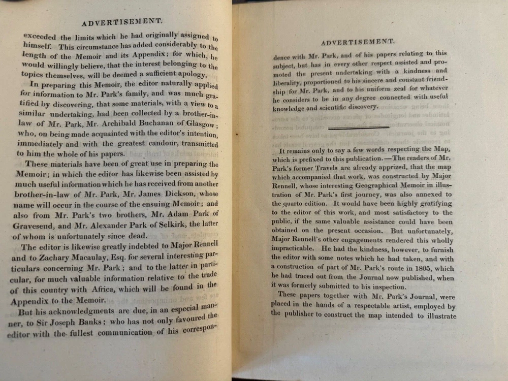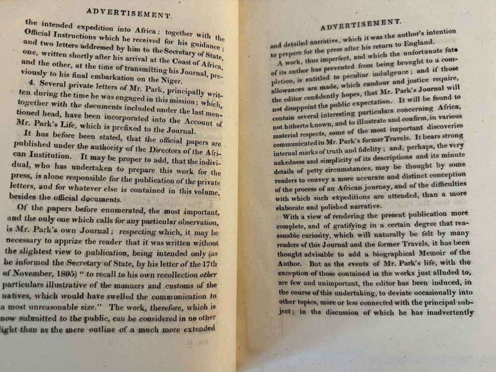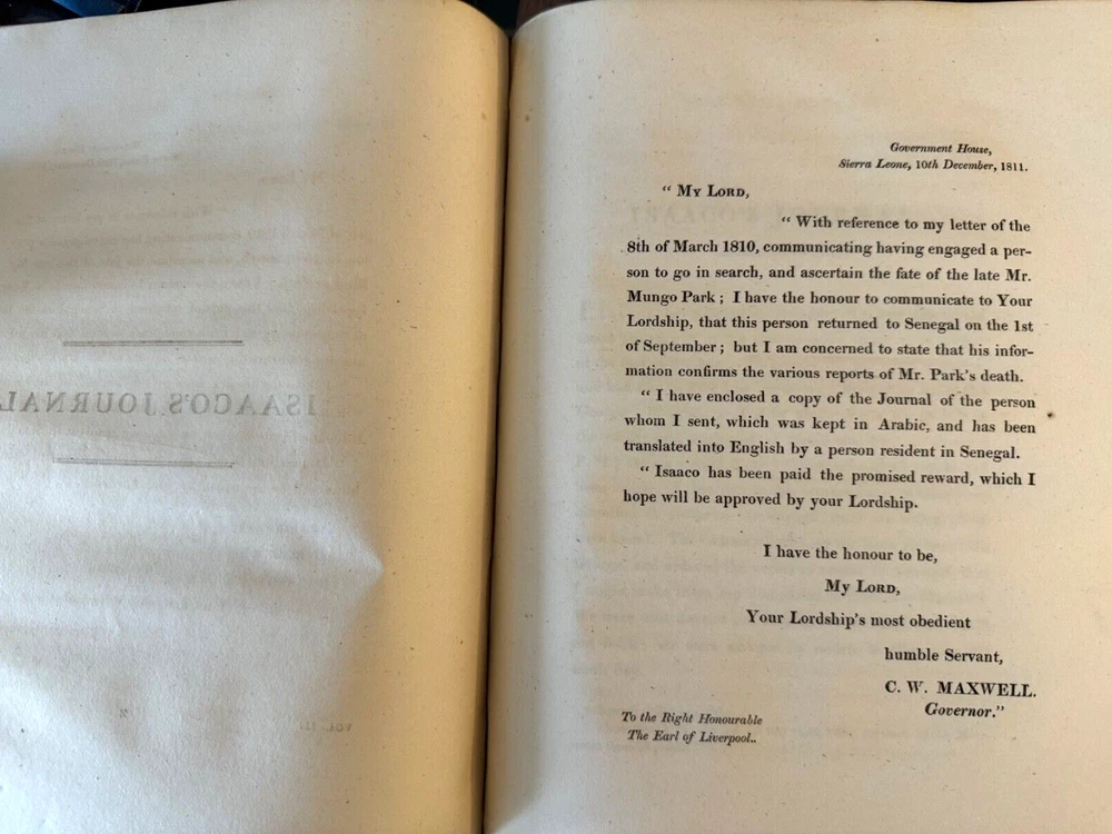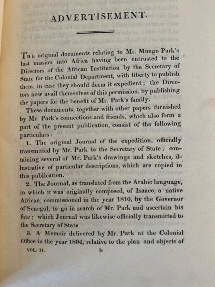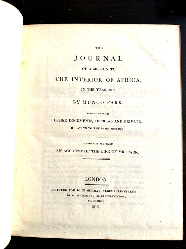 This is a journal of Mungo Park's travels in West Africa published in 1815 together with "other documents, official and private, relating to the same mission." The volume also contains an account of the life of Park and the journal written by Isaac, an African, originally in Arabic. Isaac was commissioned in 1810 by the Governor of Senegal to search for Mungo Park who died on his last journey. See the photo in this listing of the "Advertisement" for details. See seller's other Mungo Park vols. The 1799 edition is a companion to this one.