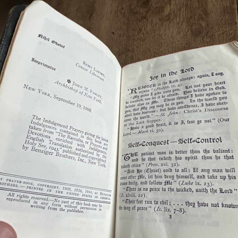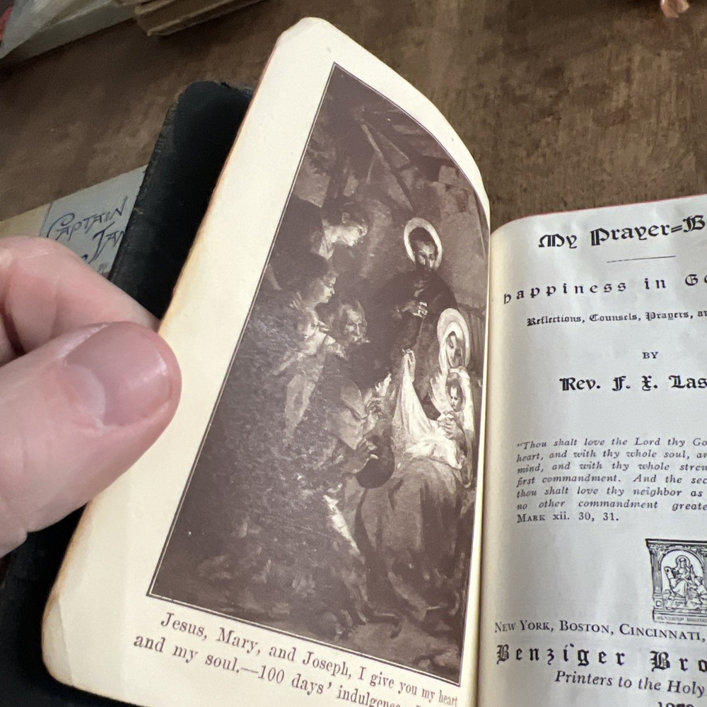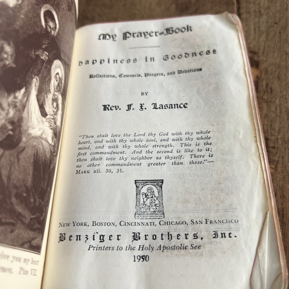 You are bidding on a My Prayer-Book "Happiness in Goodness" - Father Lasance - 1950, Leather Bound. It has a lot of wear from age and use. The cover is attached but loose. the pages are in good shape. See pictures for best details. The item you are buying is the picture listed unless stated otherwise. Please contact me if you have questions. I want to keep my great positive rating. I will gladly work with you if there is a problem. I will always combine shipping for more than one purchase, so wait for an invoice for more than 1 purchase. Please check out my other items in my store. I mail out items 2 -3 times per week. Please pay within three days. Go to my store for other vintage collectibles Vtg Christmas | eBay Stores eBay is a hobby of mine. I enjoy searching for that unexpected item. Most of the things I purchase, I get from estate sales.