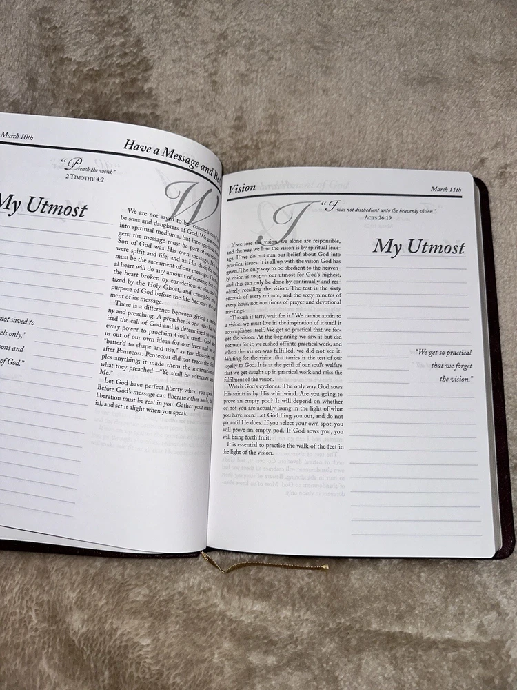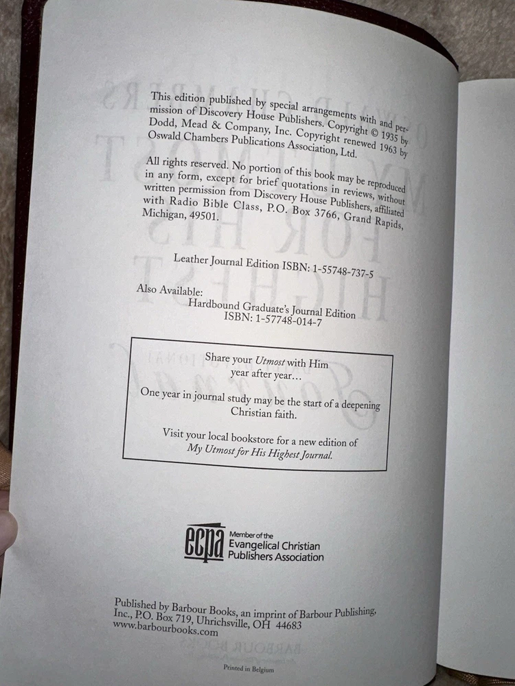 Hello! Welcome to Doodlebug’s Deals! I do my best to accurately describe each item. There are times that I may miss something. I assure you that it is not intentional. If you have any questions, please message me. If you have problems after purchase, please contact me immediately before leaving neutral or negative feedback. Items come from a non-smoking home but are sourced from outside my home. I will mention any odors if noticeable. I want you to be happy with your purchase. Don’t forget to check out the other items in my store! Thank you for your time and consideration. Item Details: Title: My Utmost for His Highest Journal Author: Oswald Chambers Features: Daily Devotional Journal, Barbour books, Measurements: 9.5" x 7" x 1" Condition: Pre-owned. The book has not been written in. The top corner of cover is damaged, otherwise the book seems new inside. Please see photos as part of description. Thanks! Shipping: Shipping is based upon weight. I do not mark up shipping. If you would like to combine shipping please wait to pay until you receive one invoice with all items listed.