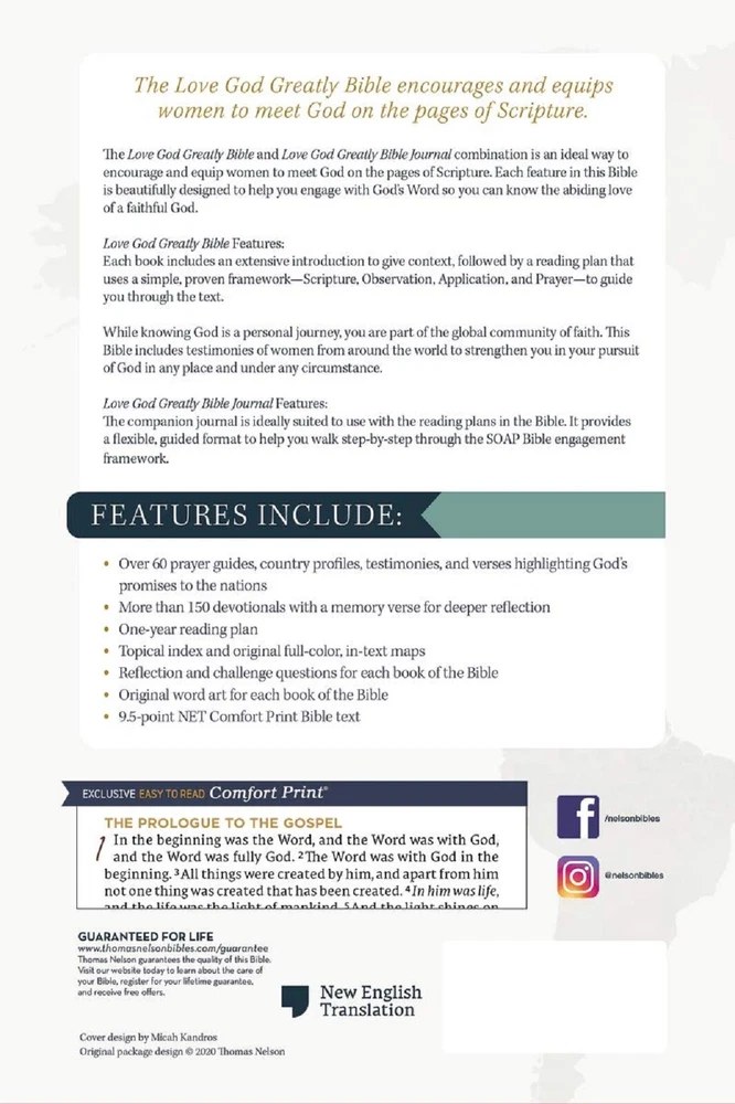 BRAND NEW IN SHRINK WRAP!!! NET Love God Greatly Bible and Journal, 2 Books Publisher's Description NET Bible with a companion journal for reflection The NET Love God Greatly Bible unveils the beauty of God on the pages of Scripture so that women can be encouraged to pour their hearts out to our faithful God. Designed with features to help you engage with God's Word, such as: extensive introductions to give context, a reading plan that uses a simple framework- Scripture, Observation, Application, and Prayer -to guide you through the text, reflection and challenge questions are provided to go deeper on particular passages, and wide margins are provided for taking notes. This Bible includes testimonies of women from around the world to connect and strengthen you in your pursuit of God in any place and circumstance. The NET Love God Greatly Bible will place you into a loving community of believers as you grasp the beauty of God's love through His Word. Features: Thomas Nelson's exclusive NET Comfort Print. typeface Over 60 country profiles with nation-specific prayer guides, plus verses highlighting God's promises to the nations Powerful testimonies from women around the world whose lives have been changed through engaging with Scripture More than 150 devotionals and memory verse list for deeper reflection 50 reading plans One-year reading plan Topical index, and original full-color, in-text maps Reflection and challenge questions included in each book of the Bible Original word art for each book of the Bible Two satin ribbon markers 9.5-point print size Product Information Title: NET Love God Greatly Bible and Journal, 2 Books Format: Other, N/A Number of Pages: 2464 Vendor: Thomas Nelson Publication Date: 2020 Dimensions: 9.3 X 6.3 (inches) Weight: 5 pounds 4 ounces ISBN: 0785239189 ISBN-13: 9780785239185 Text Color: Black Letter Text Size: 9.5 Point Thumb Index: No Ribbon Marker: Yes