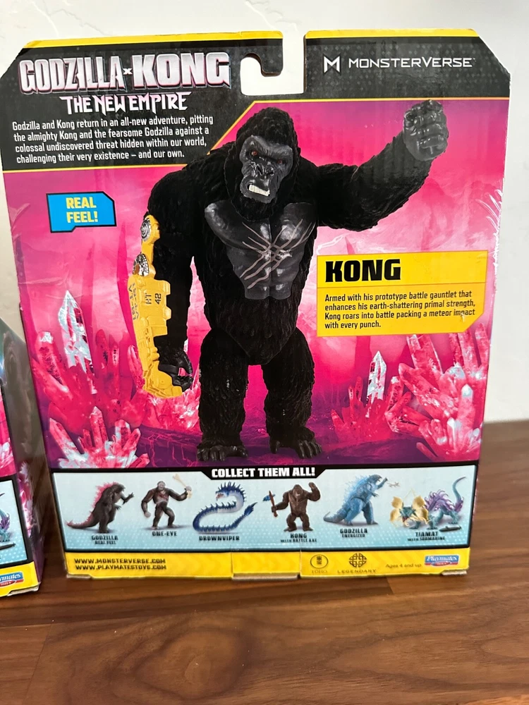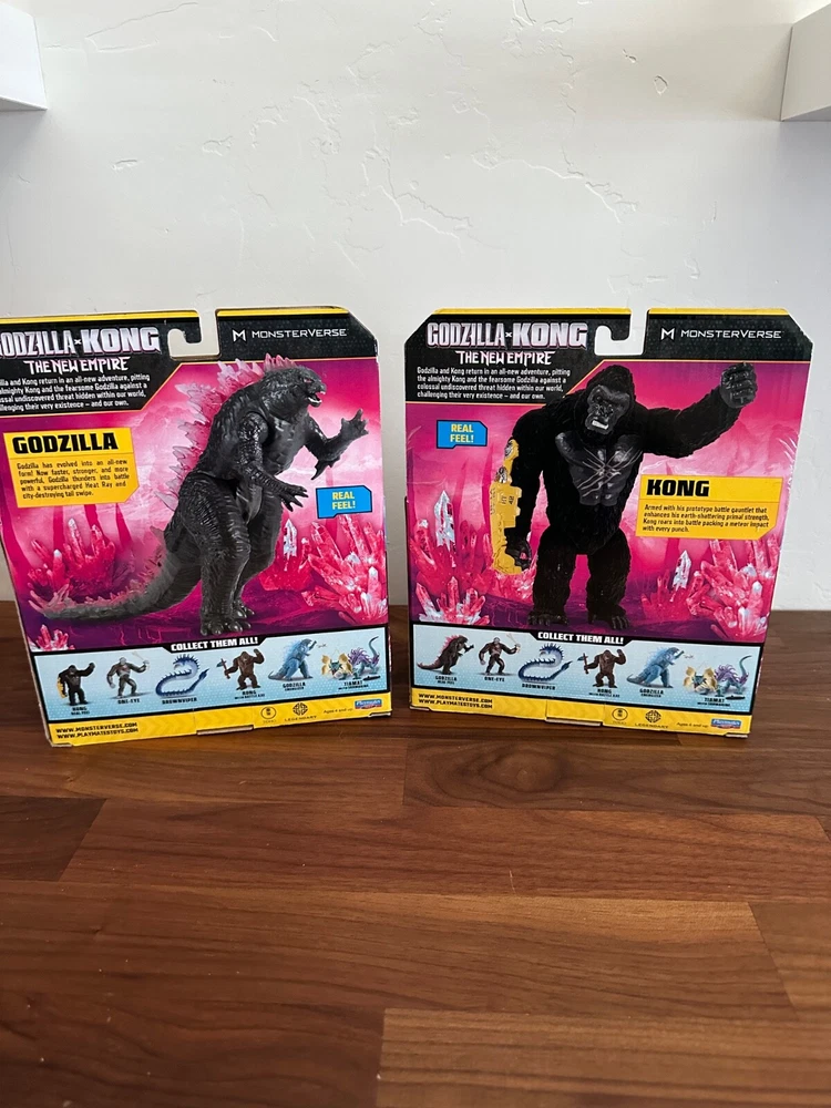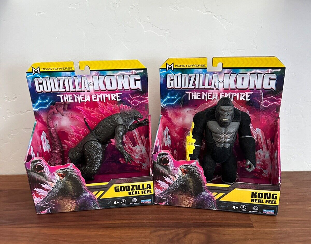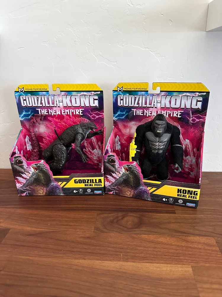 This is a brand new bundle of REAL FEEL Godzilla and Kong figures from Playmates, released in 2025. The set includes two figures, one of which is a detailed representation of the iconic monsters from the Godzilla franchise. These figures were manufactured in China and are part of the Godzilla theme. Godzilla X Kong The New Empire. Godzilla REAL FEEL. Kong REAL FEEL. They have a distinct feel to them that seem real! The Kong is fuzzy feeling, and the Godzilla has a more smooth feel to it.