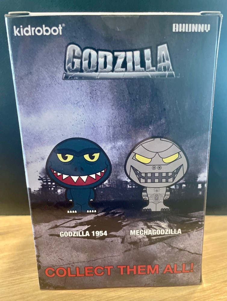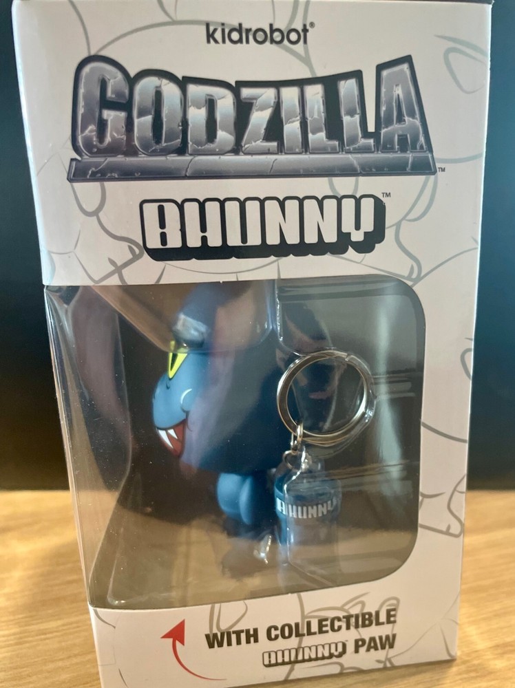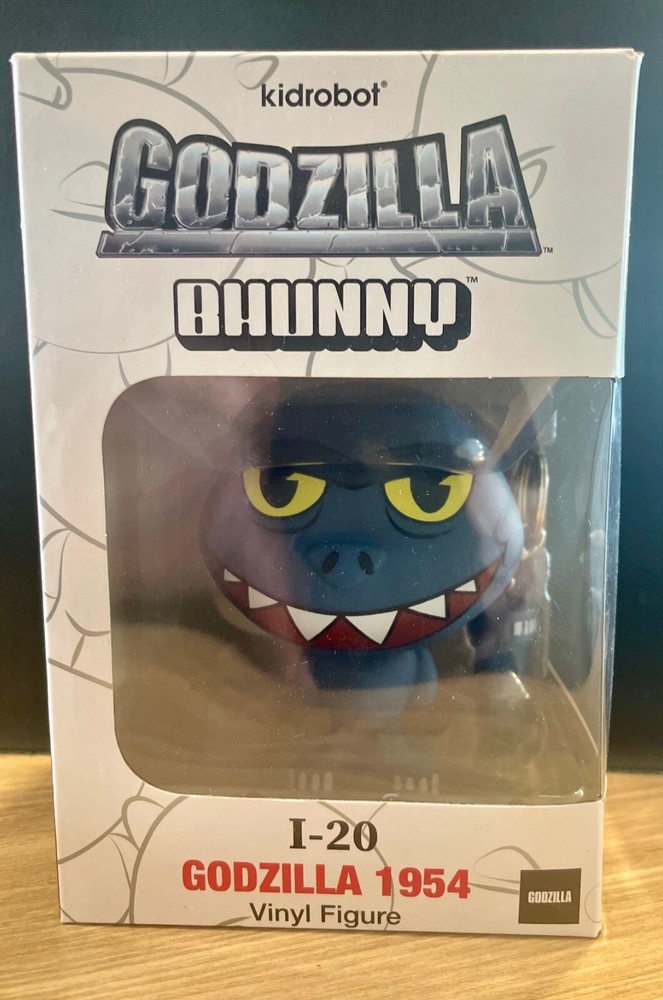 The product is a Kidrobot Bhunny I-20 Godzilla 1954 vinyl figure featuring the iconic character Godzilla from the Godzilla franchise. This collectible figure comes with a Bhunny Paw keychain as an accessory. Made of vinyl, this figure represents the Godzilla character as it appeared in the year 1954, capturing its classic design and features. The product appeals to fans of Godzilla and collectors of action figures, offering a unique and detailed representation of the popular monster.
